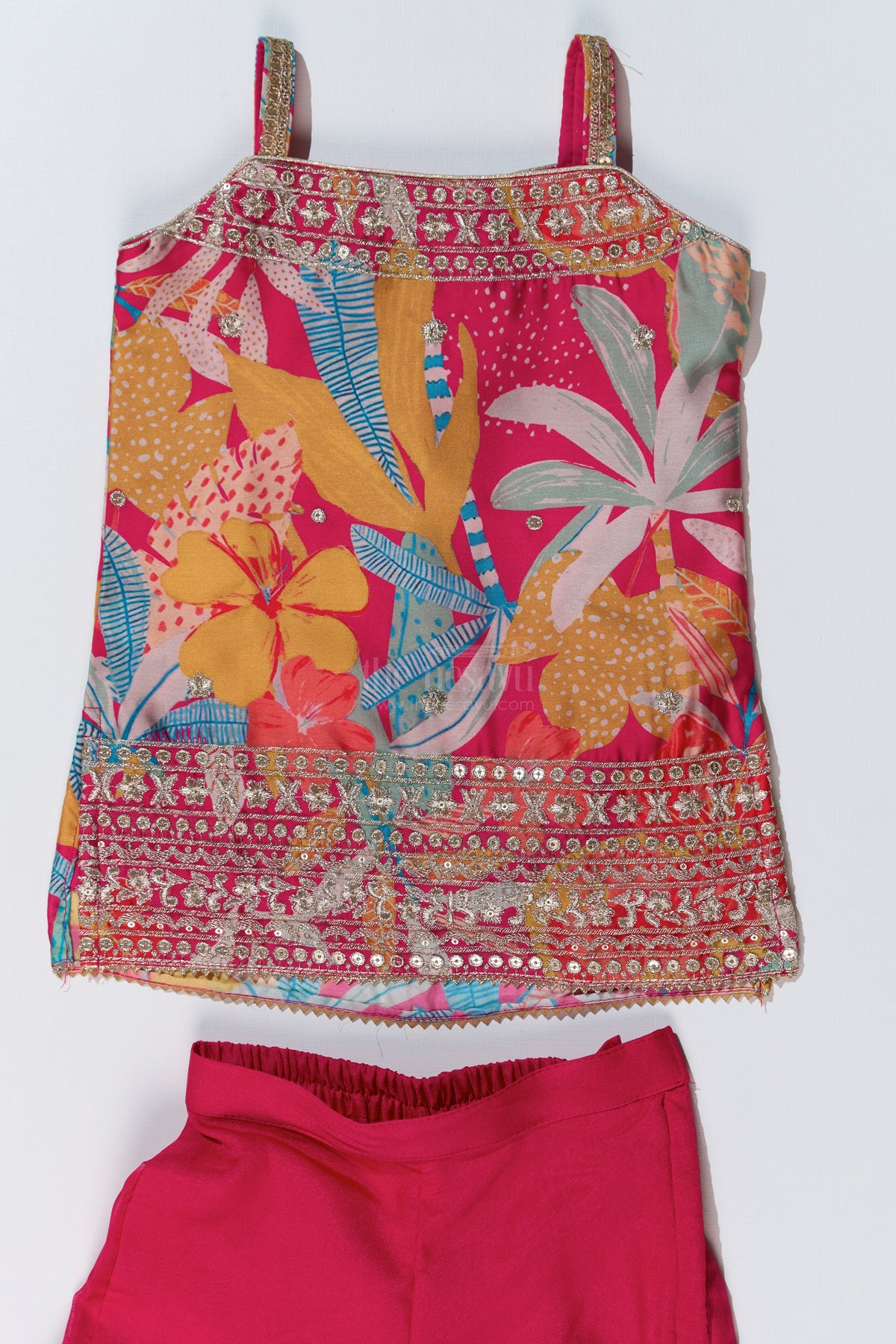 This trendy pink plazo with kurti set for girls is a perfect fusion of modern and traditional styles. The sleeveless kurti is crafted from vibrant chinon digital print fabric, featuring bold floral patterns and delicate mirror work along the neckline for a festive touch. Paired with a stylish flared plazo, this outfit ensures a graceful flow and maximum comfort. A matching dupatta with a subtle border adds an extra layer of elegance. Ideal for celebrations, weddings, and festive occasions, this lightweight ensemble keeps your little one stylish while allowing effortless movement.