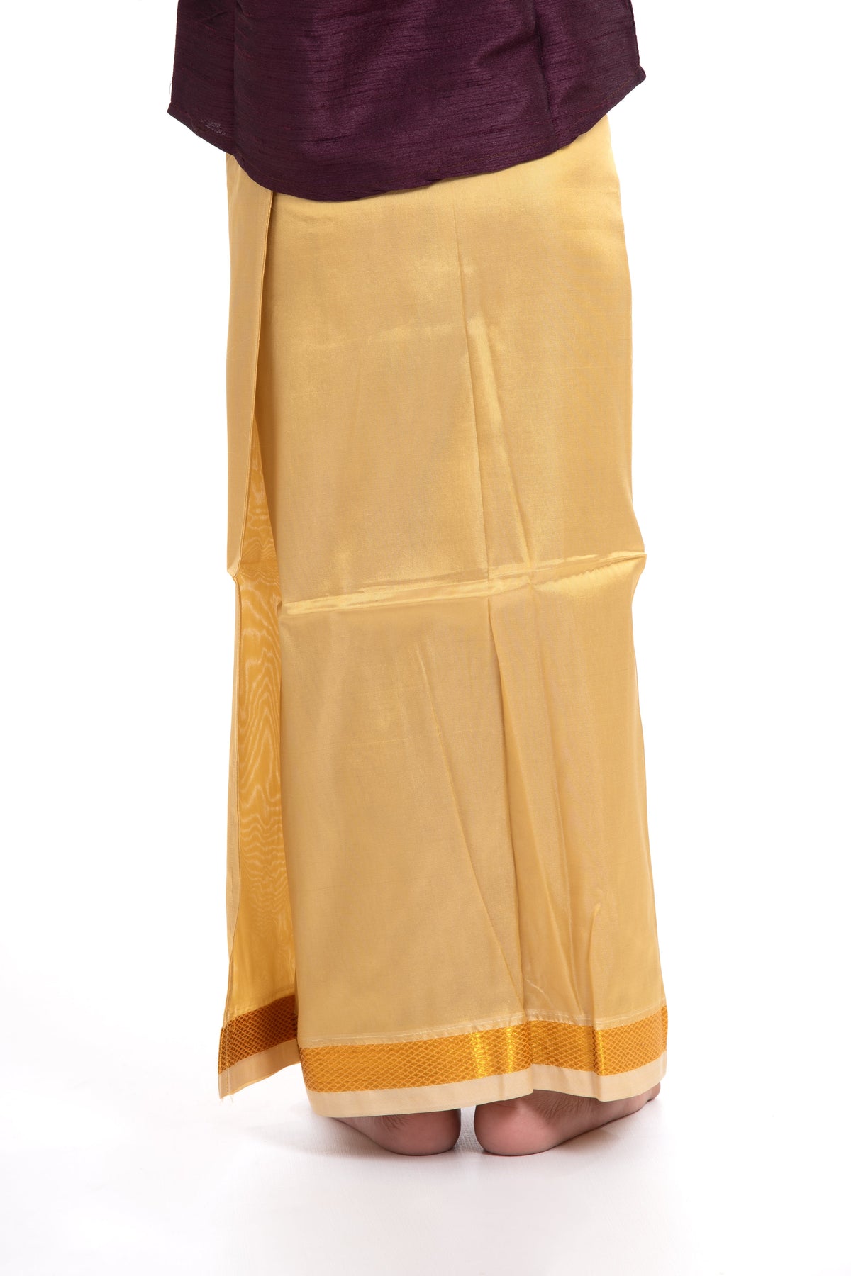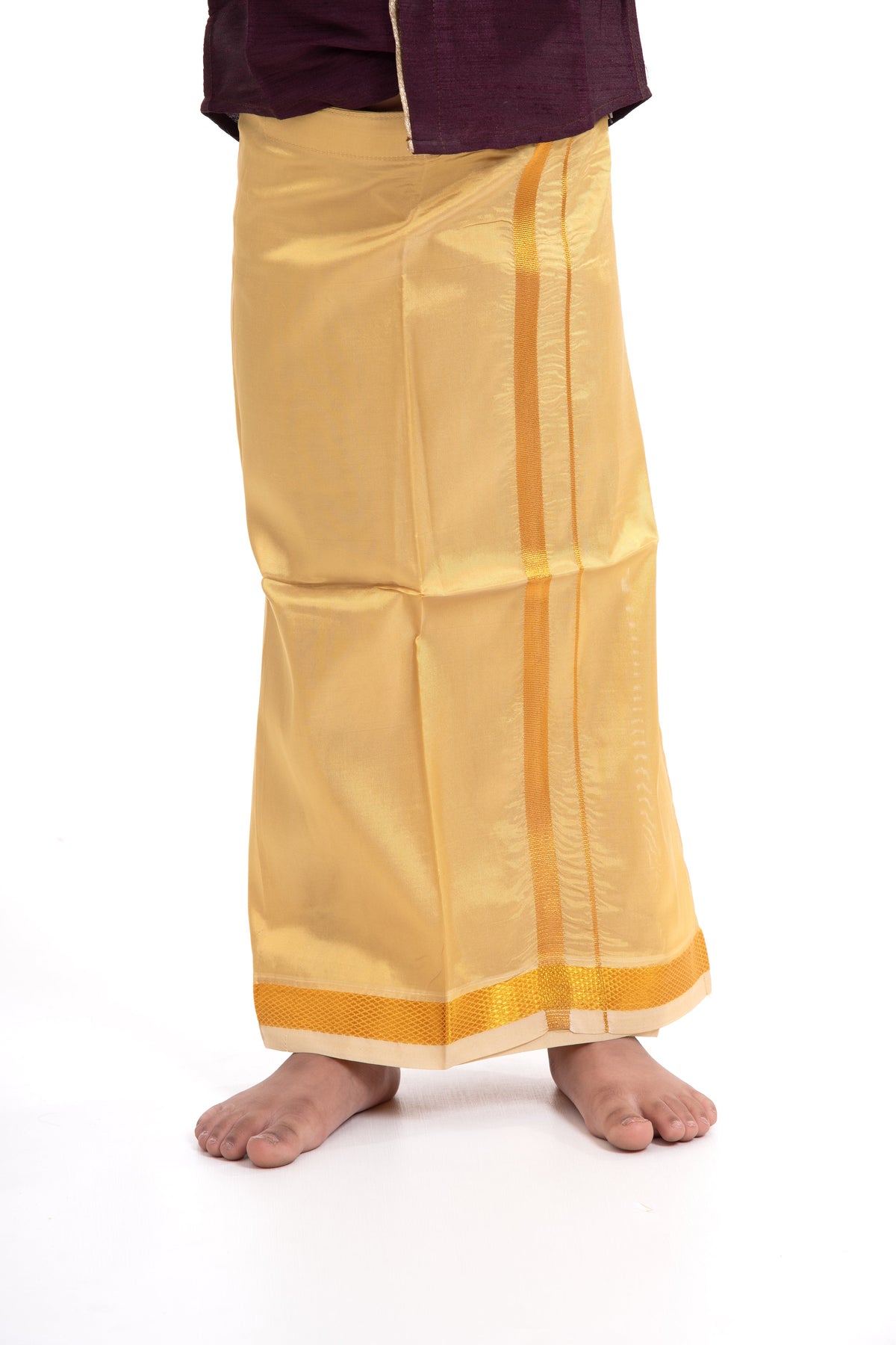 Boys Traditional Golden-Yellow Silk Dhoti with Elegant Stripes