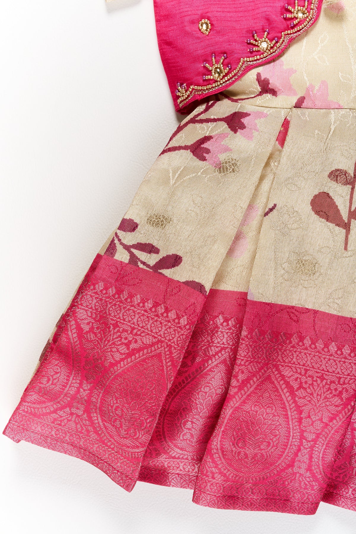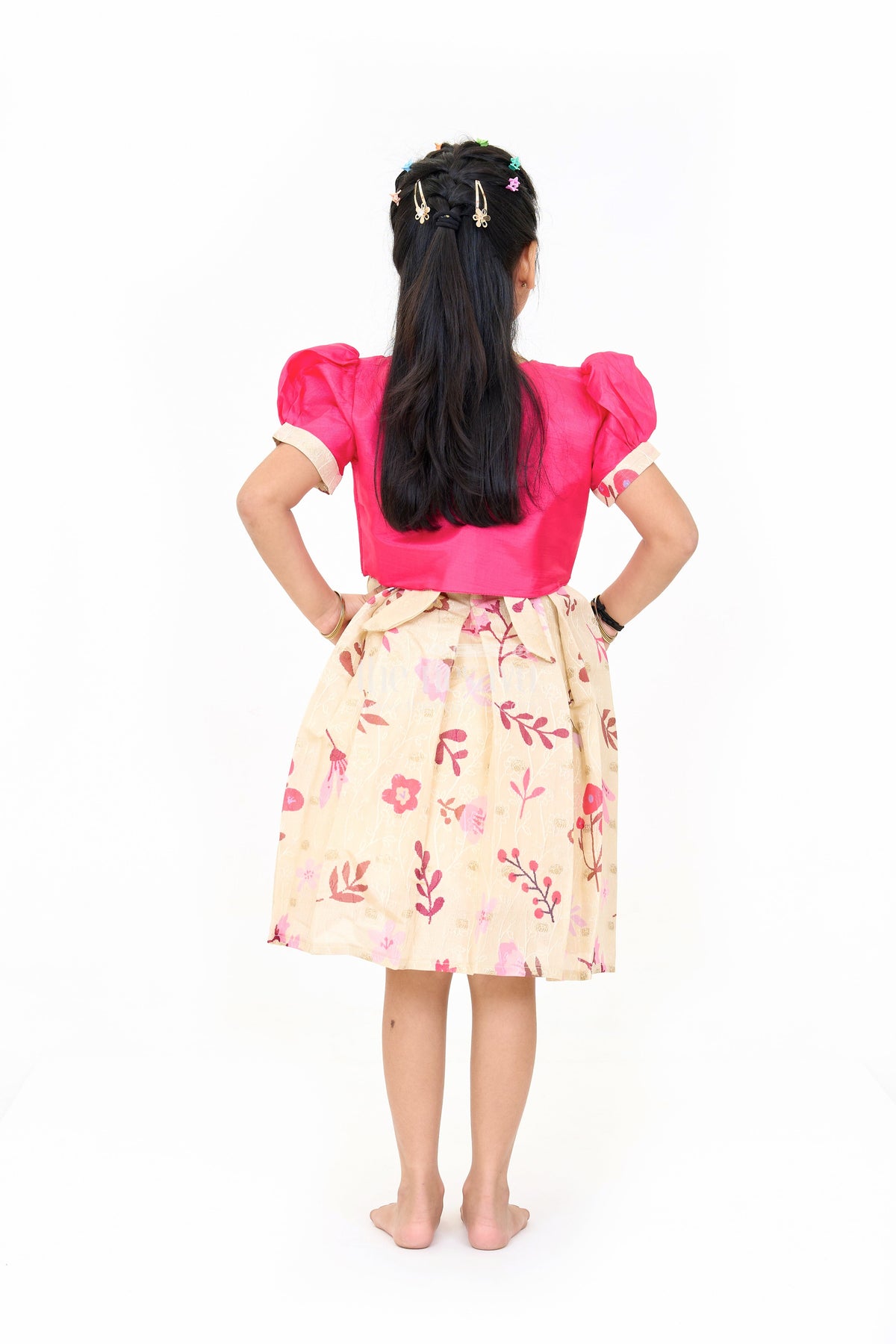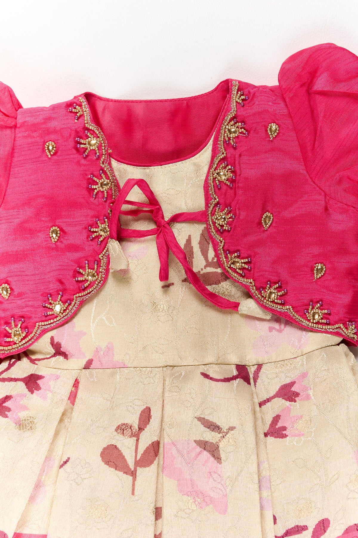 This elegant gown of silk for girls combines timeless charm and modern style. Featuring a luxurious silk party frock with puff sleeves and a floral-patterned pleated skirt, this outfit is perfect for festive occasions and celebrations. The frock is paired with a matching embroidered jacket adorned with intricate beadwork, adding a touch of sophistication. Made from premium blend silk, the outfit is lightweight, comfortable, and perfect for weddings, parties, or family gatherings. Let your little one shine with this beautifully designed ensemble that blends comfort and style seamlessly.
