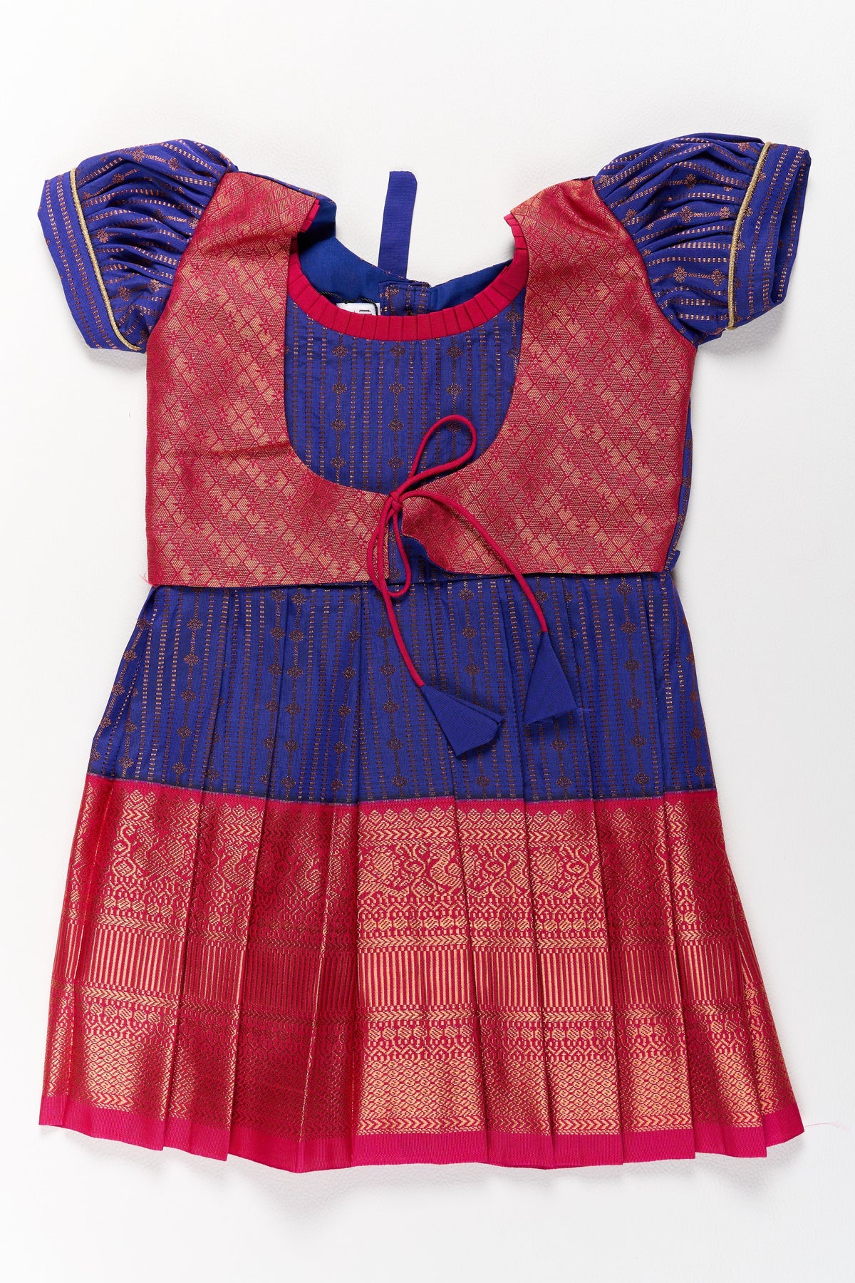 Inspired by the elegance of traditional sarees, this pattu saree frock is a unique and stylish ethnic outfit for your little girl. Crafted from luxurious silk, the rich purple and pink color combination exudes grace and festivity. The zari-bordered pleated skirt mimics the drape of a saree, while the tie-up back adds a classic touch. The short puff sleeves enhance the overall traditional appeal, making this dress perfect for weddings, temple visits, and special occasions. Complete the look with ethnic footwear and gold jewelry for a charming cultural ensemble.