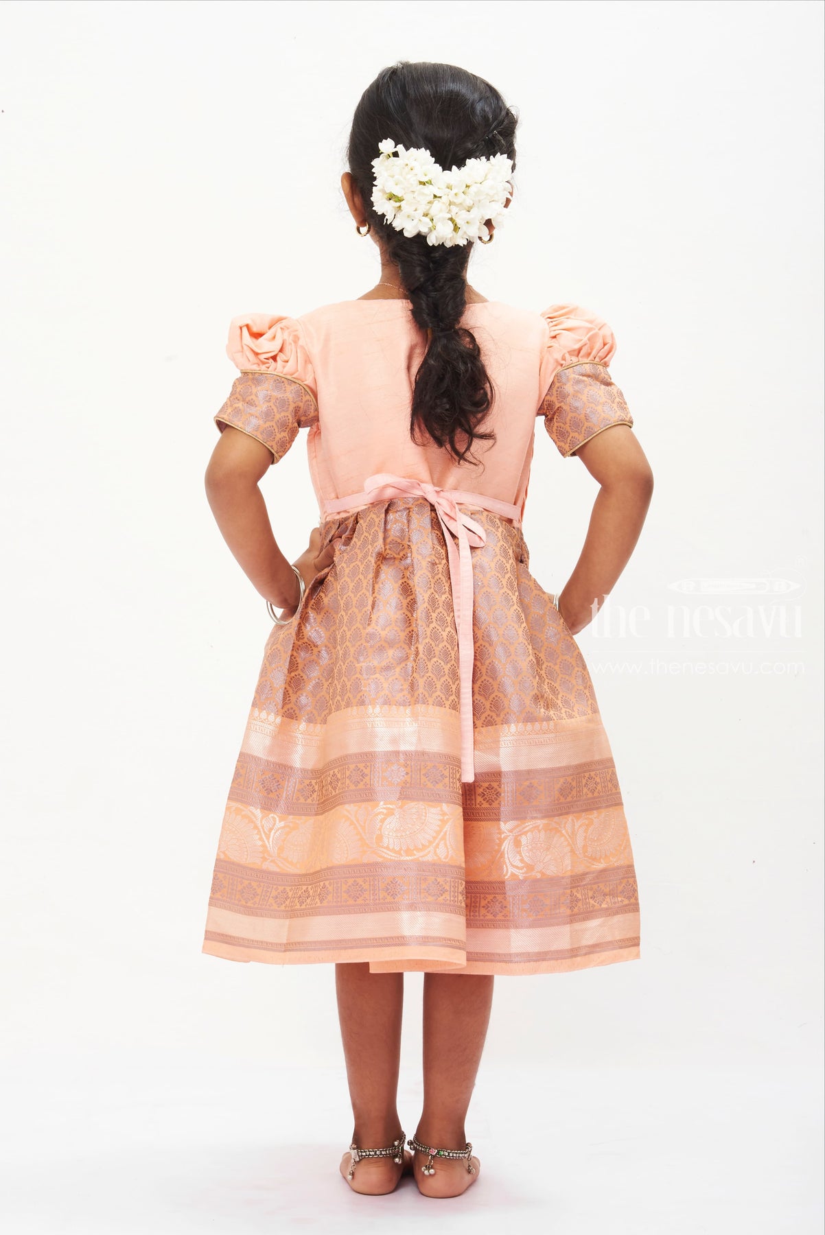 Experience the timeless elegance of the Nesavu Peach Blossom Silk Frock with Traditional Banarasi Border for Girls, a charming ensemble that captures the essence of tradition and grace.