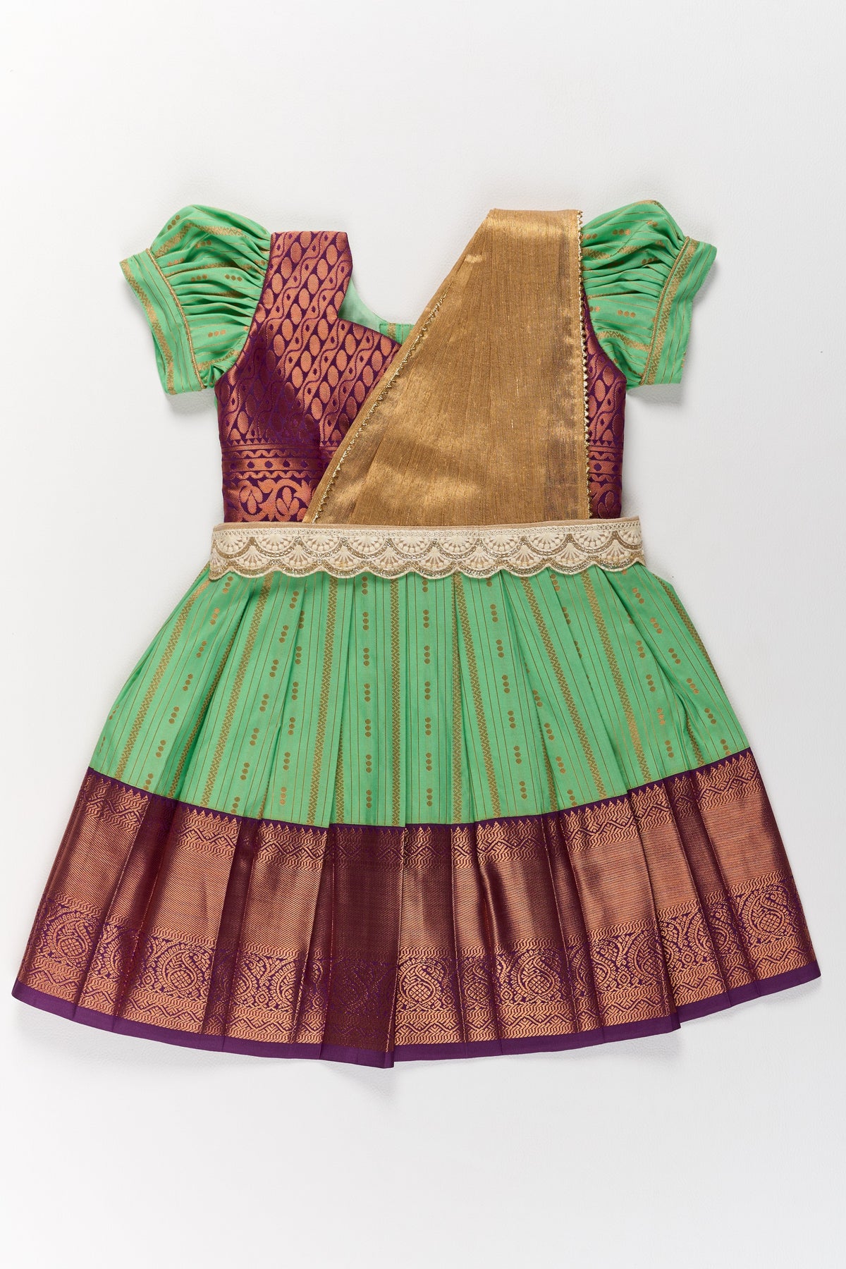 The Nesavu Girls Kanchi Silk Frock Traditional Green and Maroon Pattu Pavadai for Girls with Golden Zari Borders Nesavu Nesavu Traditional Green Maroon Pattu Pavadai Girls Golden Zari Borders