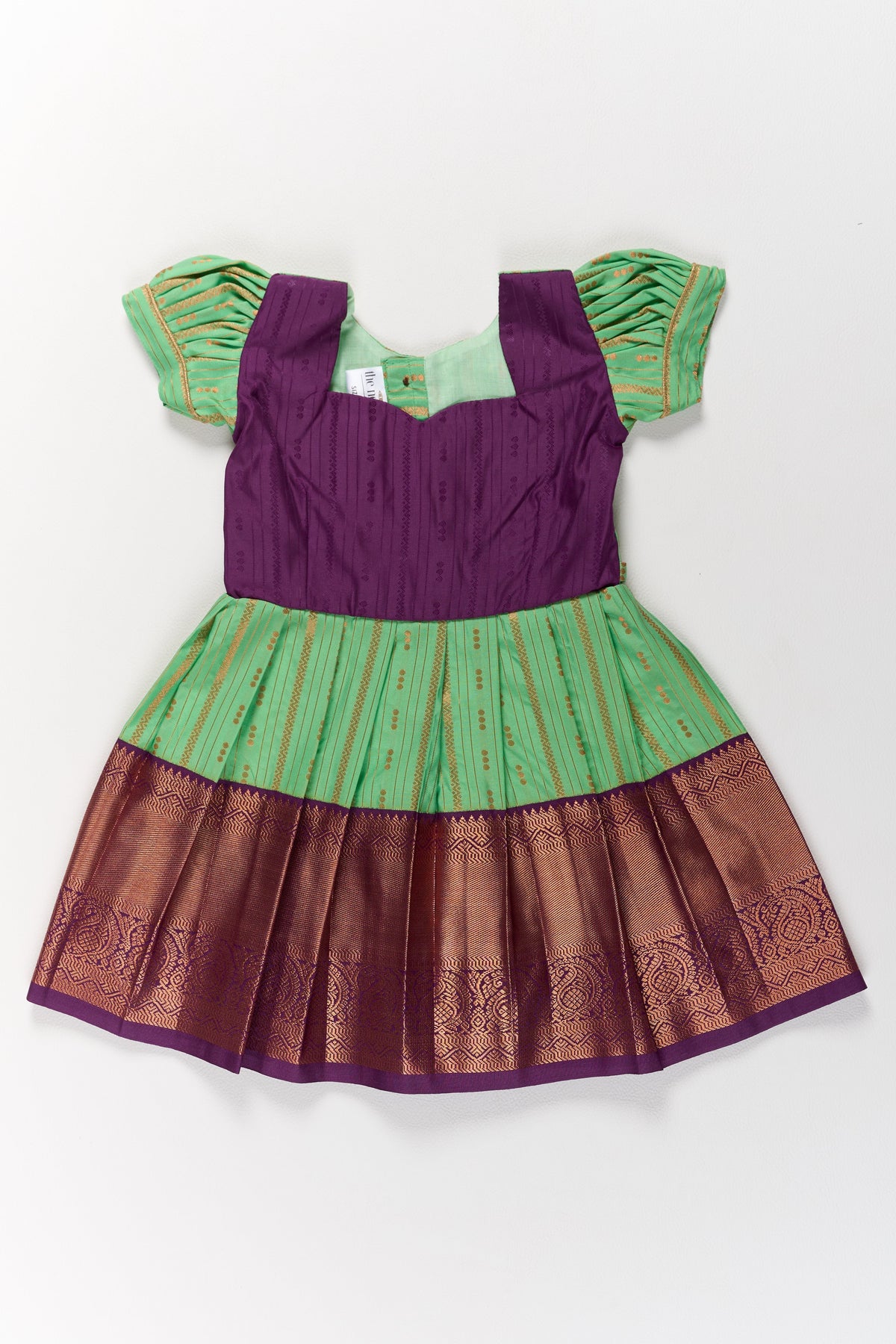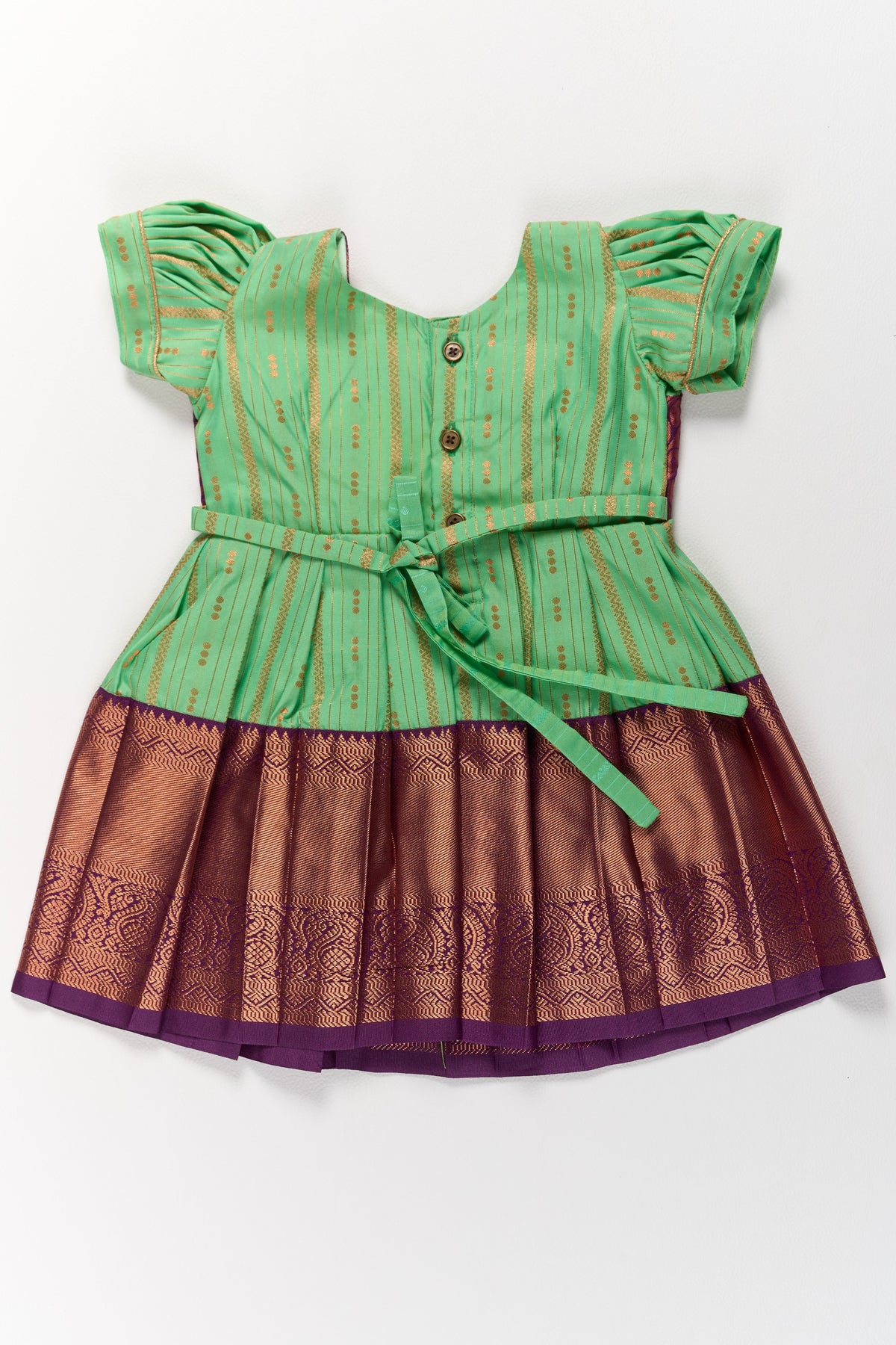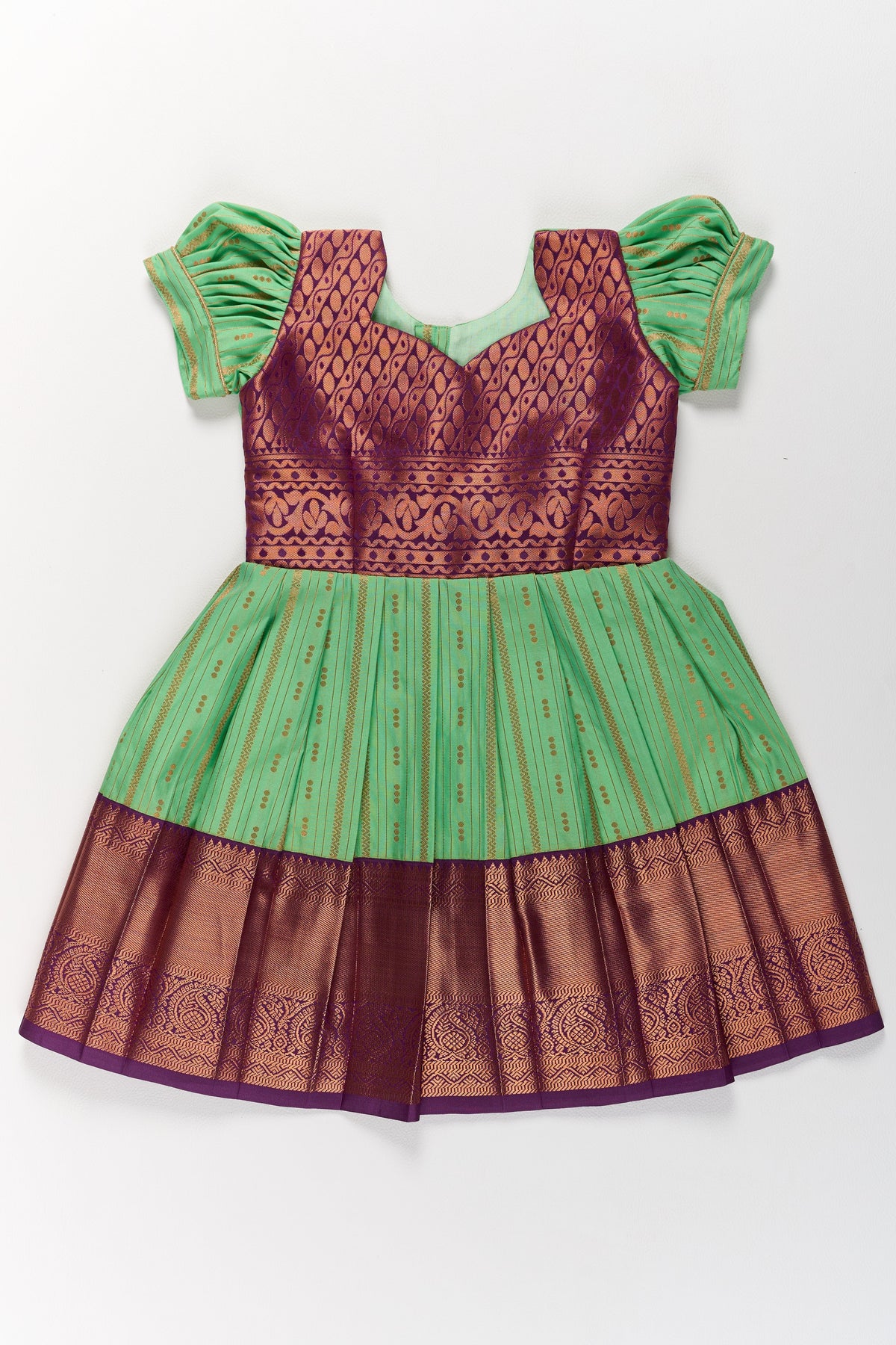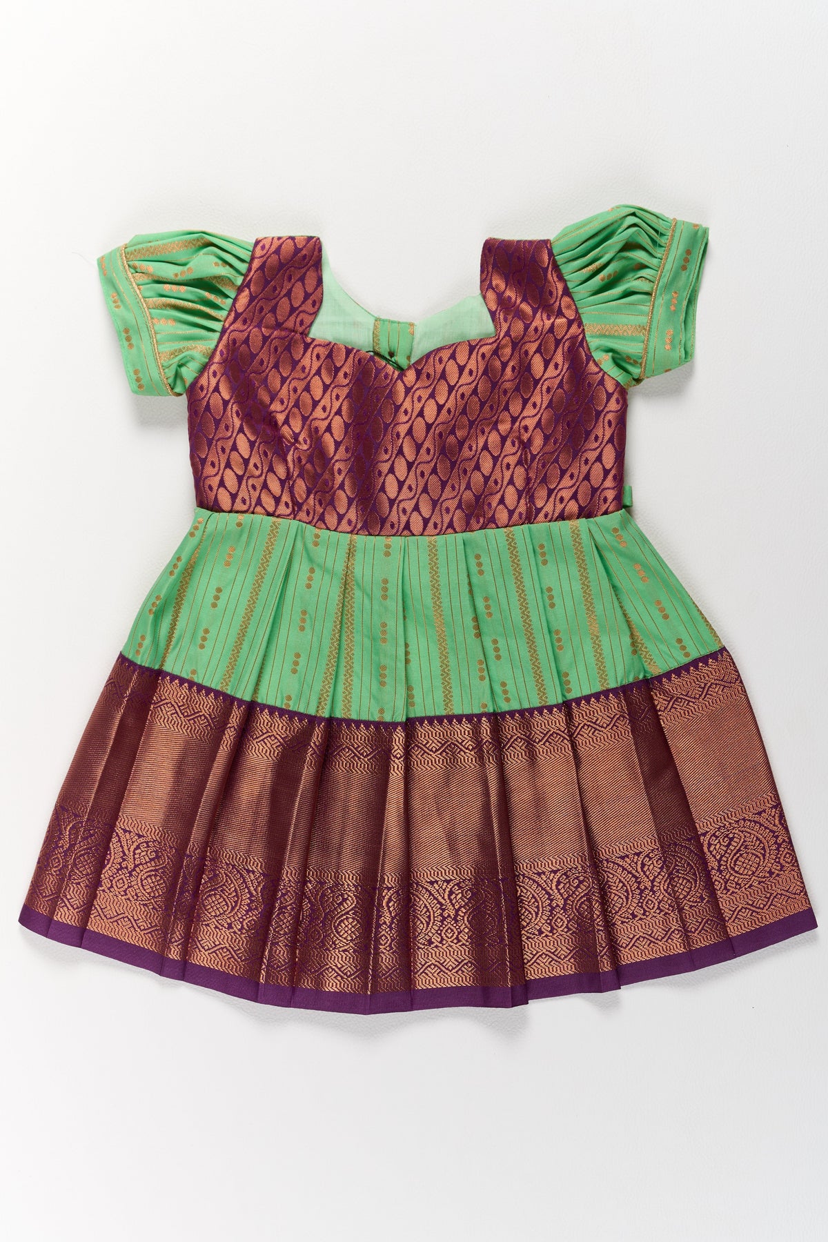 The Nesavu Girls Kanchi Silk Frock Traditional Green and Maroon Pattu Pavadai for Girls with Golden Zari Borders Nesavu Traditional Green Maroon Pattu Pavadai Girls Golden Zari Borders | The Nesavu