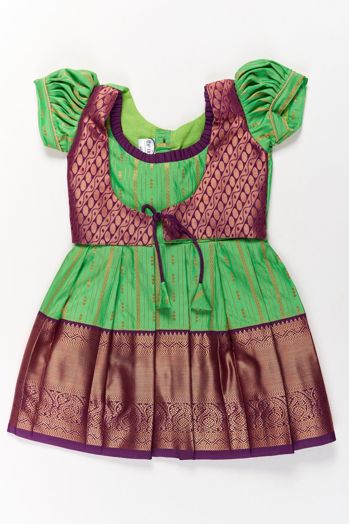 This stunning green and maroon pattu pavadai set is a must-have for your little girl’s festive wardrobe. Designed with a rich silk fabric, the outfit features a pleated skirt with golden zari borders, exuding a classic traditional charm. The attached blouse has intricate detailing and a tie-up back, adding a graceful touch to the ensemble. The puff sleeves give a cute and ethnic look, making it ideal for cultural events, Navratri, Pongal, and family celebrations. Style it with gold jewelry and traditional footwear for a complete ethnic look.