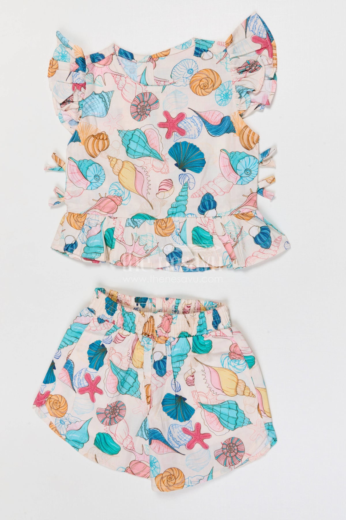 - Design: Ocean themed digital print peplum top with matching shorts
