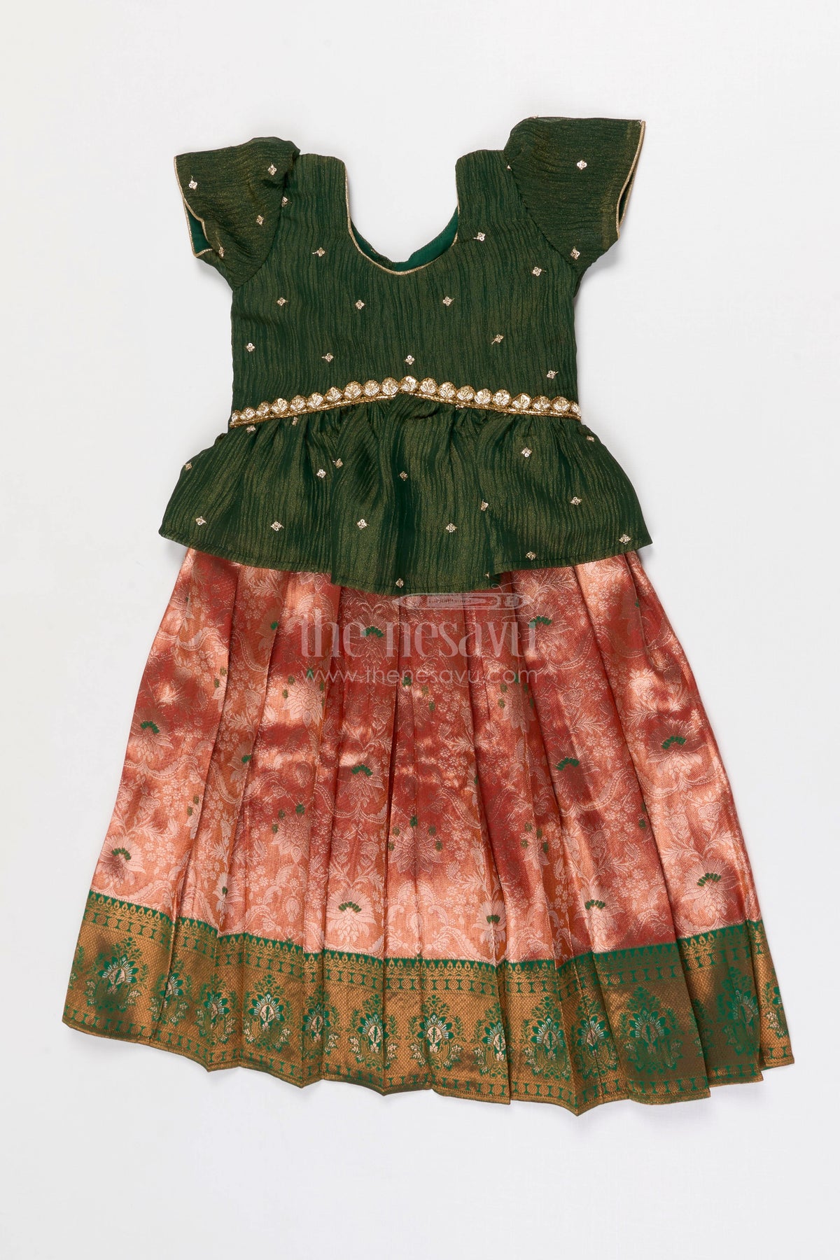 Flared pavadai silhouette allows your little one to move, twirl, and enjoy family functions freely