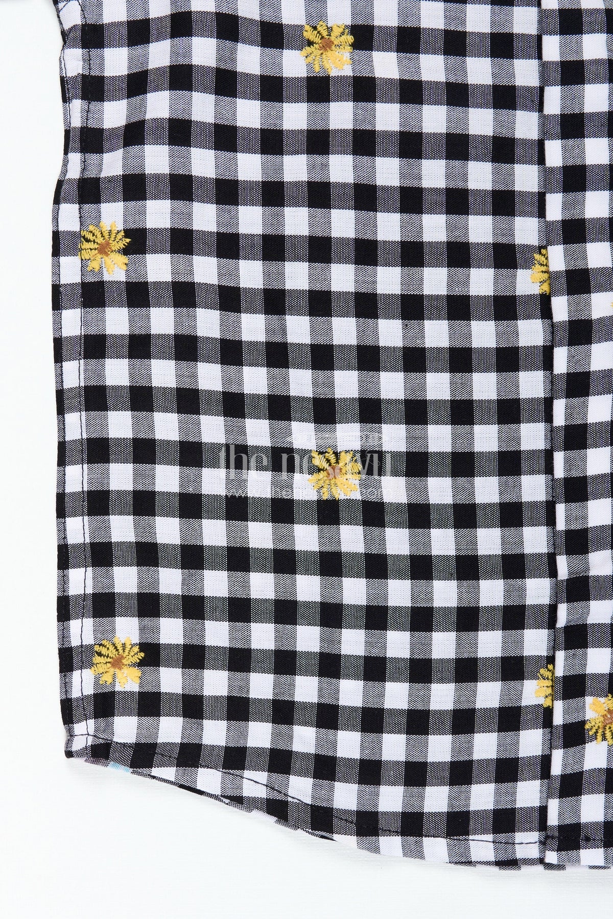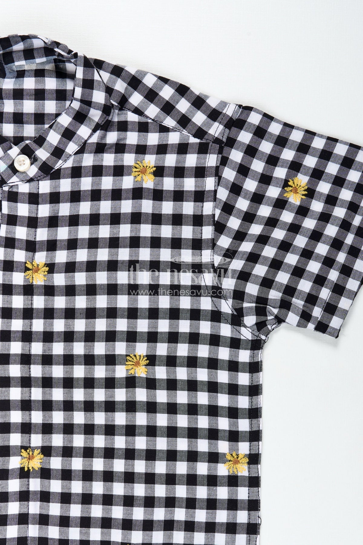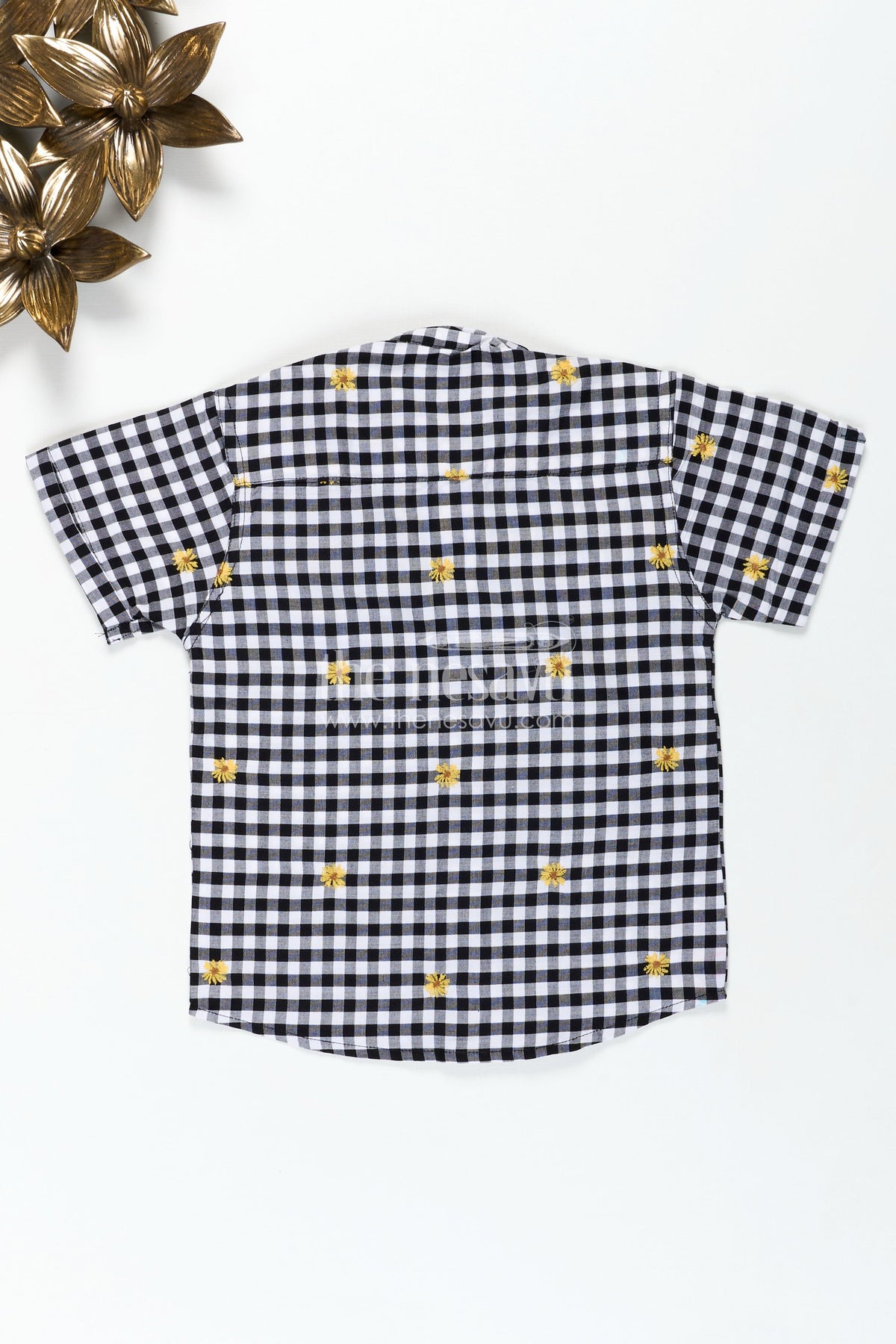 Black and White Printed Shirt is a timeless wardrobe essential updated with fun, youthful flair. Designed in a classic black-and-white gingham check pattern, this shirt stands out with charming yellow flower thread embroidery scattered across the surface. Made from soft, breathable cotton with delicate embroidery details, it keeps your child cool and comfortable throughout the day. The neat mandarin collar, short sleeves, and full front button closure make this shirt as practical as it is stylish. Perfect for both casual outings and slightly dressier occasions, this piece brings together simplicity and standout design for boys who love looking sharp.