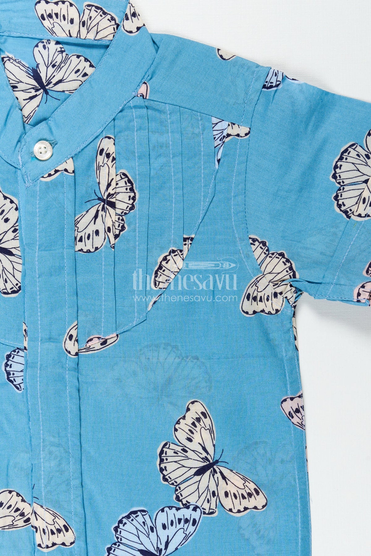 Boys butterfly print summer shirt cotton captures the essence of playful nature with its soft blue tone and delicately detailed butterfly prints. Made from breathable cotton, this shirt is tailored for summer comfort while showcasing a light, artistic aesthetic. The butterflies flutter across the fabric in shades of cream, blush, and navy, giving the shirt an airy, whimsical charm. With its mandarin collar, pleated front, and short sleeves, it offers a balance of relaxed fit and smart detailing. Whether it’s a picnic, a birthday party, or a beachside outing, this shirt keeps boys cool, stylish, and ready for fun.