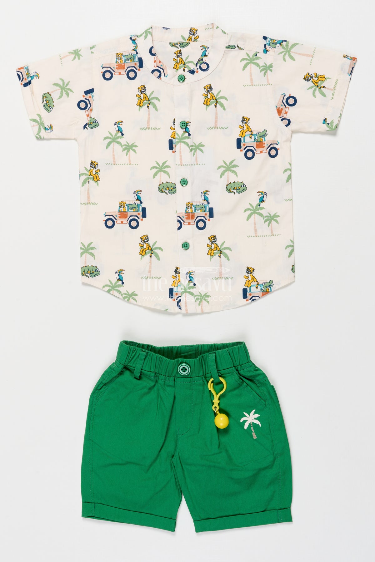 - Design: Printed shirt with matching shorts