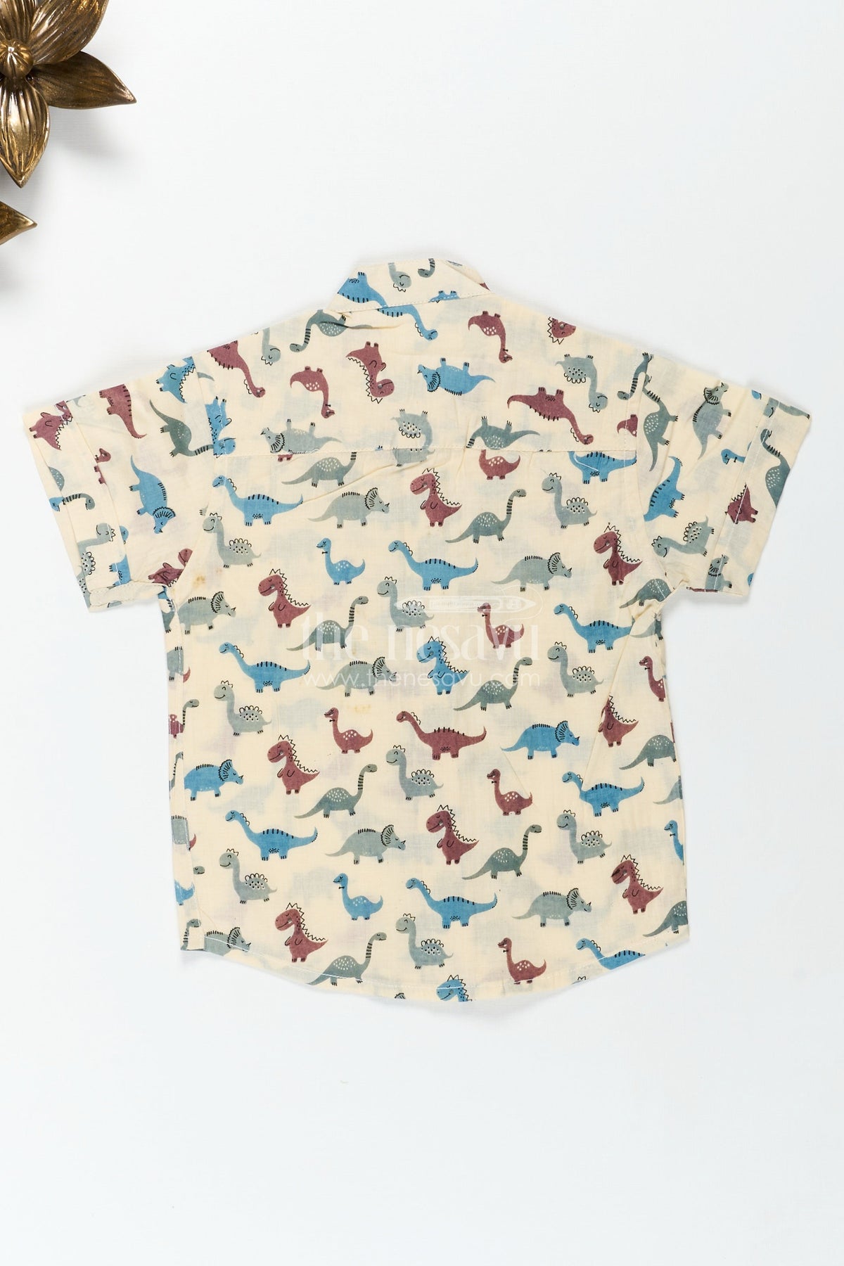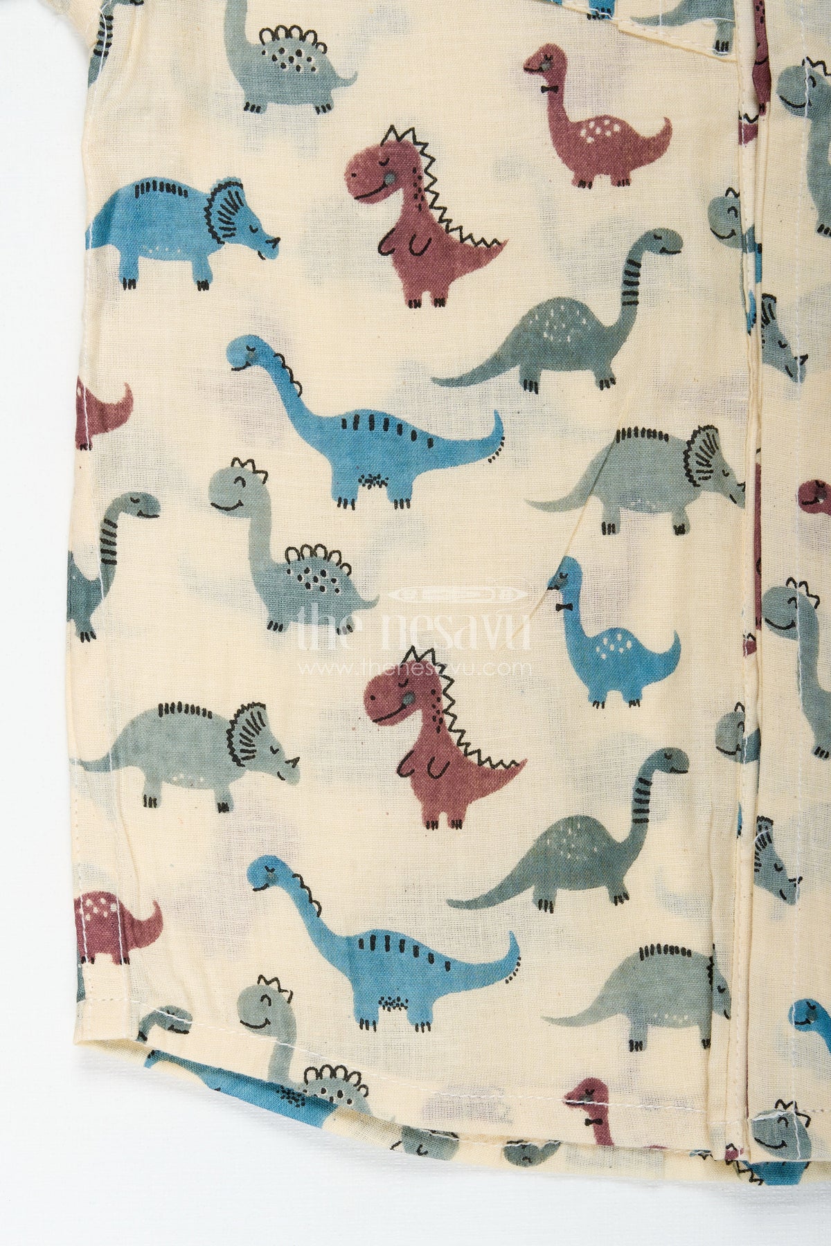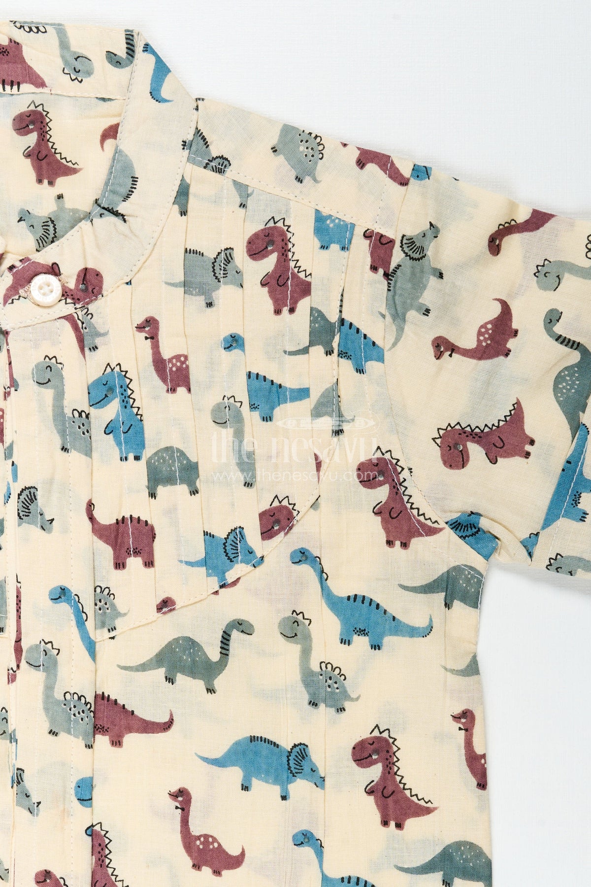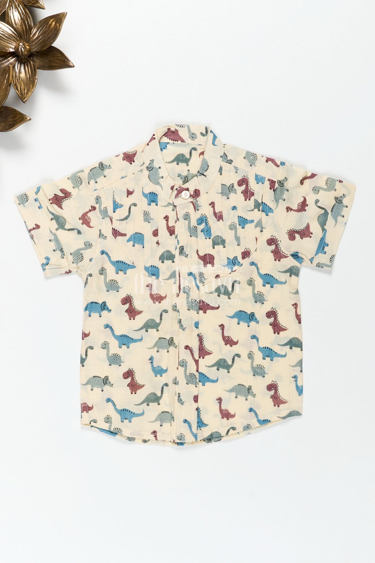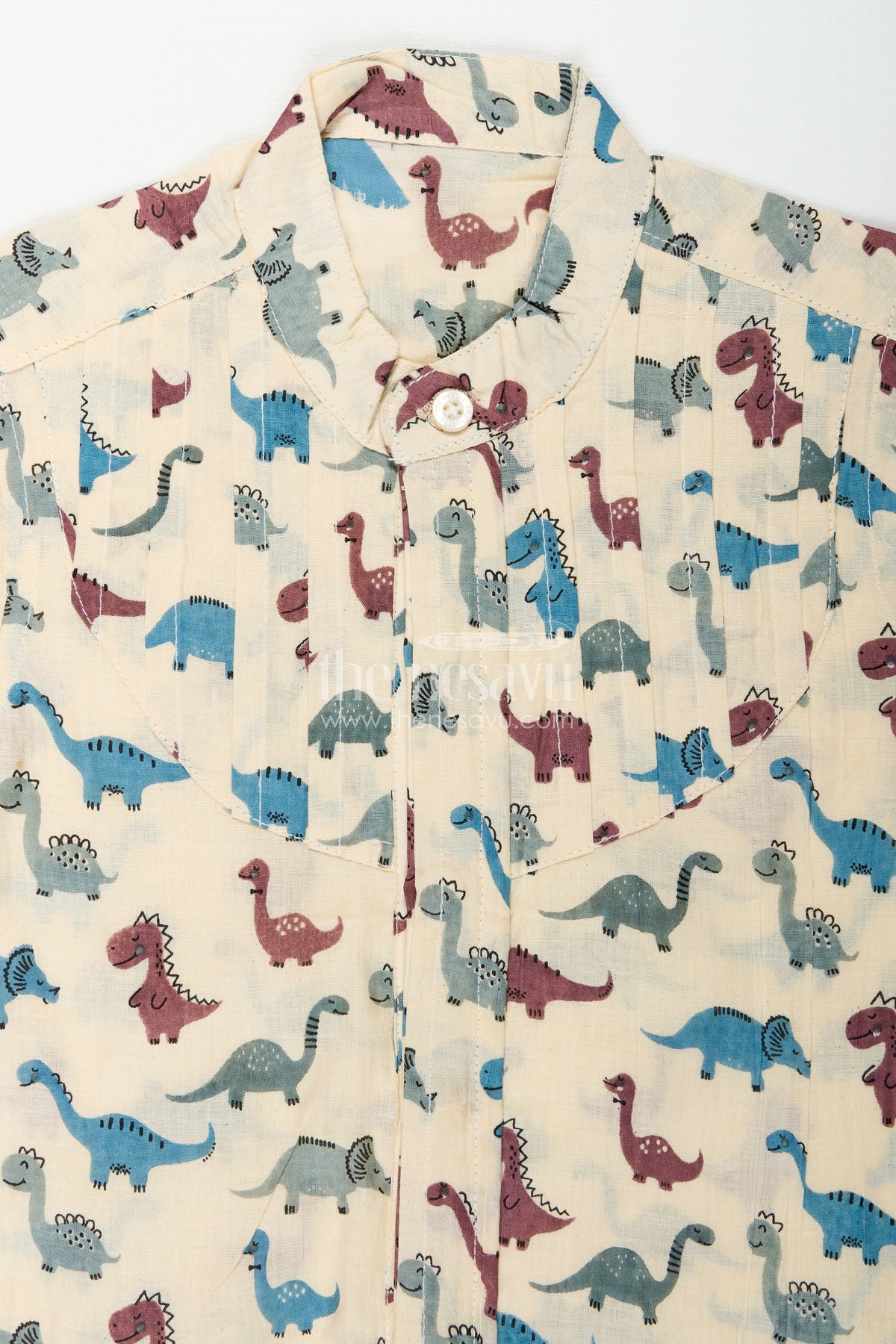 Boys cotton safari shirt for toddler wear is crafted for adventure and comfort, featuring a charming collection of dinosaur prints in maroon and blue tones. This cotton shirt is both breathable and soft on the skin, making it perfect for toddlers on the move. Designed with a front pleated yoke and smart mandarin collar, it balances playful design with a structured fit. Ideal for day trips, preschool, or relaxed weekends, the safari-inspired print keeps things fun while the premium fabric ensures durability. Its easy button-front design makes dressing hassle-free, offering a reliable and joyful wardrobe addition for every little explorer.