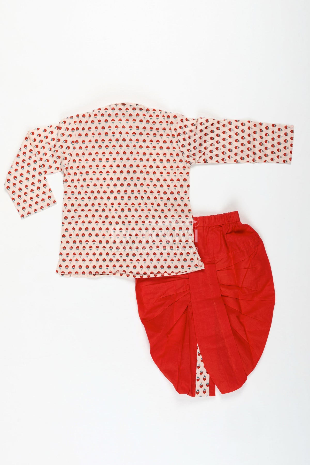 Boys Dhoti Kurta Set for Cultural Celebrations offers a cheerful and traditional look crafted with thoughtful detail. The cream kurta is adorned with charming red floral digital prints and features a contrast collar and front button placket, adding subtle style. Paired with a vibrant red dhoti and matching printed panel, this set embodies festive spirit while maintaining all-day comfort thanks to its soft cotton fabric. Whether it's a temple visit or a school celebration, this dhoti kurta set is a delightful choice that blends culture with comfort and a dash of vibrant personality.