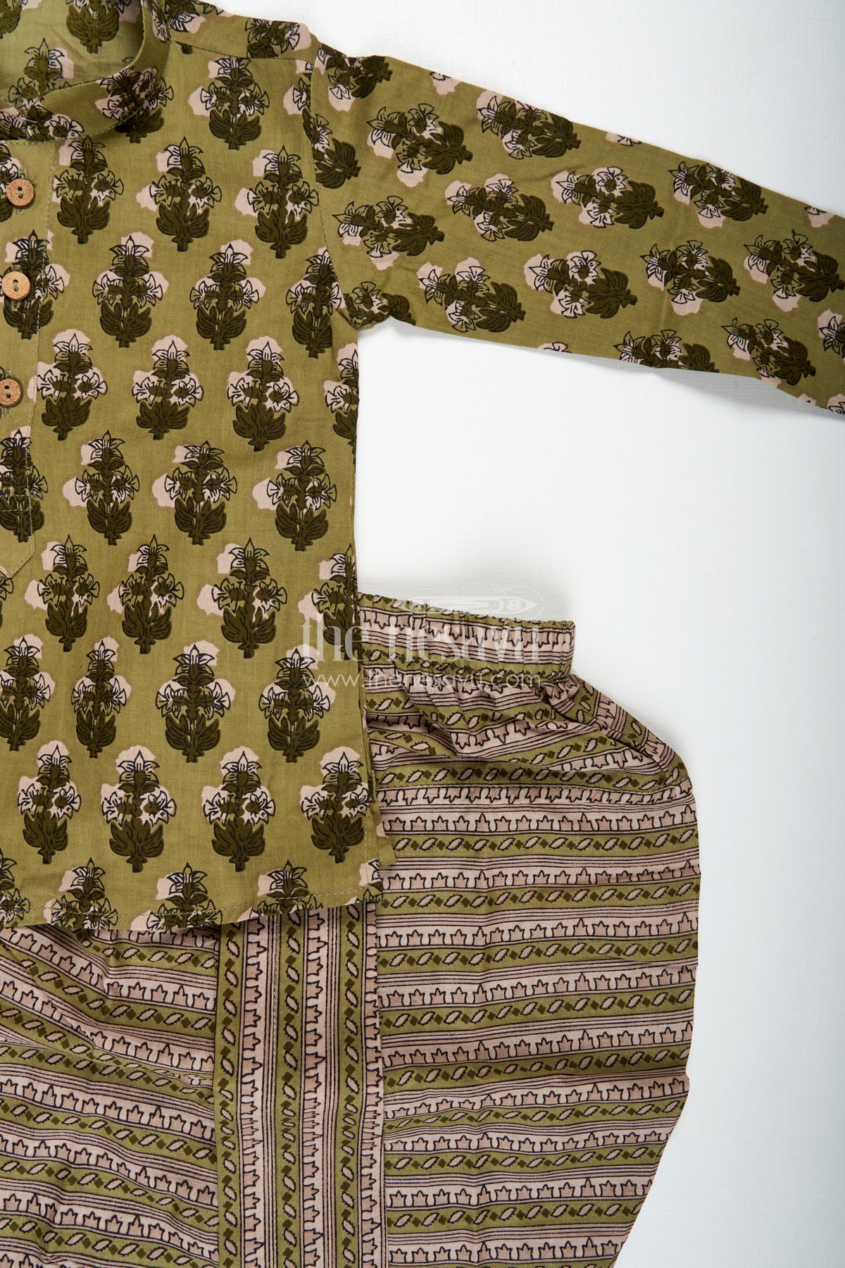 Boys Dhoti Set for Traditional Indian Celebrations brings rich cultural aesthetics to your child's wardrobe. This green ensemble features a block-printed kurta paired with matching dhoti pants, all crafted from breathable cotton fabric. The kurta showcases intricate floral and paisley-inspired motifs, while the dhoti complements with a printed border for a coordinated look. The lightweight, natural fabric ensures all-day comfort during festivals, temple visits, or family rituals. This set celebrates the beauty of Indian traditions while offering a stylish, kid-friendly fit.