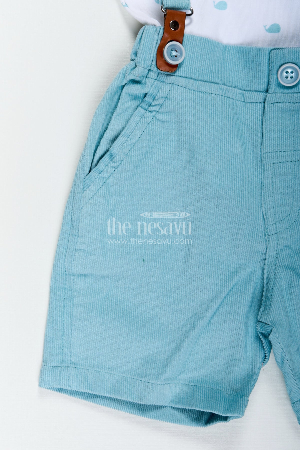 This stylish boys dress set with bow tie is the perfect choice for little gentlemen on the go. Nesavu blends functionality and charm with a nautical-themed white polo shirt featuring anchors and mini whale prints, paired with soft mint green corduroy shorts. The set includes a coordinated mint bow tie and detachable suspenders, elevating it from casual to classy. Made from breathable knitted cotton jersey and soft corduroy, this outfit promises day-long comfort and a smart look for outings, photoshoots, or casual events. Your little one will look effortlessly dashing while staying cool and comfy.
