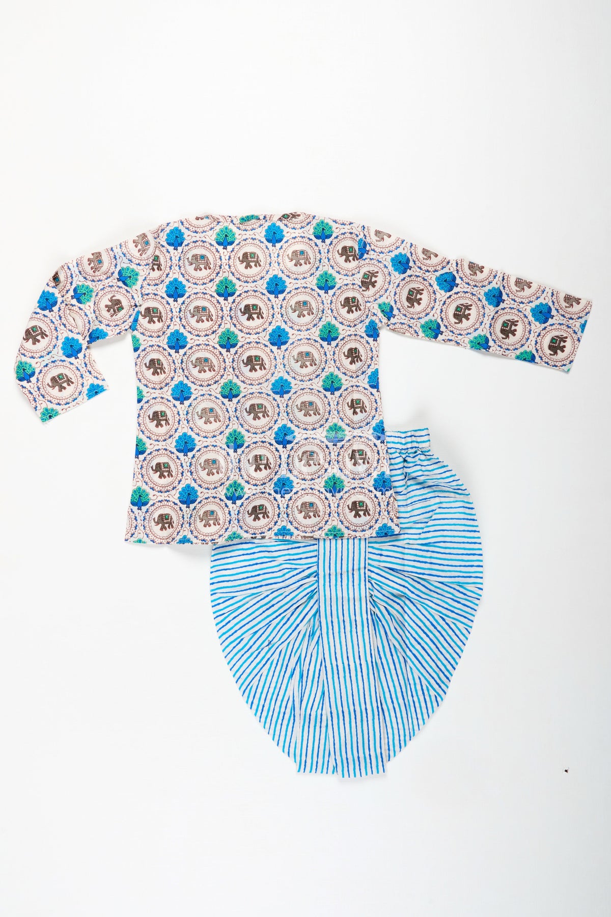 Boys Elegant Dhoti Set for Traditional Functions combines vibrant aesthetics with timeless appeal. The kurta showcases a unique blend of multi-color digital prints in a palette of earthy tones, perfectly balanced with a neutral dhoti enhanced by a patterned border. Designed in breathable cotton, the outfit is ideal for temple visits, family gatherings, or any traditional celebration. The attention to detail in the prints gives the outfit a sophisticated edge, while its soft texture ensures ease of wear. This dhoti set is perfect for parents looking to blend heritage with comfort.