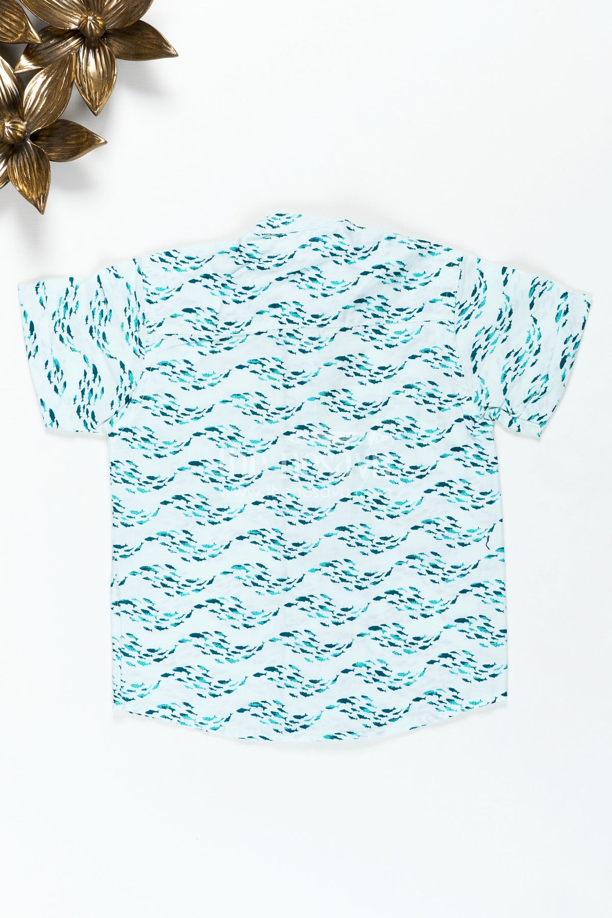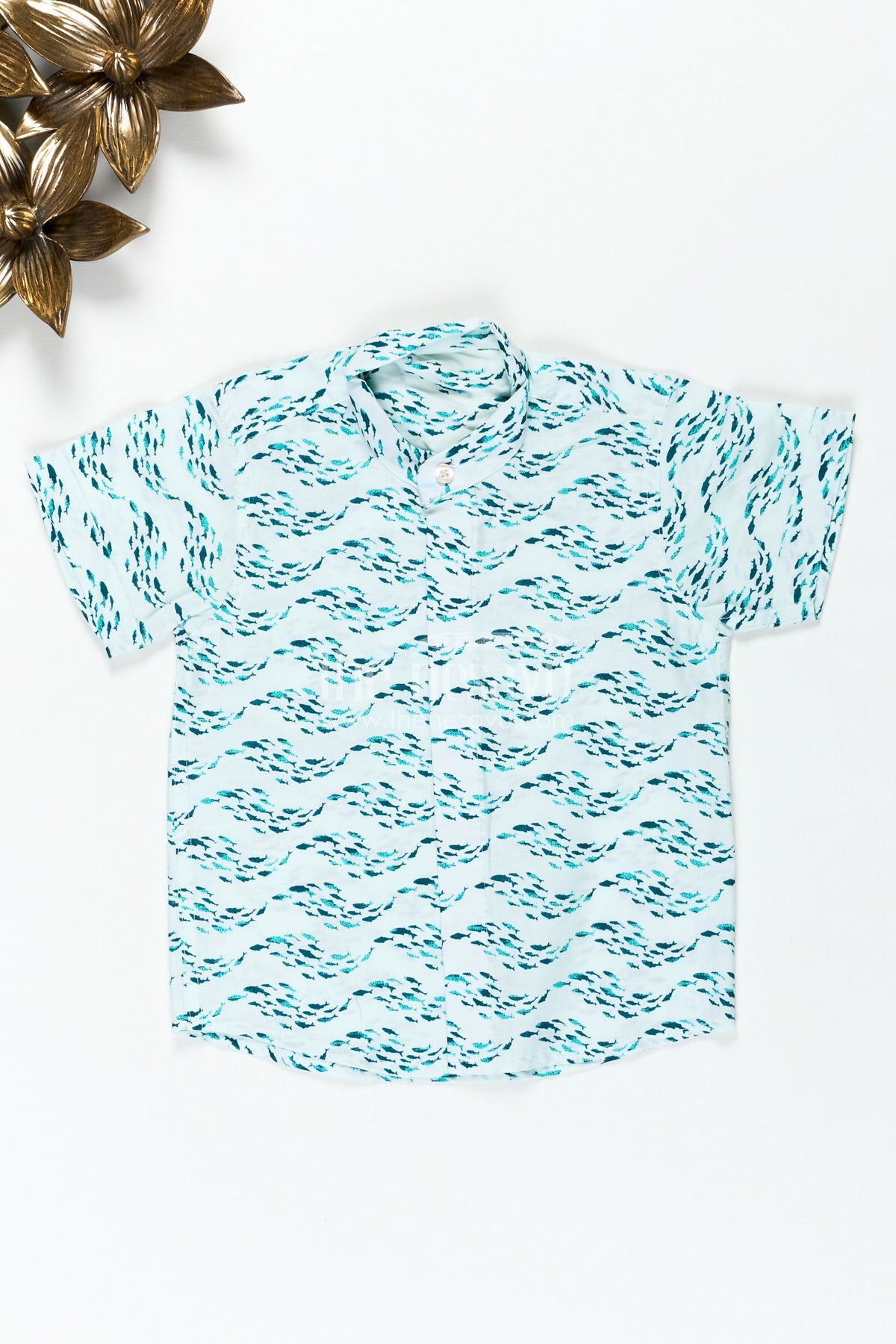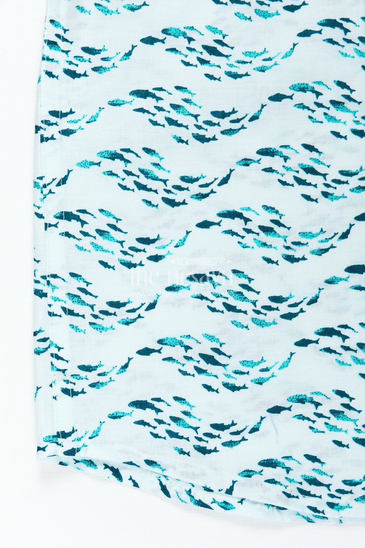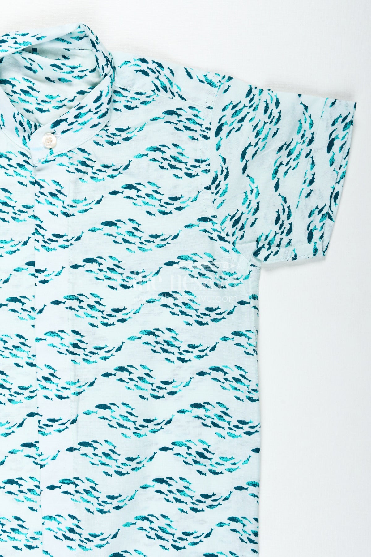 Boys Printed Shirt introduces fun and imagination to everyday wear with its marine-inspired print and breathable cotton fabric. Crafted from cotton with digital print, this light blue shirt features waves of tiny fish swimming across the surface—making it a hit with young ocean explorers. The mandarin collar gives it a touch of sophistication, while the short sleeves and light texture ensure all-day comfort. Ideal for casual wear, summer trips, or school outings, this shirt combines charm and practicality. Easy to wash and gentle on the skin, it’s a playful yet refined choice for any boy’s wardrobe.