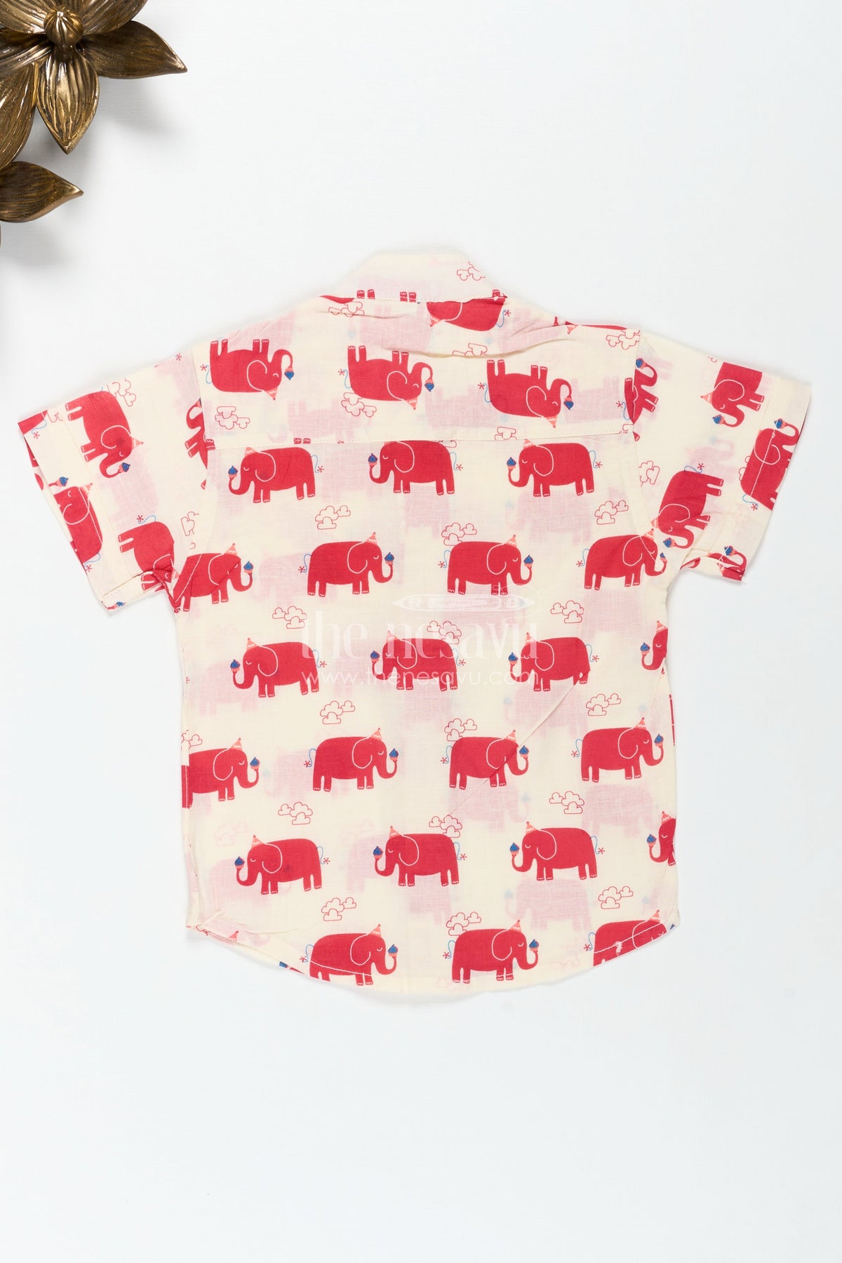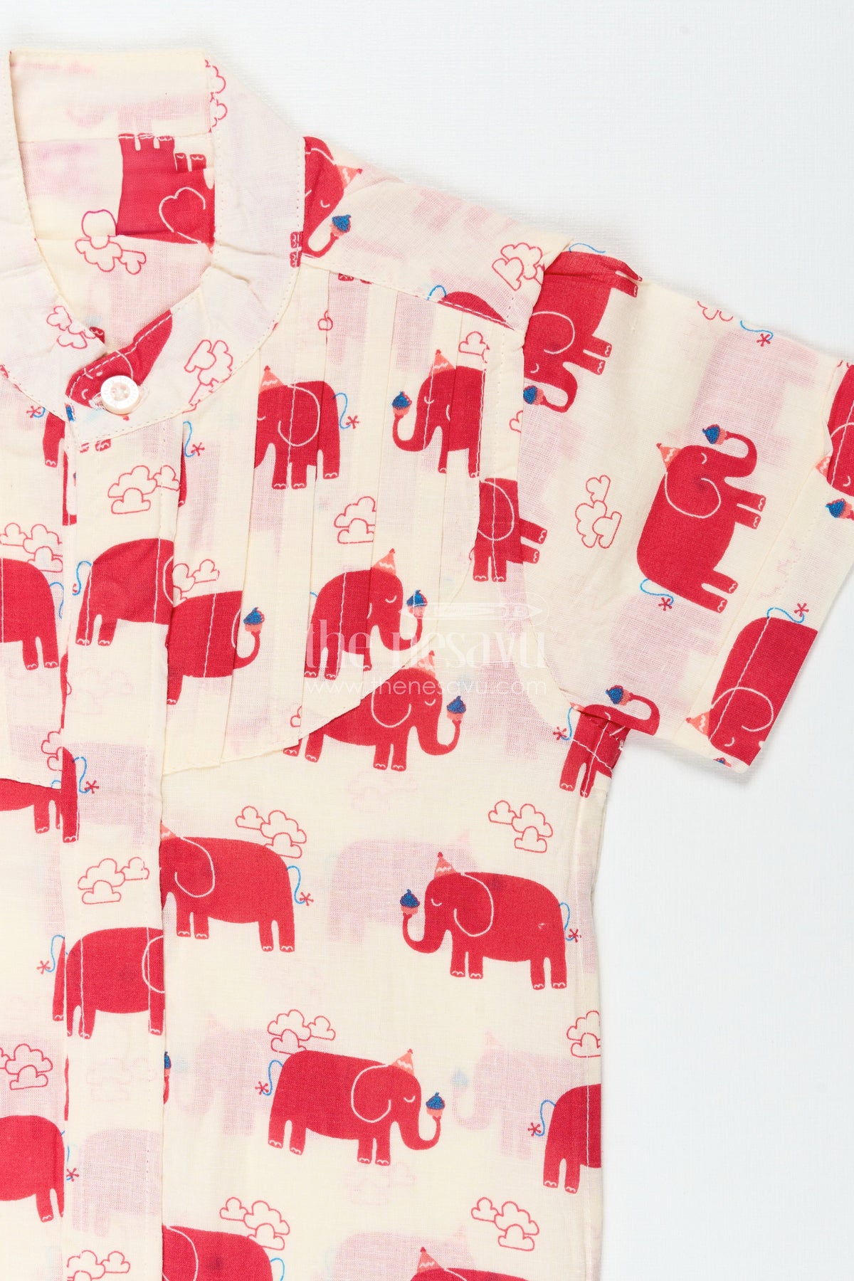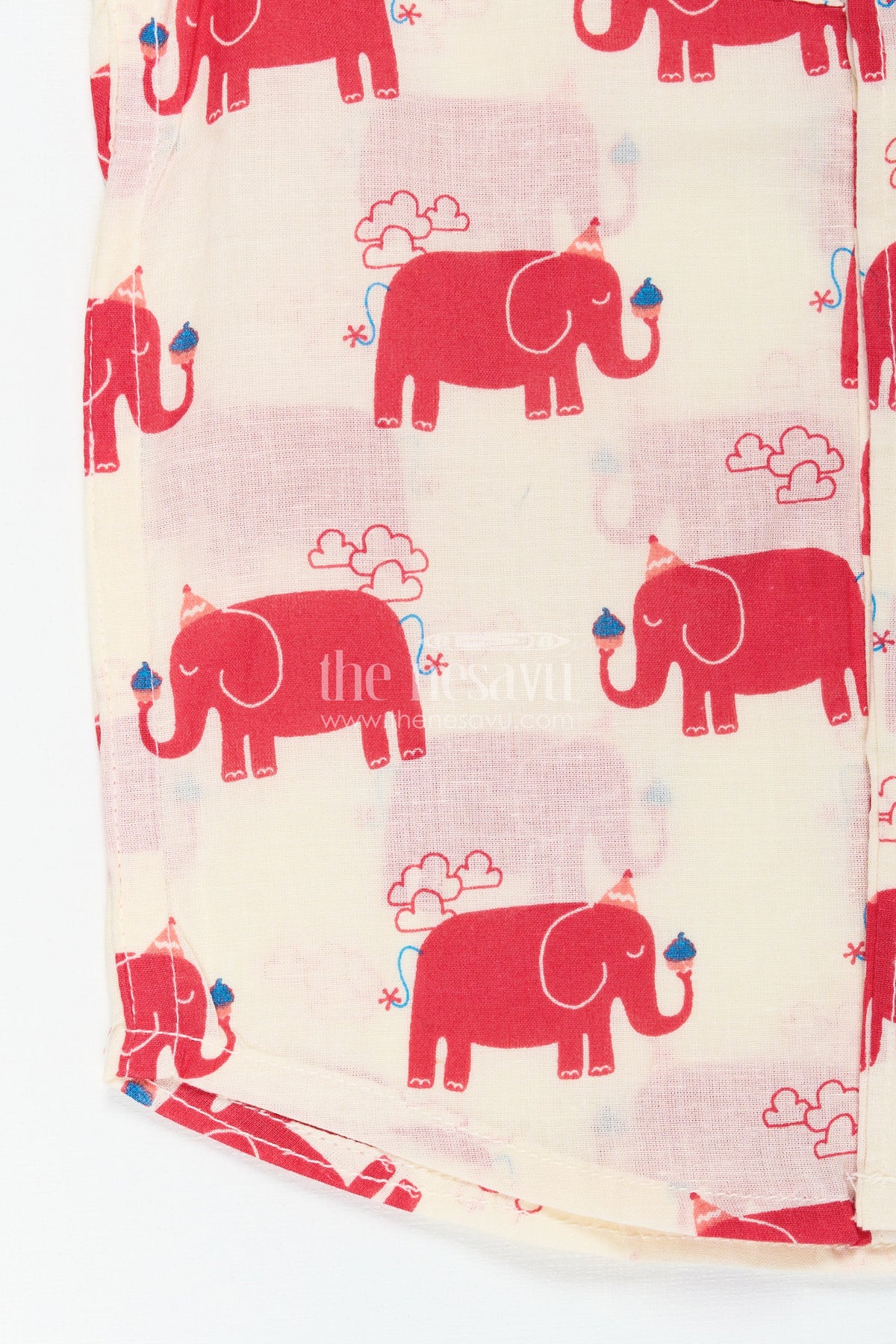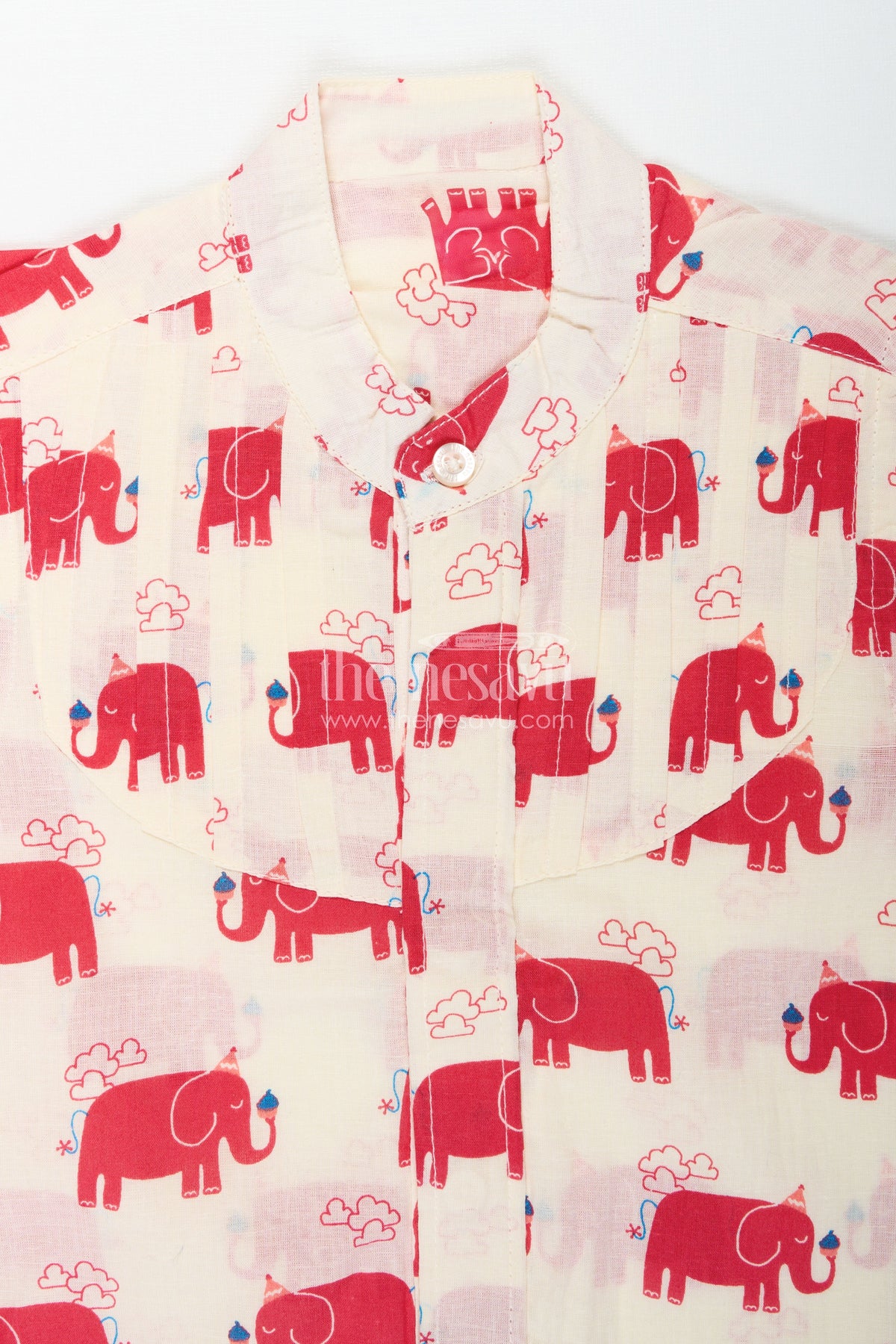 Casual festive shirt for boys with animal motifs brings a joyful spirit to everyday fashion with its bold red elephant digital prints on a cream background. Crafted from soft and breathable cotton, this shirt is ideal for active little boys who love comfort with a playful twist. The mandarin collar and pleated front give it a smart, well-finished look, perfect for casual celebrations or daily wear. The vibrant animal motifs and light fabric make it suitable for warm days, offering both style and ease. Finished with front buttons for hassle-free dressing, this shirt stands out as a bright and practical choice for boys. Whether it’s a small gathering or a family stroll, this shirt adds color and character to your child's wardrobe.