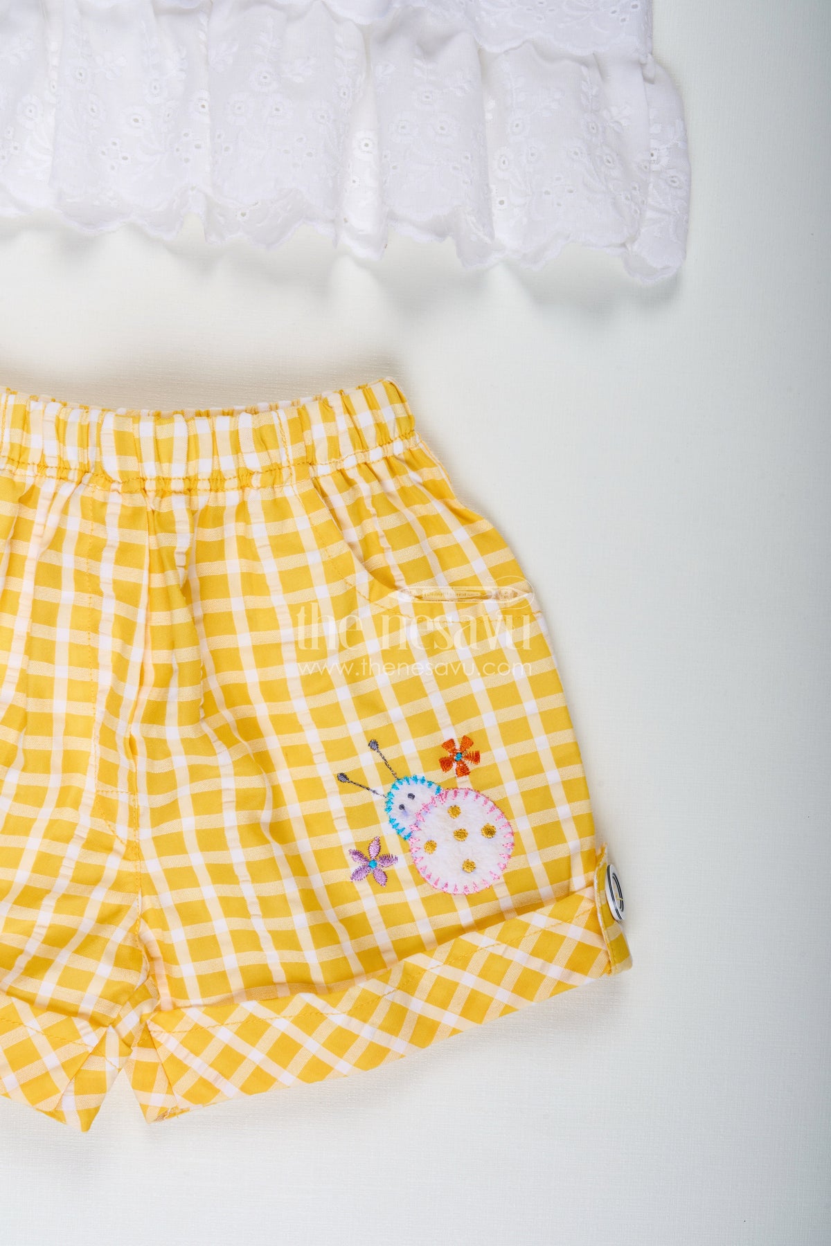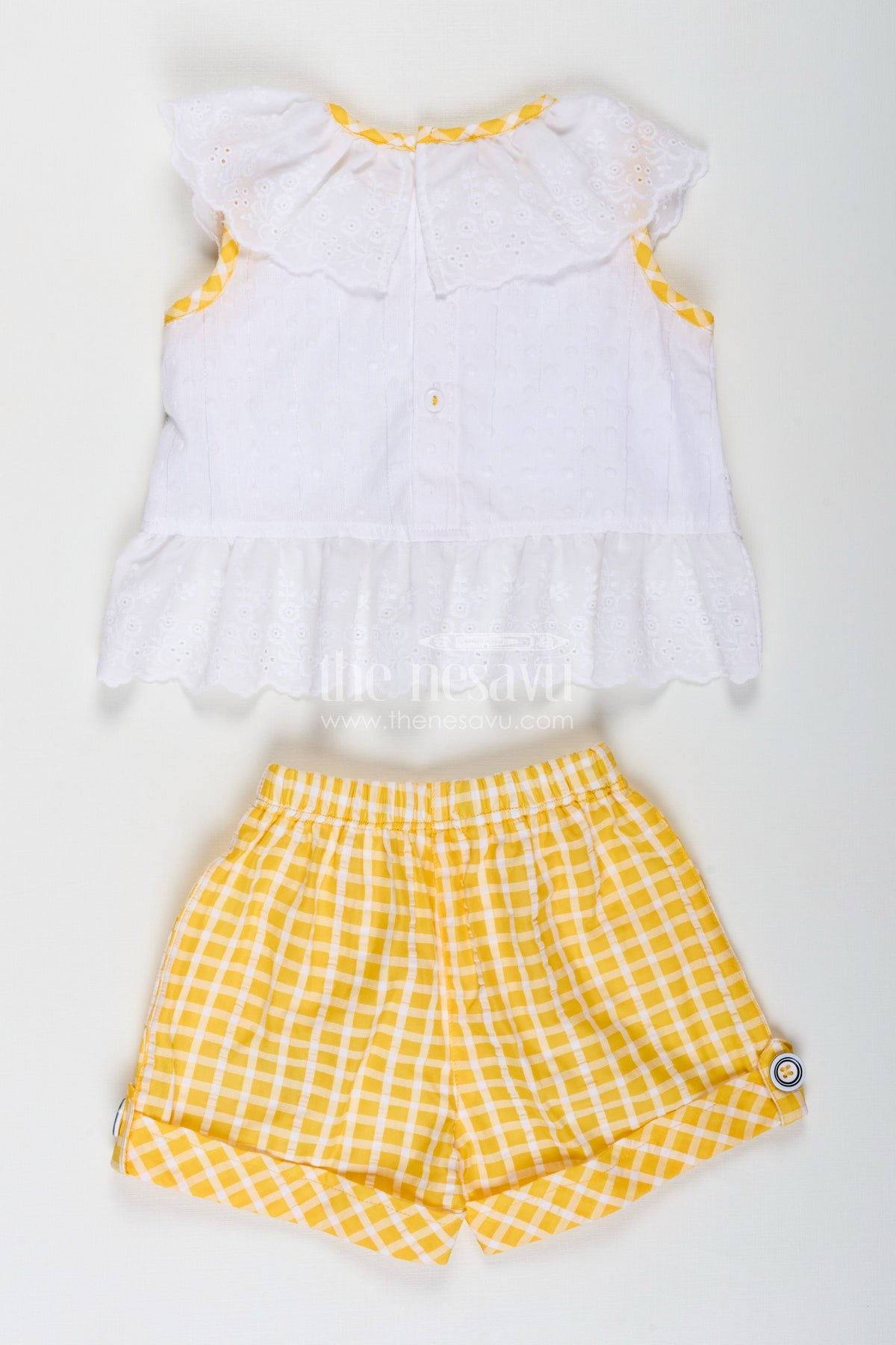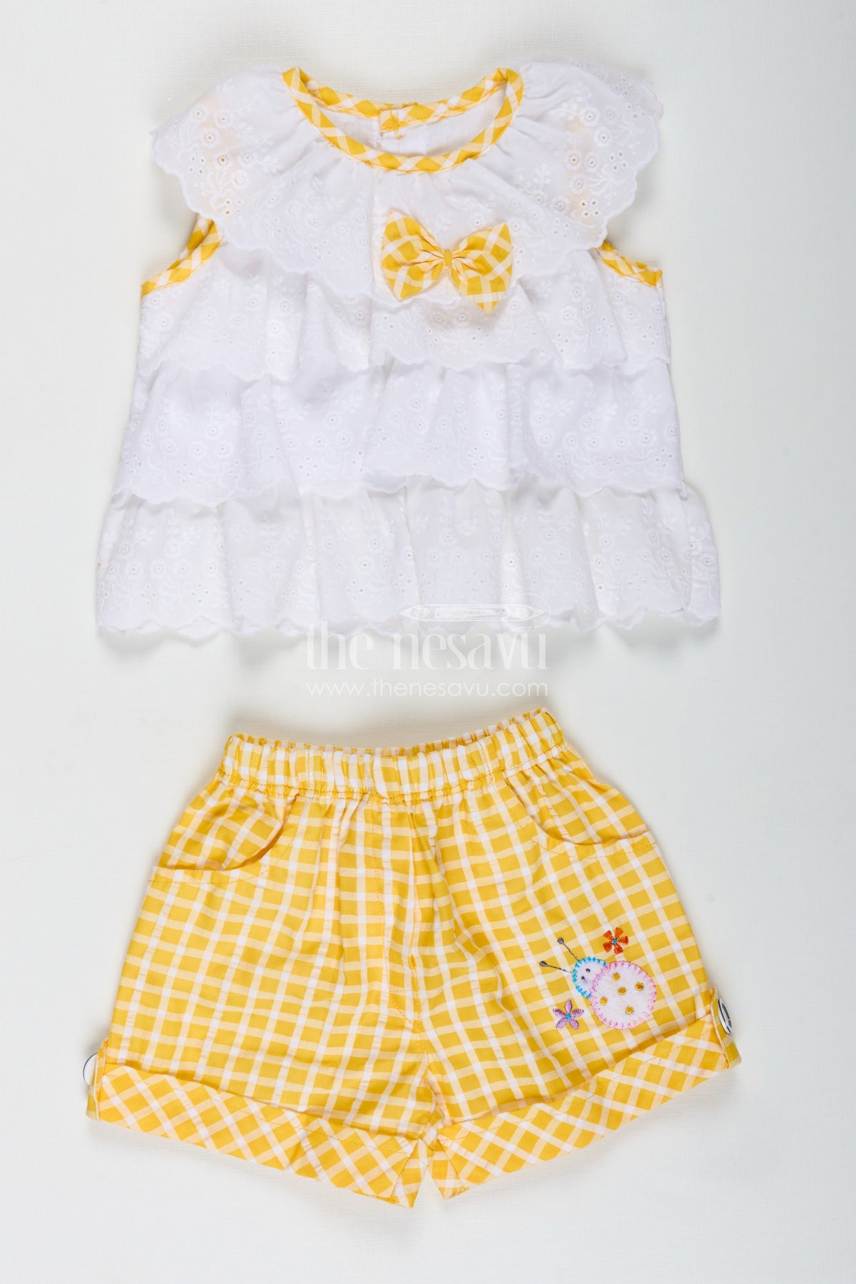 Comfortable Baby Casual Set for Everyday Wear offers the perfect balance of charm and ease for active toddlers. This two-piece outfit includes a white cotton top with delicate thread-embroidered layered yoke and a matching yellow gingham short. The top’s ruffled design and yellow checked bow at the neckline add sweet details, while the shorts feature playful embroidery and a comfortable elastic waistband. Crafted with breathable fabric and a soft finish, this set ensures all-day wearability, whether indoors or outdoors. A fuss-free, stylish choice for your baby’s casual wardrobe.