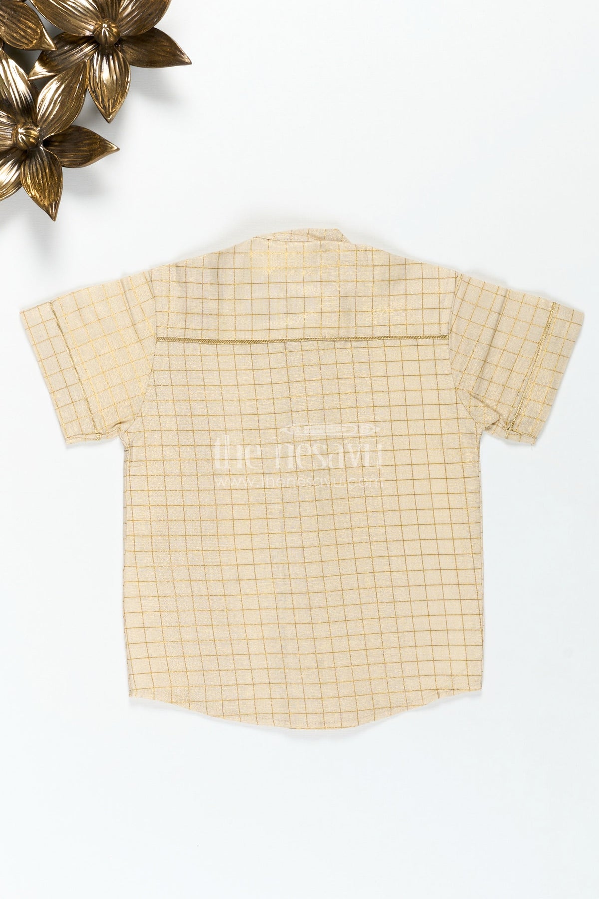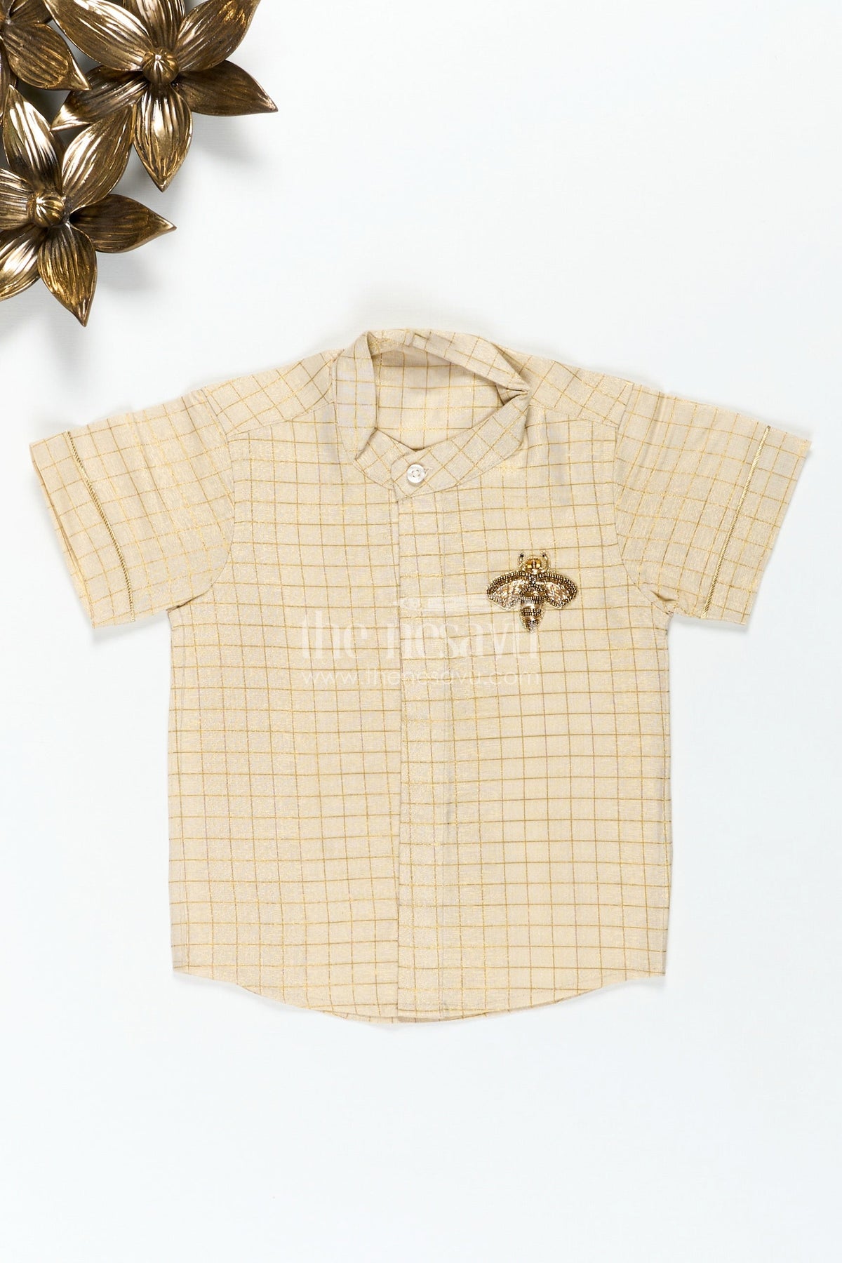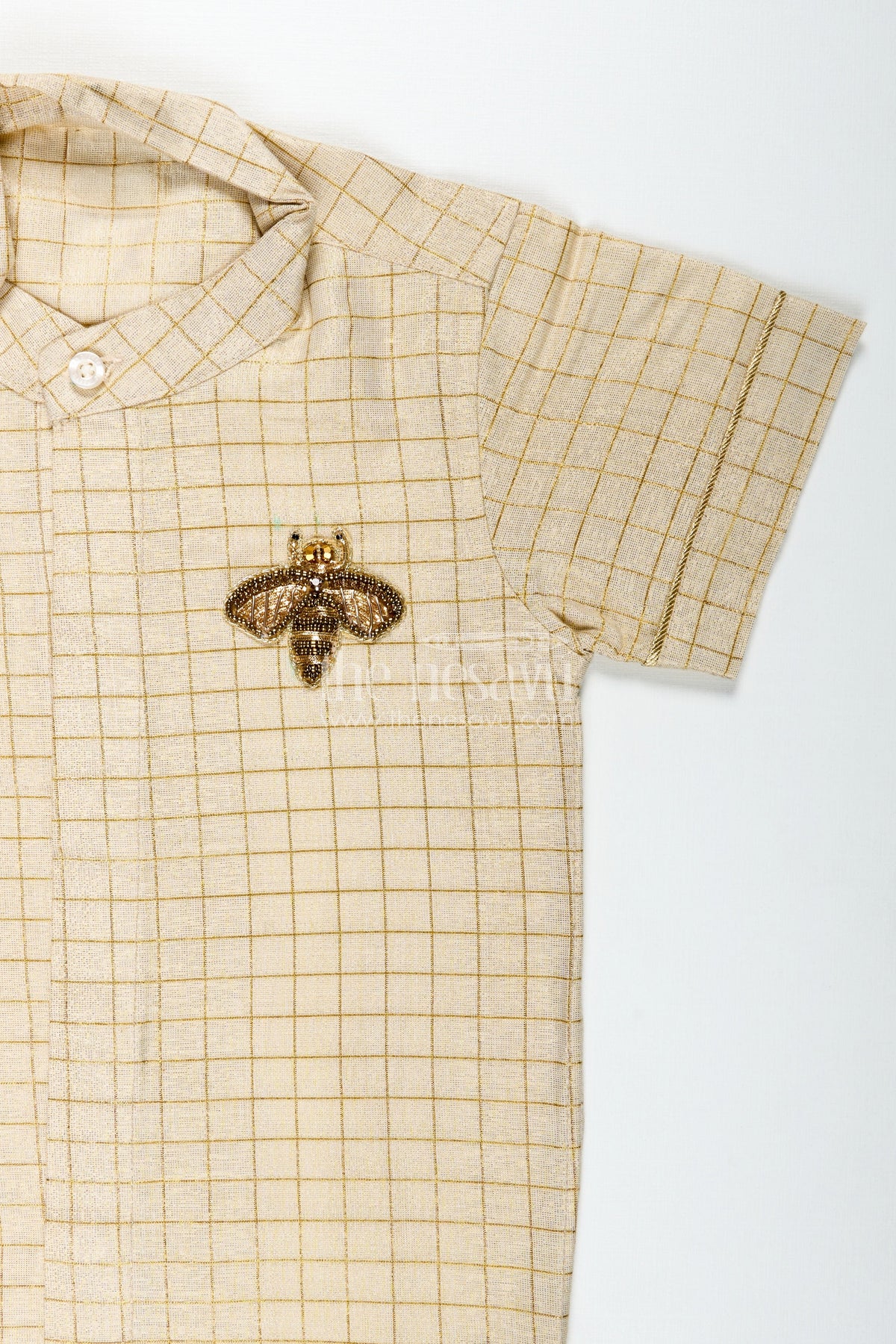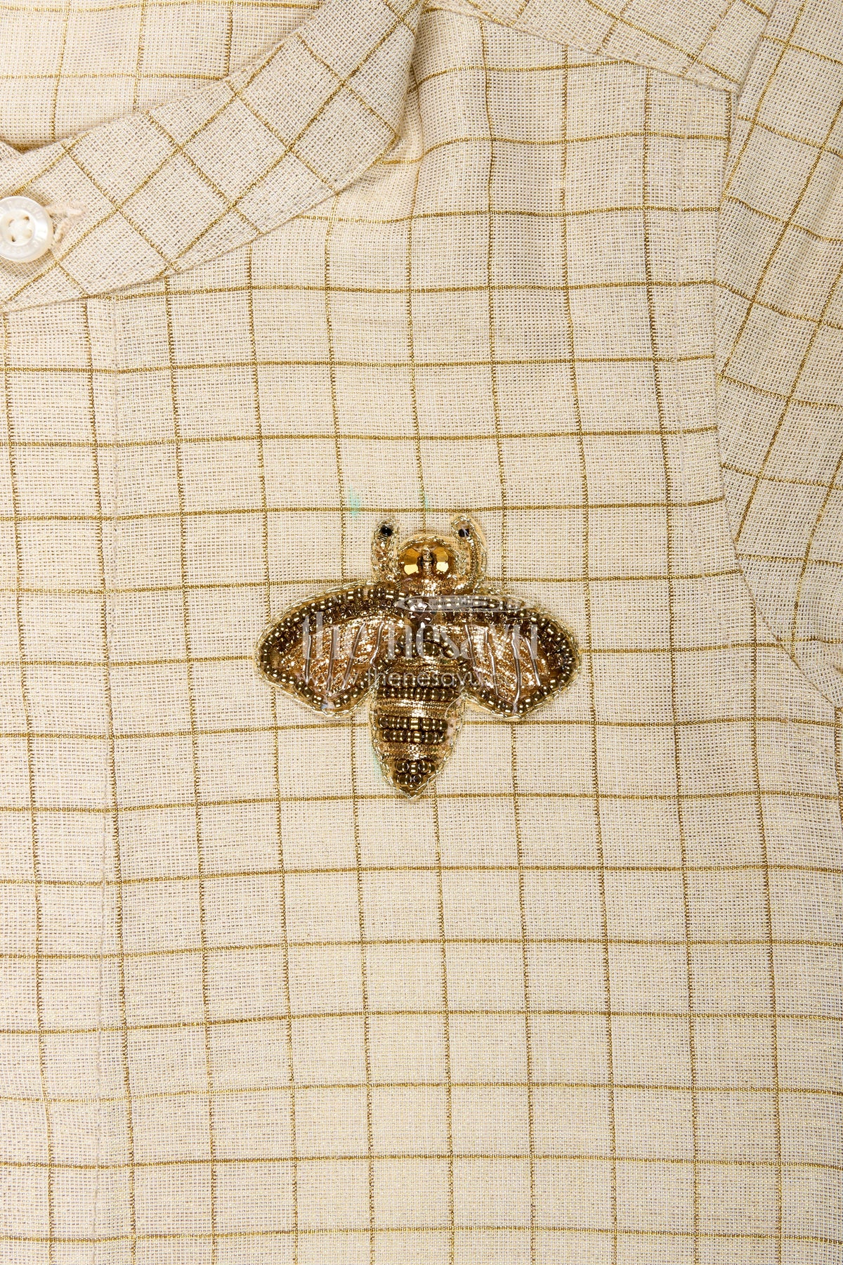 Cream Colour Shirt Boys brings a modern ethnic touch to your child’s wardrobe with its unique design and soft silk blend texture. This elegant cream shirt features a golden checkered weave that adds dimension, and the standout embroidered bee motif on the chest gives it a youthful personality. The structured mandarin collar and short sleeves create a refined silhouette perfect for festive or formal occasions. Lightweight and breathable, this shirt ensures day-long comfort while keeping your child looking stylish and polished. Whether styled with jeans or traditional wear, this versatile shirt adds charm and class to any outfit.