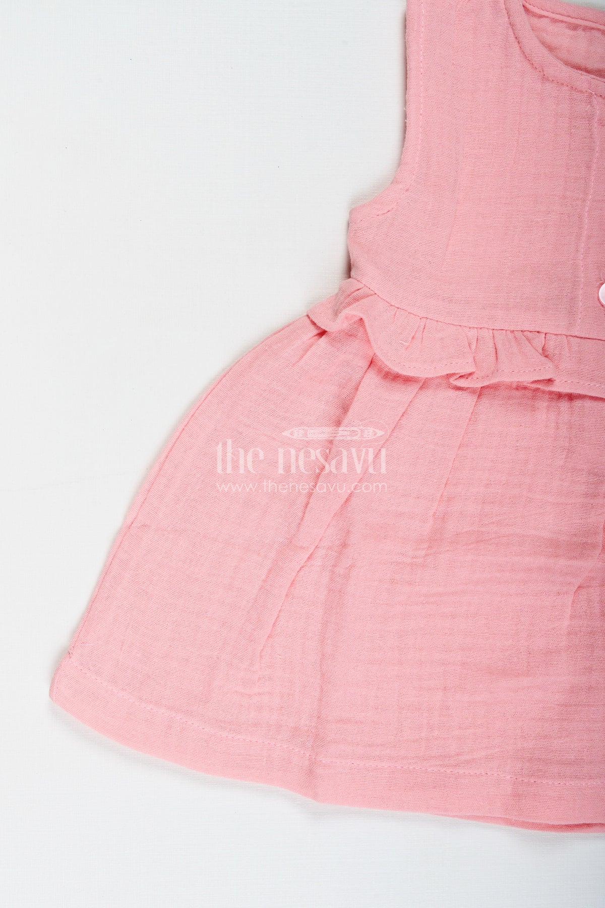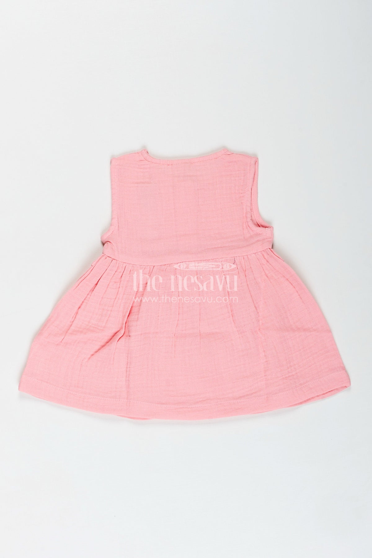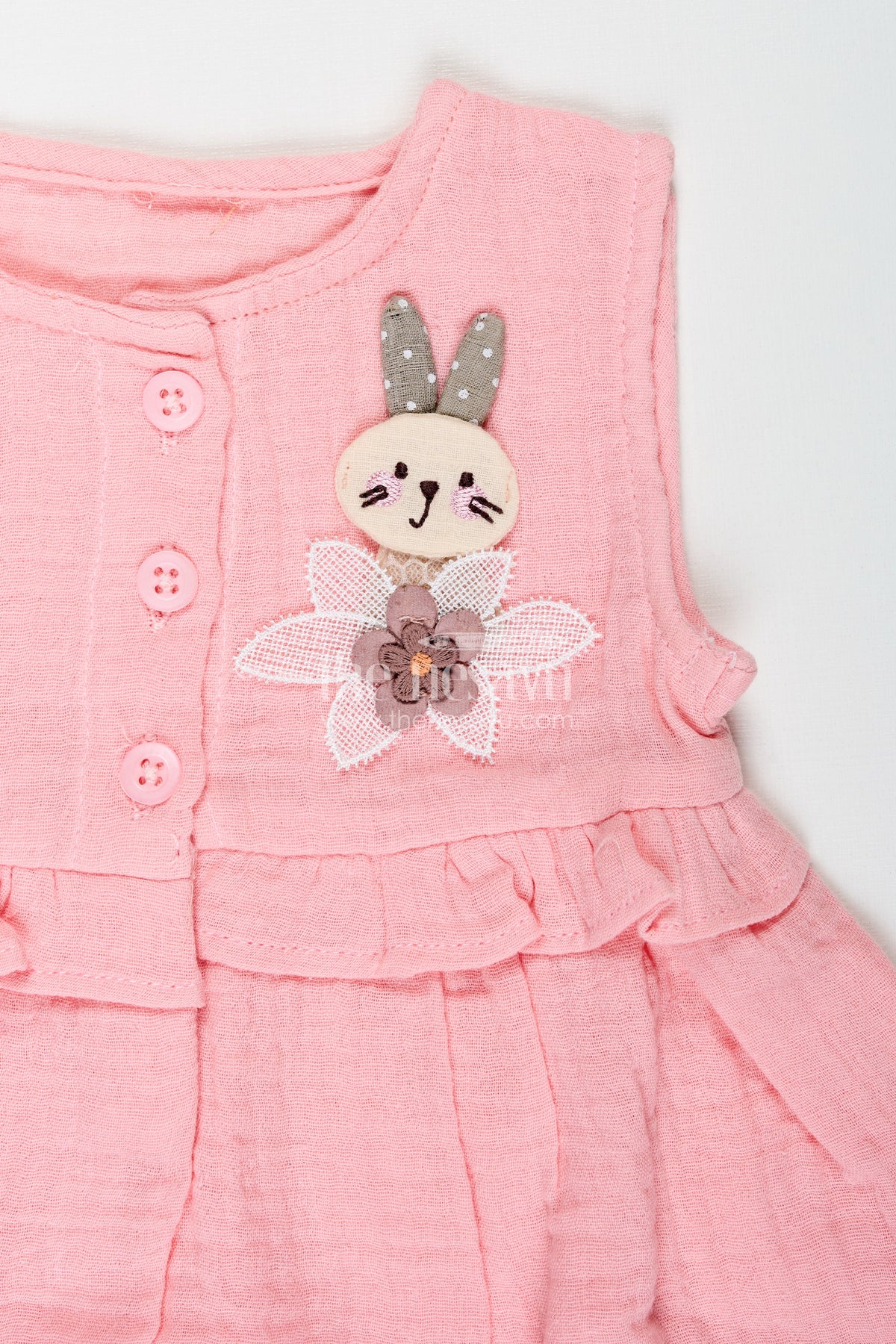 Everyday cotton dress for baby girls with cute bunny embroidery is perfect for playful summer days. Made from soft and breathable muslin cotton, this pink frock offers supreme comfort and gentle texture against delicate baby skin. The adorable bunny and flower appliqué add a whimsical charm, while the sleeveless cut and ruffled bodice ensure a sweet and stylish silhouette. Designed for both comfort and cuteness, this dress is ideal for everyday activities, from playdates to park visits, keeping your little one happy and stylish all day.