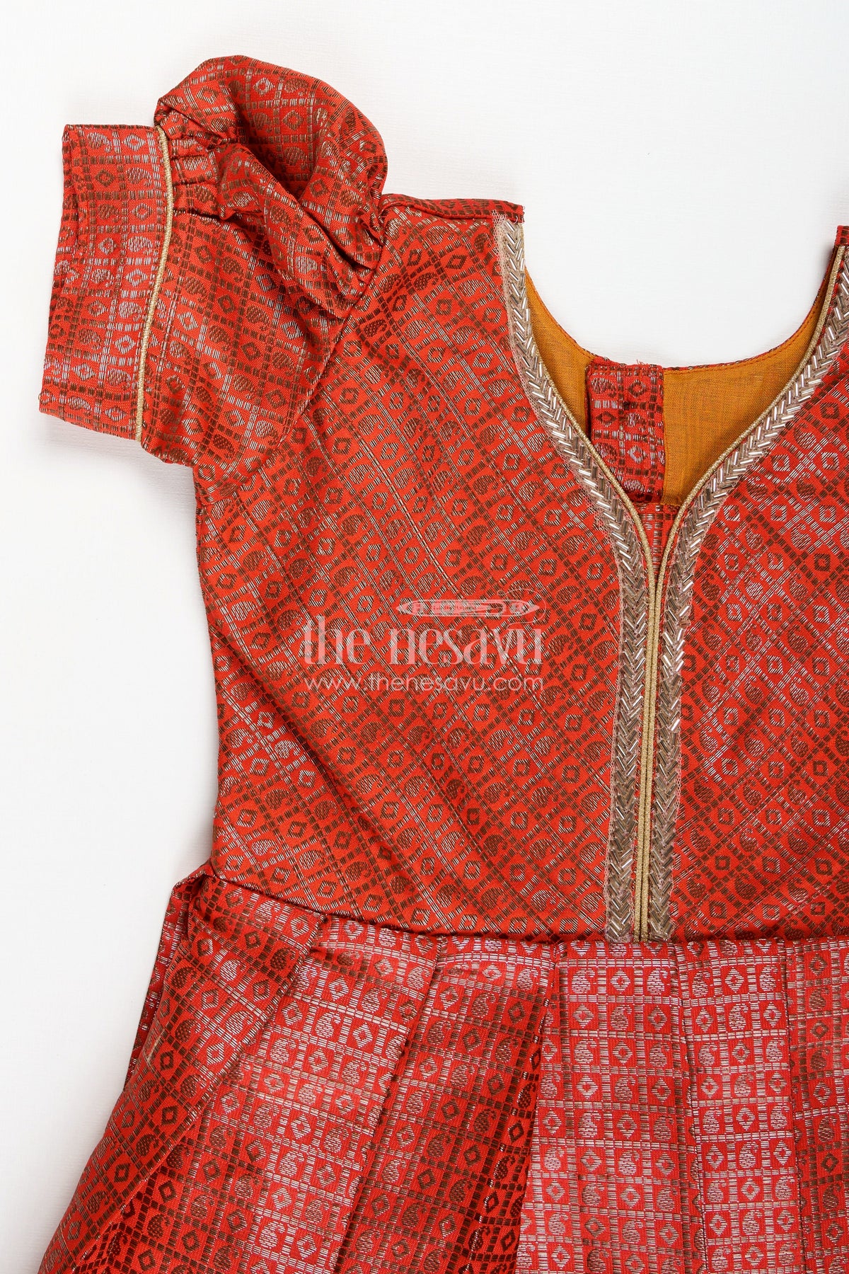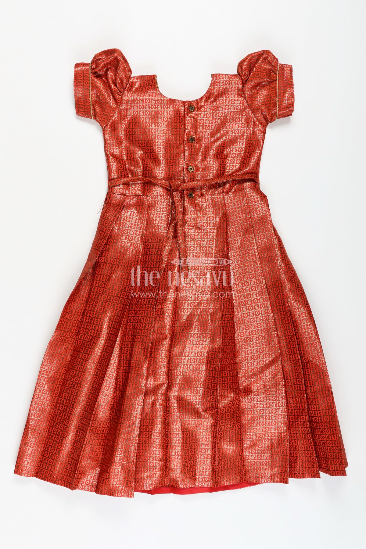 Anarkali dress design is reimagined in this rust-orange girls gown crafted from rich semi Banaras silk. The gown features intricate zari weaving all over, creating a majestic texture that’s ideal for festive and cultural events. With puff sleeves and golden piping at the neckline, the design maintains traditional grace while offering comfort and ease of wear. The flared pleated skirt brings volume and flow, perfect for celebrations that demand style with movement. Lined for comfort and finished with a back zip, this gown brings elegance, ease, and tradition together in one versatile silhouette.
