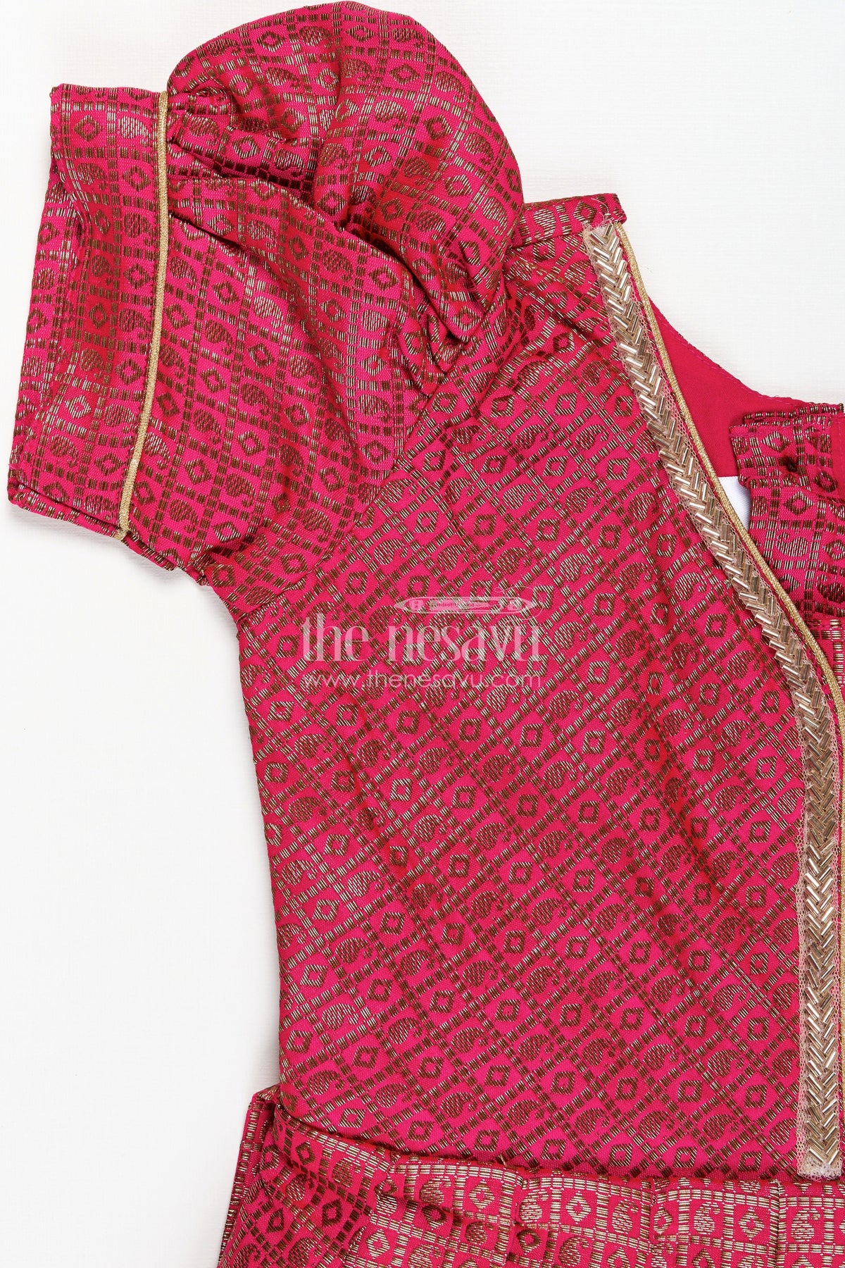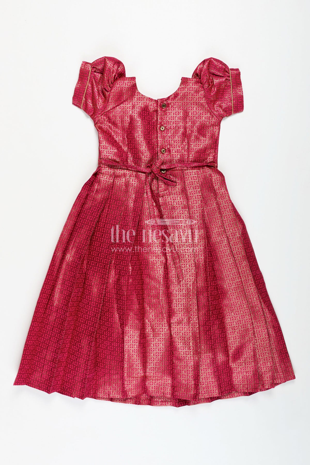 Anarkali dress for wedding occasions becomes a royal affair with this beautifully crafted girls gown in luxurious semi Banaras silk. The deep maroon fabric is adorned with rich gold zari brocade, offering an elegant shimmer that’s perfect for grand celebrations. Puff sleeves add a classic charm, while the box pleated flare ensures graceful twirls and free movement. Designed for comfort and style, this gown includes a breathable lining and an easy back zip closure. Whether it’s a family wedding or a traditional celebration, this Anarkali gown blends comfort, culture, and regal beauty for your little one.