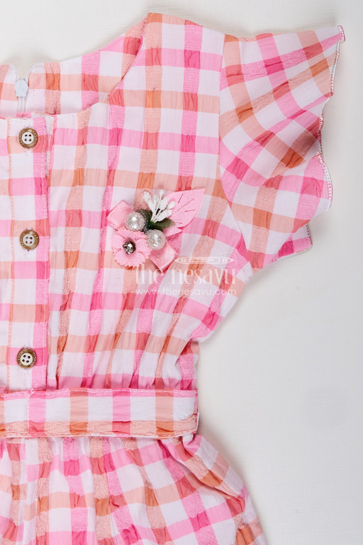 Girls Comfortable Cotton Playsuit for Everyday Use is designed to keep your little one cool and cheerful all day long. Made from breathable seersucker cotton, this playsuit features a vibrant pink checked pattern that adds charm and a playful vibe to her outfit. The soft fabric and short sleeves make it ideal for daily adventures, while the fluttery sleeves, waist belt, and floral applique offer a cute and polished look. Lightweight and easy to wear, this playsuit ensures maximum comfort whether she’s at home, school, or out on a playdate. A front button-up closure adds a touch of classic style and makes dressing simple and quick. It’s the perfect go-to choice for active little girls who love comfort without compromising on cuteness.