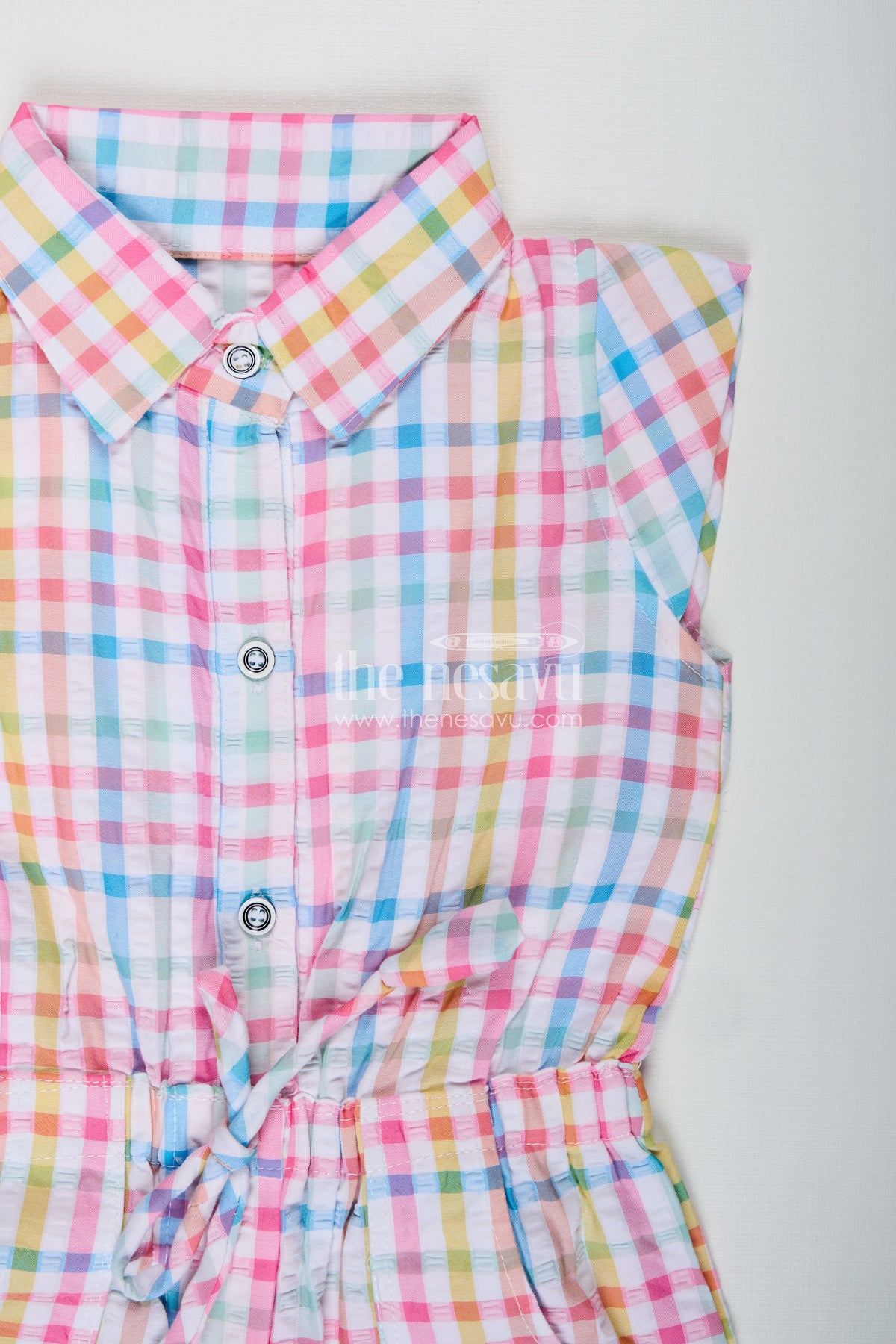 - Design: Checked pattern, ruffle hem, drawstring waist, collar neck