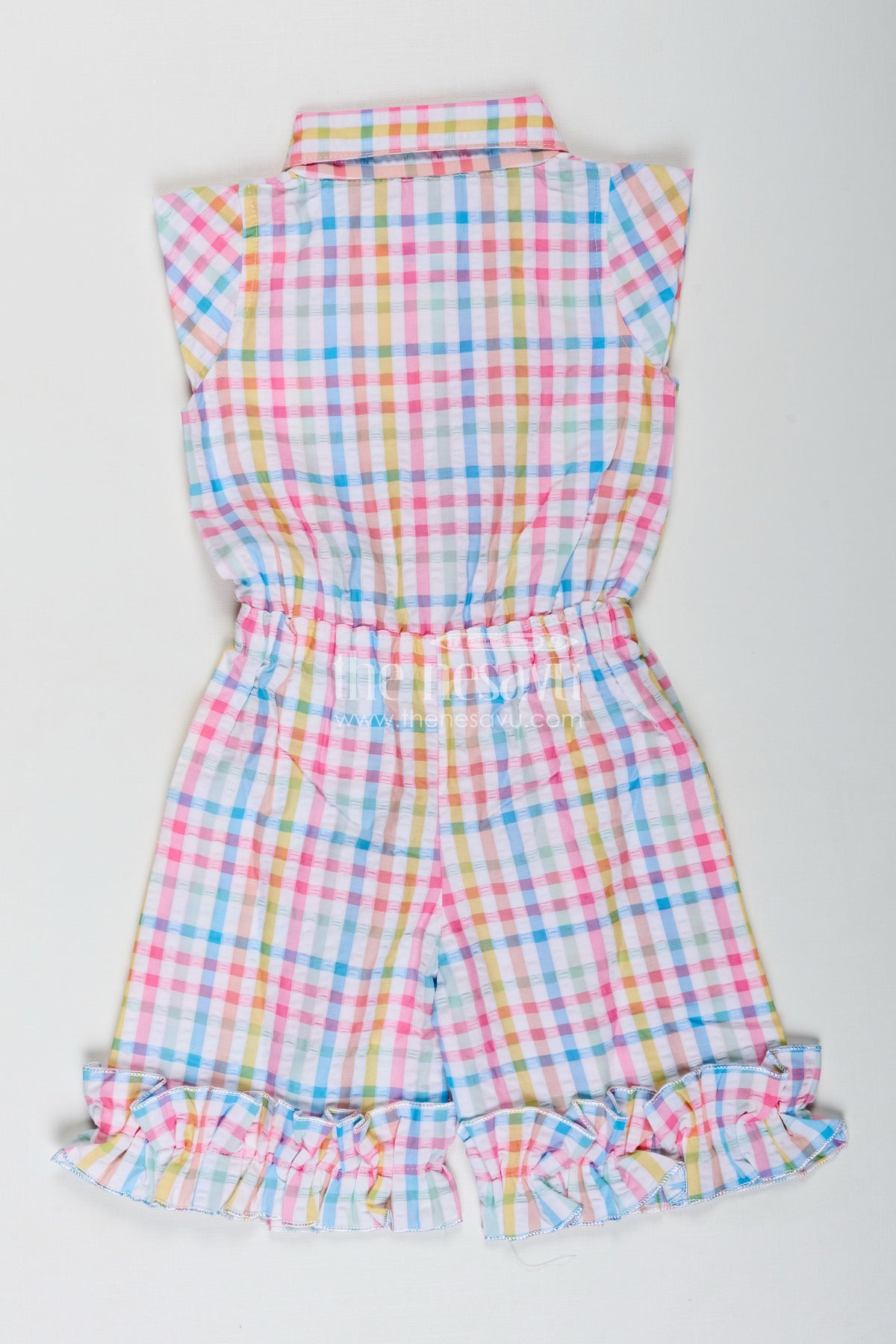 Girls Cotton Short Jumpsuit for Summer Play is the perfect blend of playful charm and all-day comfort. Featuring a multicolor checked pattern, this seersucker cotton jumpsuit is designed for freedom of movement and breathability. The sleeveless design and classic collar make it a timeless choice, while the elastic waist with tie and ruffle trim at the hem adds an extra layer of fun. It’s ideal for beach outings, park adventures, or simply lounging at home during warm weather. The lightweight material feels soft against the skin and holds up well to regular play and washes. Functional pockets add practicality, and the button-front makes dressing hassle-free. A must-have for any little girl's summer collection.