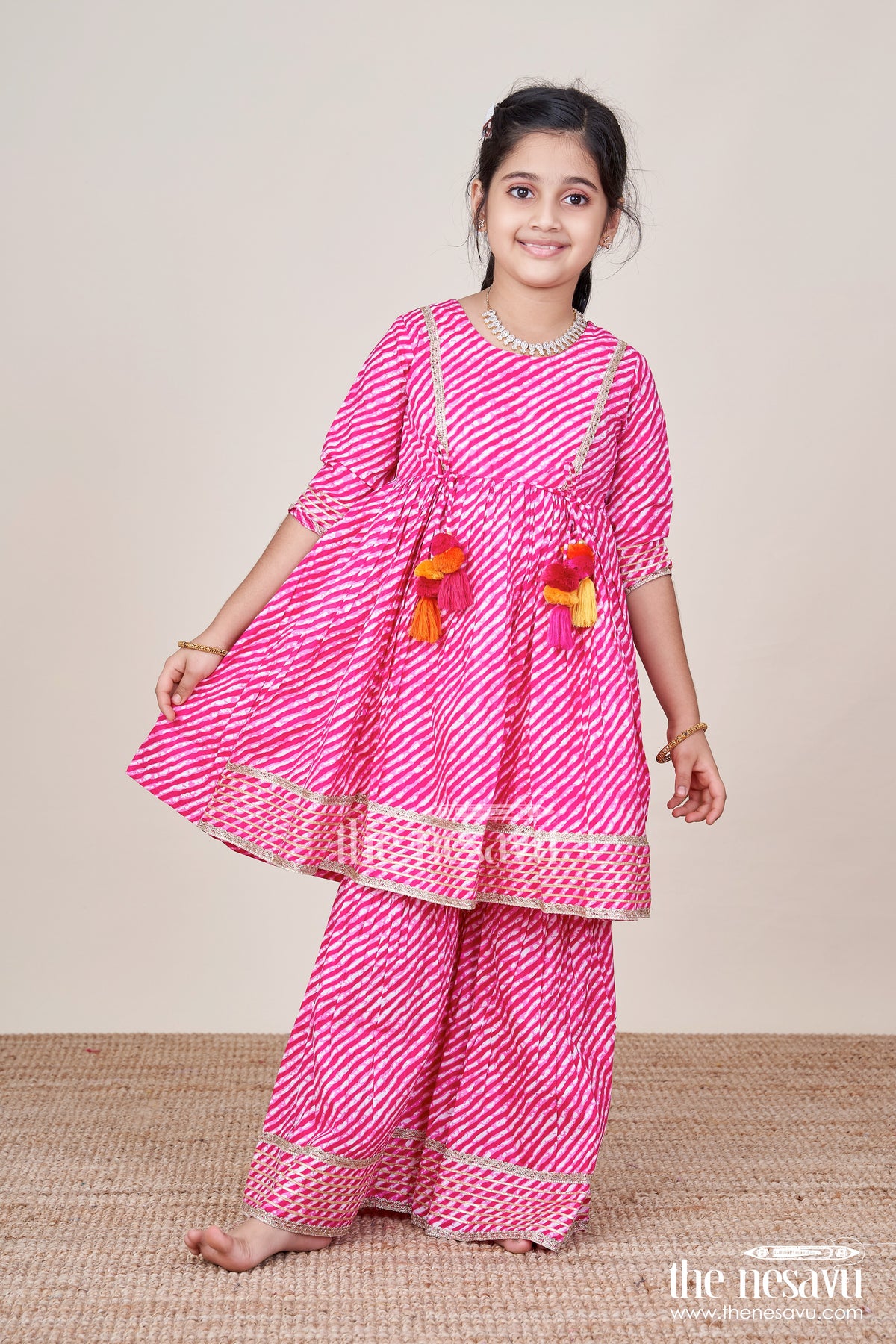 The Nesavu Girls Sharara / Plazo Set Girls cotton tie-dye sharara set for festive celebrations Nesavu Nesavu girls cotton tie-dye sharara set tassels  perfect festive outfit birthdays Navratri