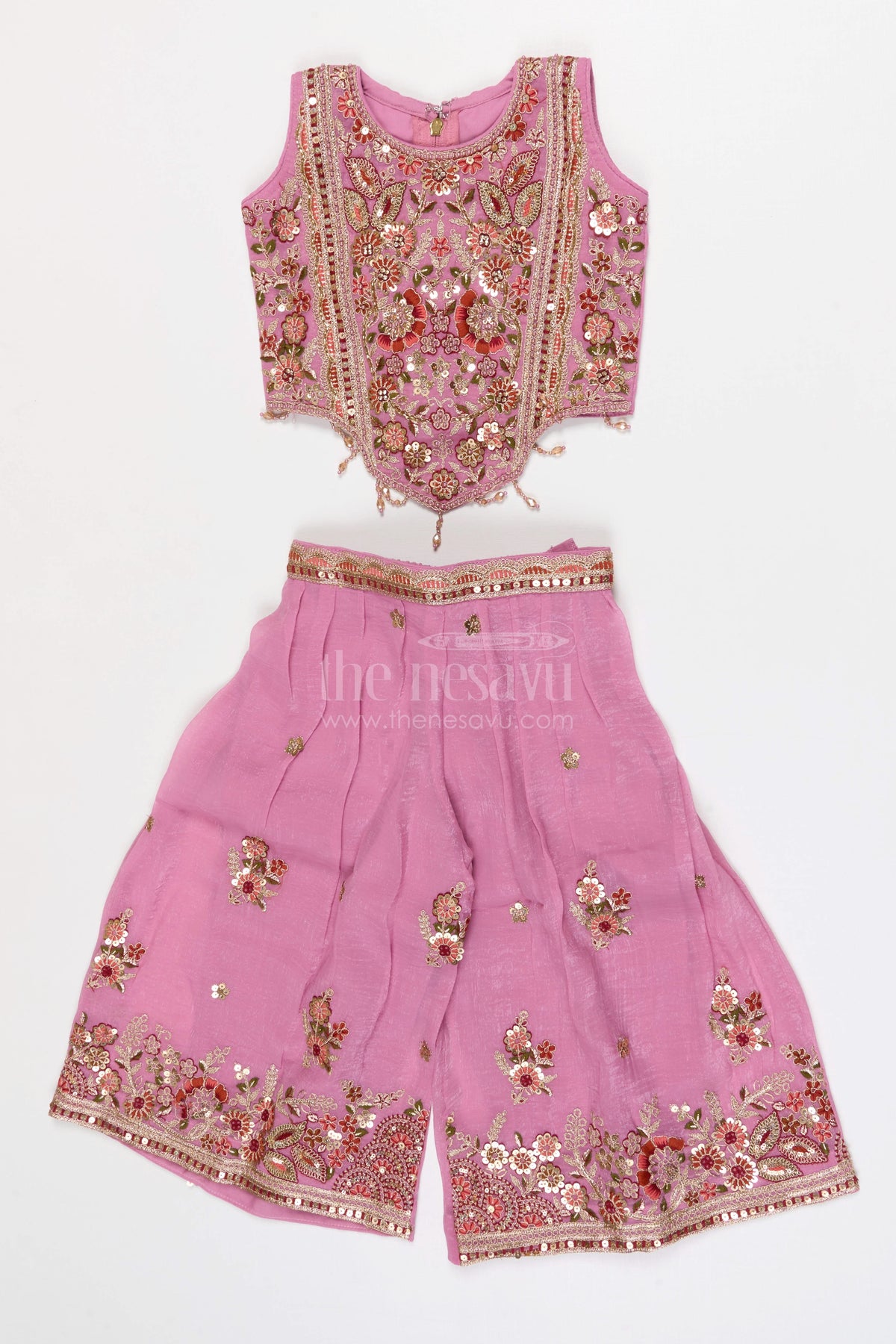 The sleeveless embroidered top adds a traditional festive touch with detailed craftsmanship