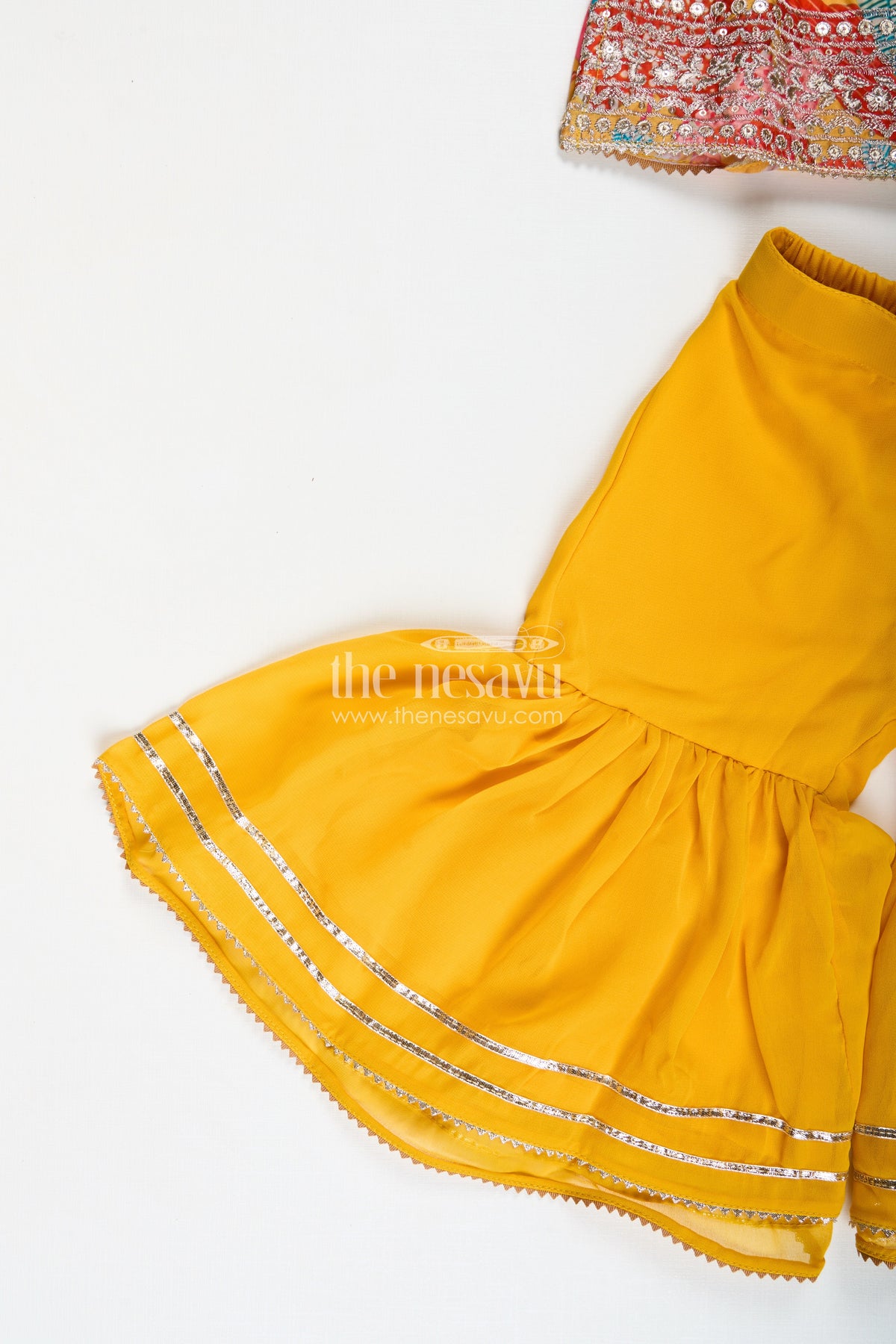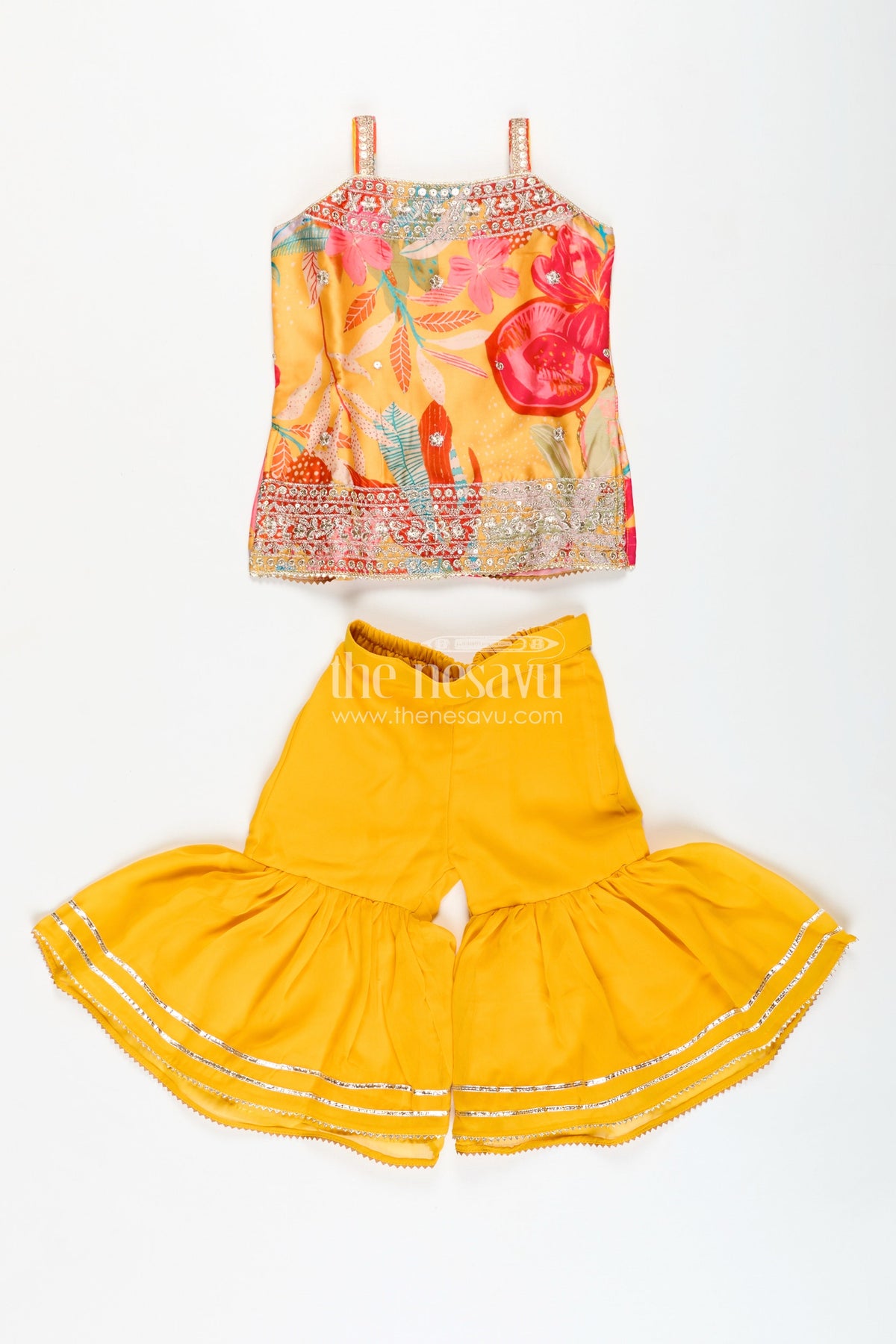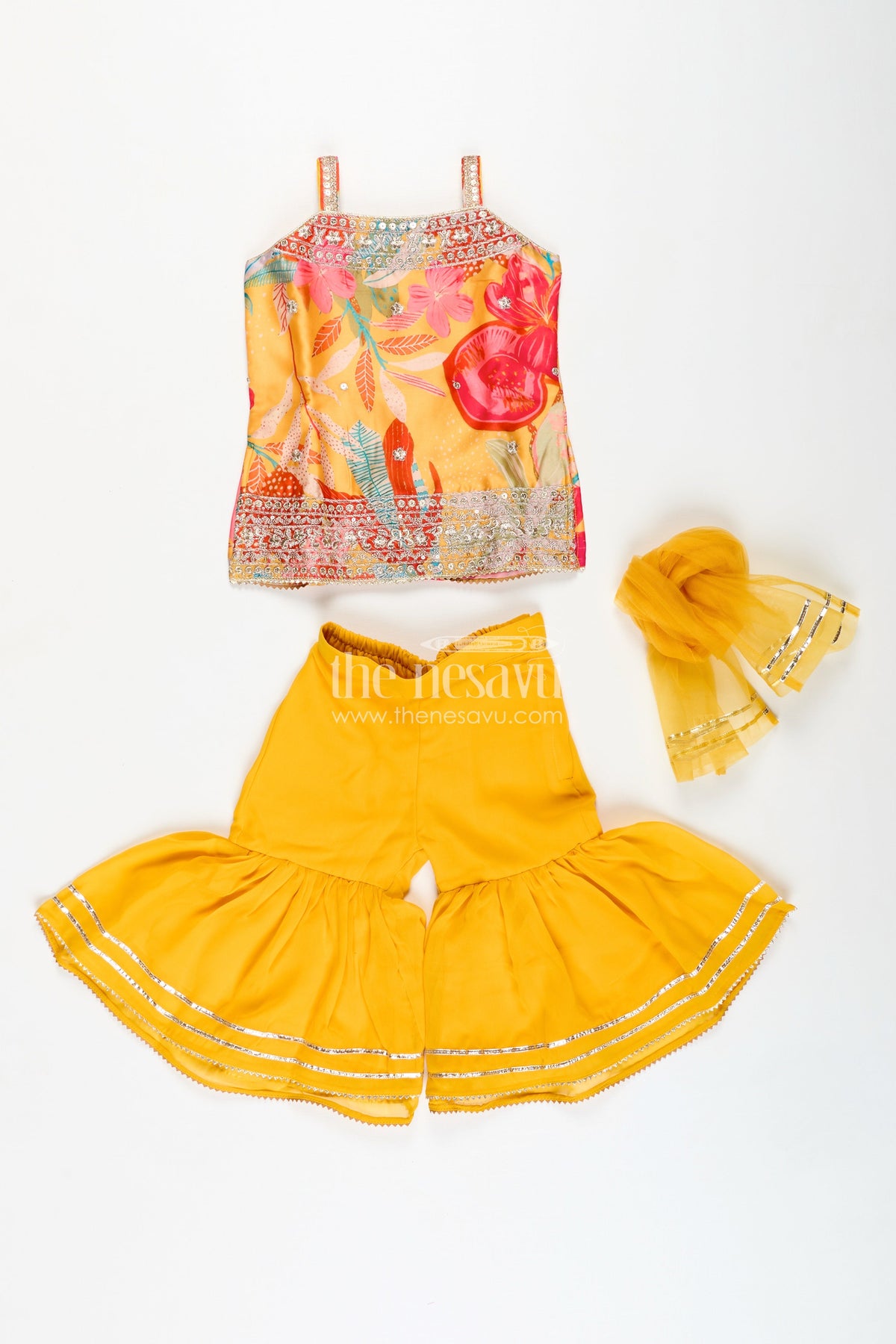 Girls Designer Sharara Suit in vibrant yellow is a statement piece that blends tradition with bold style. The digital printed chinon top is adorned with multicolor floral motifs and mirror-style embellishments, while the ruffled sharara pants bring volume and movement. A matching dupatta completes the coordinated look. This set offers breathable comfort and vivid appeal, making it an excellent option for cultural events, school performances, and festive days. The elastic waistband provides flexibility and ease, and the soft chinon fabric allows free movement without compromising elegance. It's a beautiful mix of tradition and flair designed for young fashionistas who love to stand out.