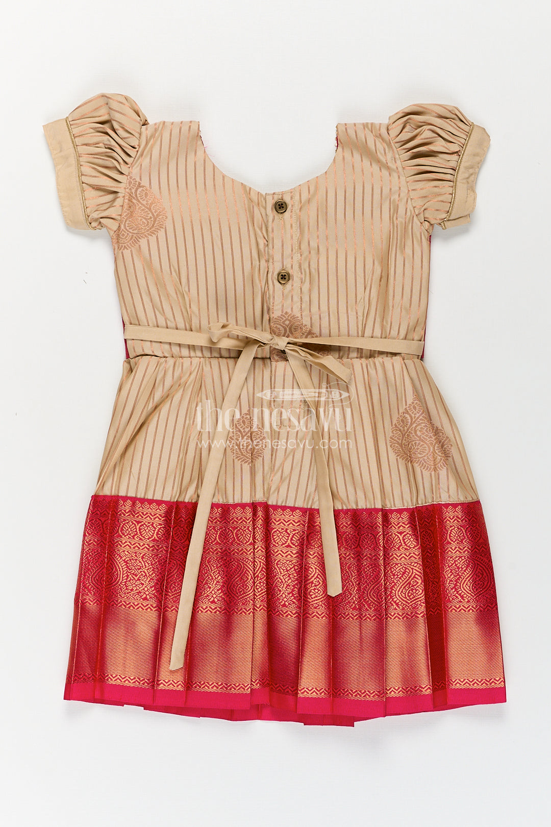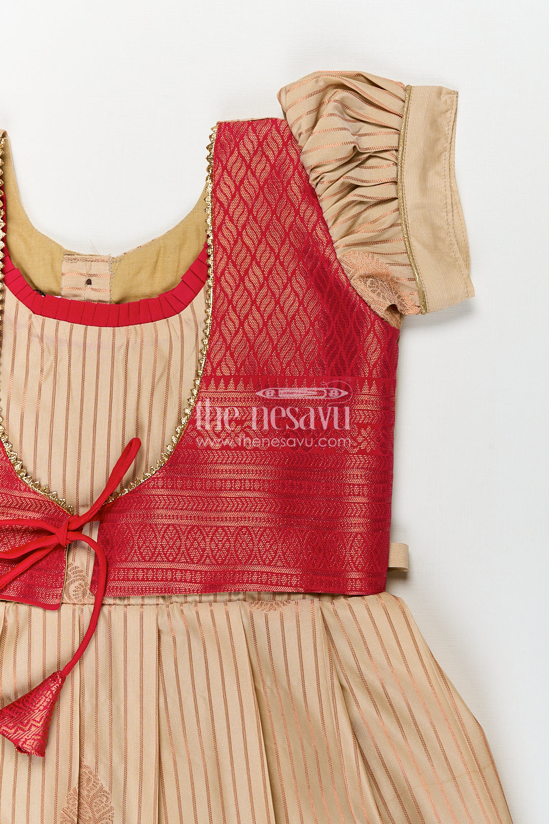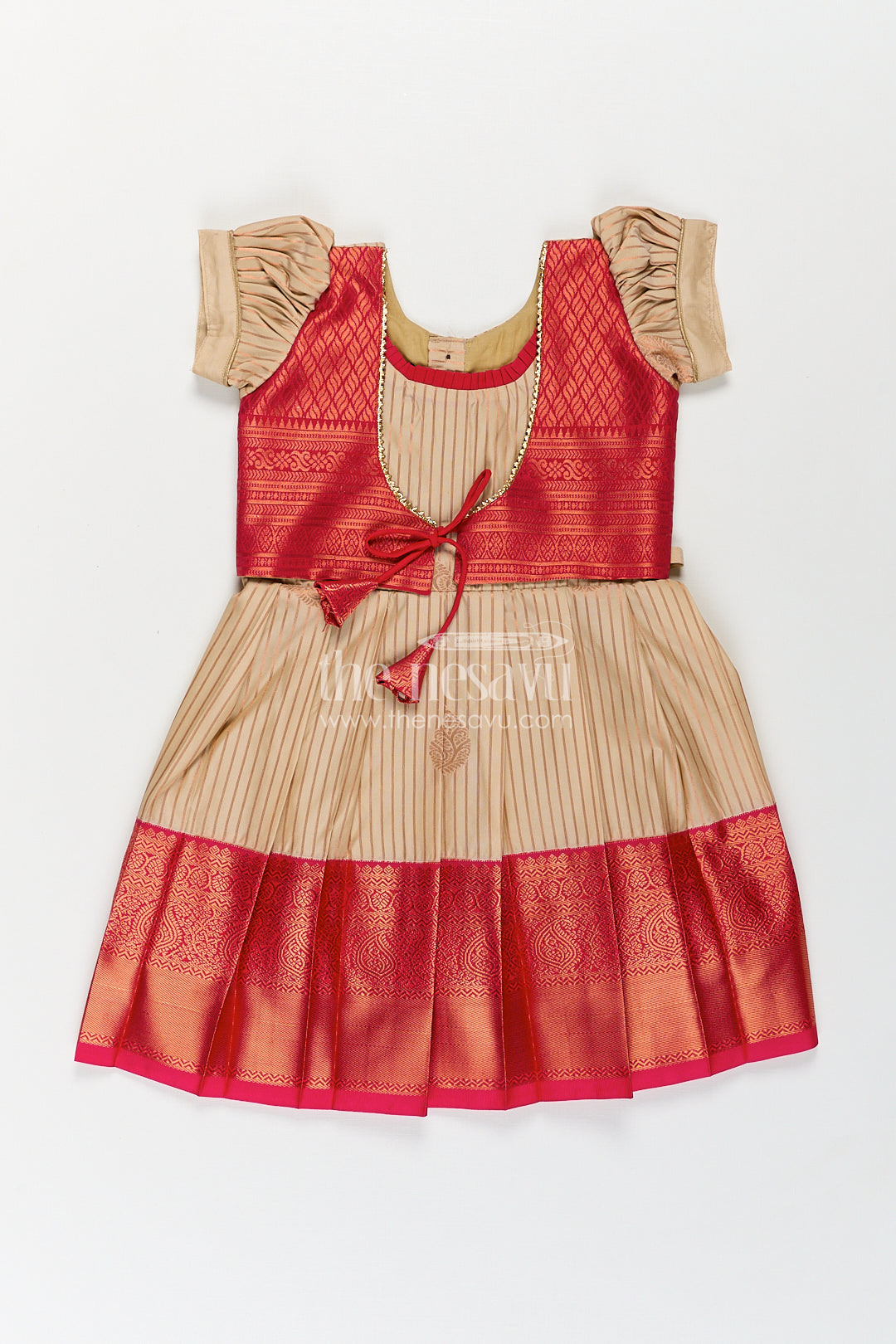 This elegant frock design with silk saree styling is crafted to bring the beauty of traditional Indian attire to young girls in a charming and comfortable format. Made from luxurious semi kanchivaram silk, this frock features a smooth cream body enhanced by vertical zari stripes that replicate the graceful look of a classic saree. The bold red overlay bodice with woven diamond patterns adds richness, paired beautifully with short puff sleeves for a playful yet traditional silhouette. The pleated skirt is finished with a wide red zari border that completes the silk saree-inspired design, making this frock ideal for weddings, cultural festivals, or family ceremonies. With its soft fabric, intricate craftsmanship, and breathable fit, this frock balances festive grandeur with ease of wear. It's a standout piece that celebrates heritage in a child-friendly design.