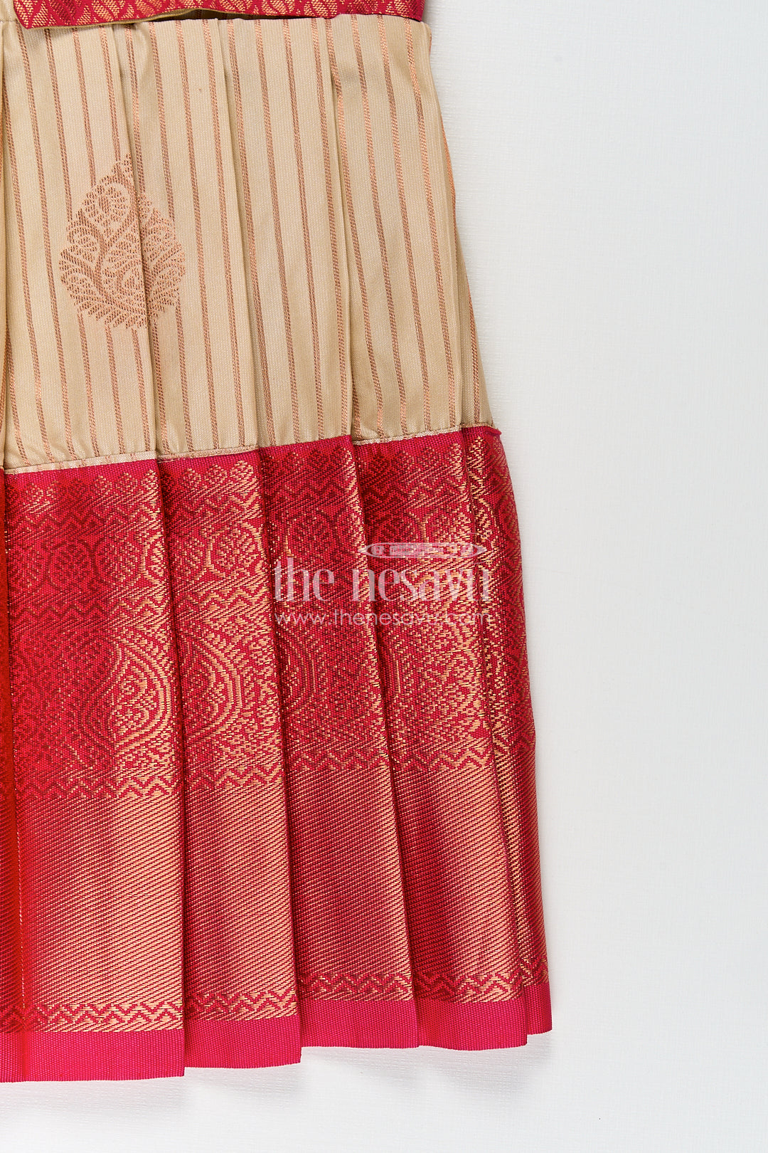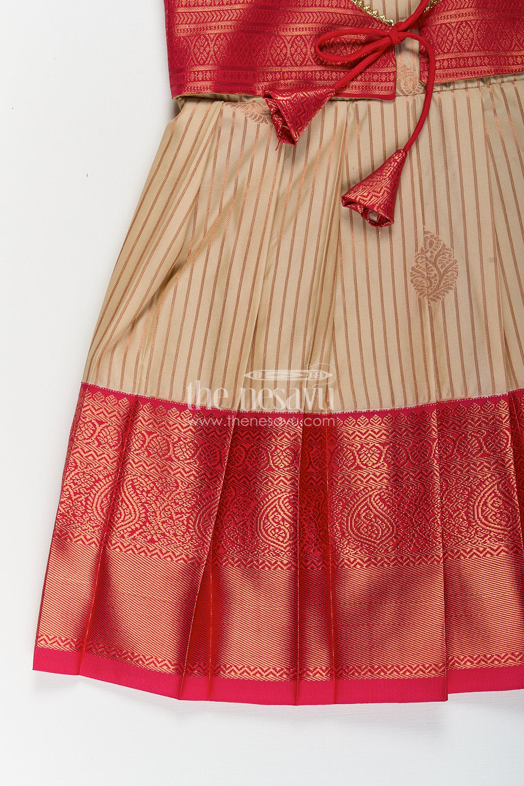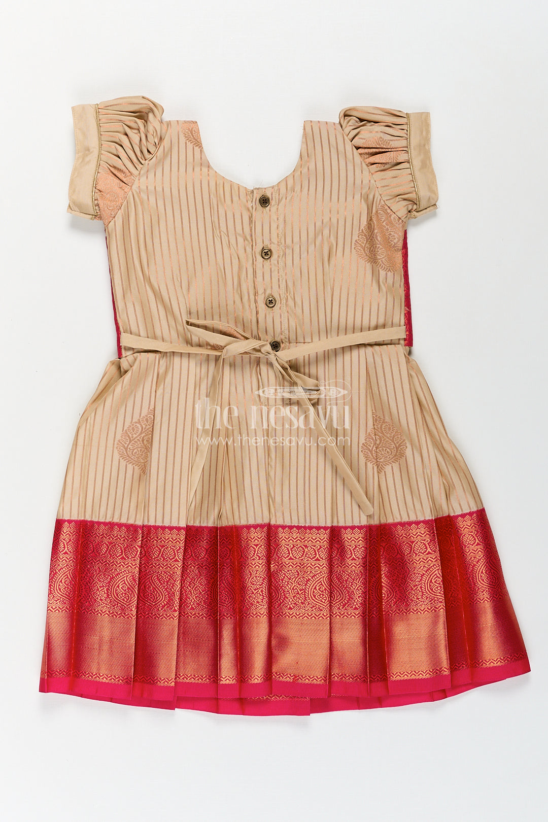 This elegant frock design with silk saree styling is crafted to bring the beauty of traditional Indian attire to young girls in a charming and comfortable format. Made from luxurious semi kanchivaram silk, this frock features a smooth cream body enhanced by vertical zari stripes that replicate the graceful look of a classic saree. The bold red overlay bodice with woven diamond patterns adds richness, paired beautifully with short puff sleeves for a playful yet traditional silhouette. The pleated skirt is finished with a wide red zari border that completes the silk saree-inspired design, making this frock ideal for weddings, cultural festivals, or family ceremonies. With its soft fabric, intricate craftsmanship, and breathable fit, this frock balances festive grandeur with ease of wear. It's a standout piece that celebrates heritage in a child-friendly design.