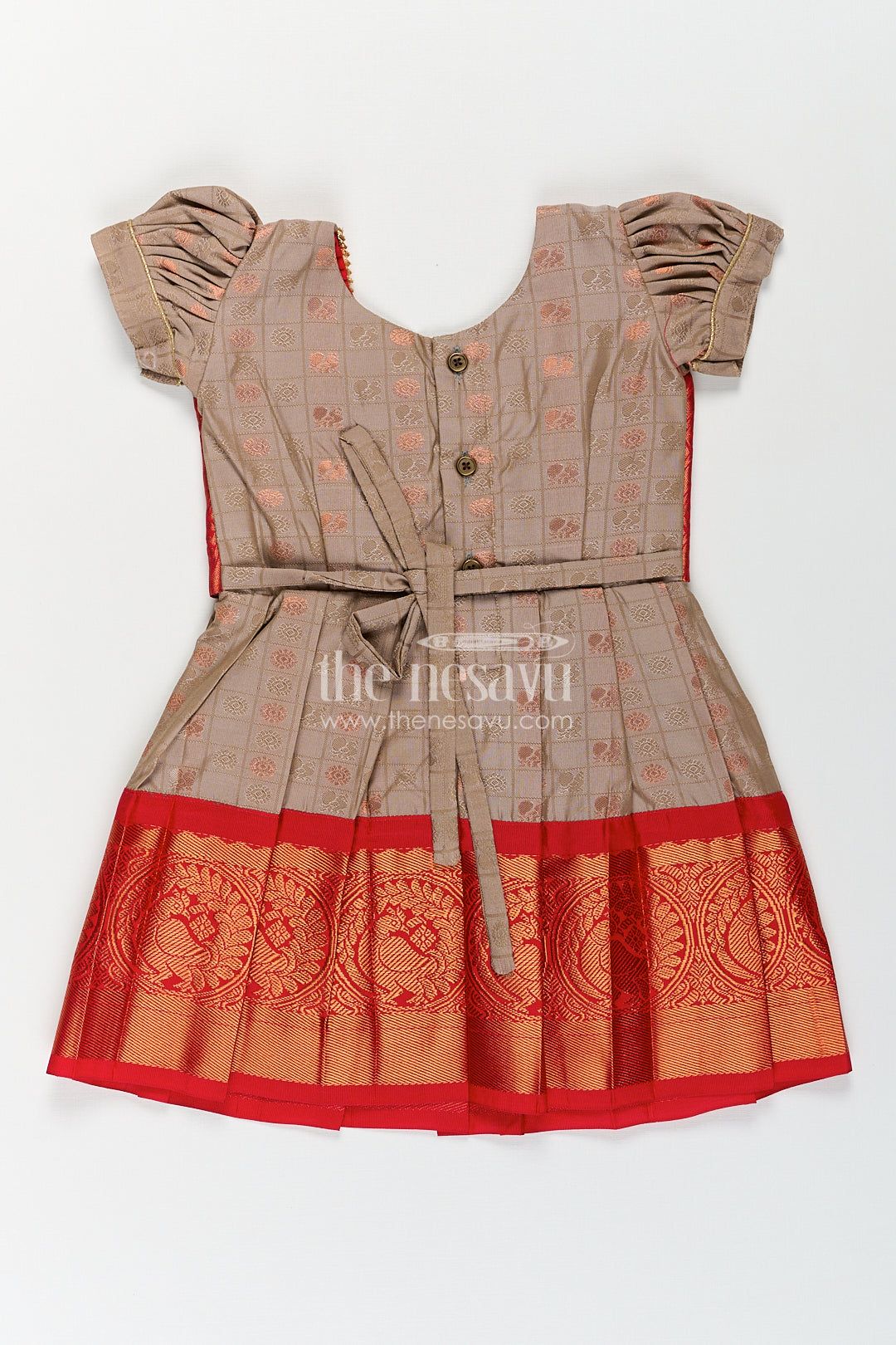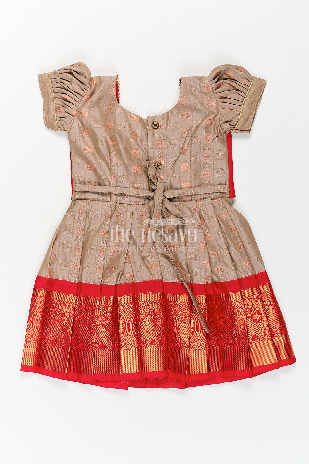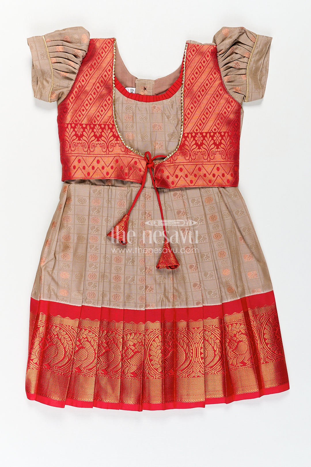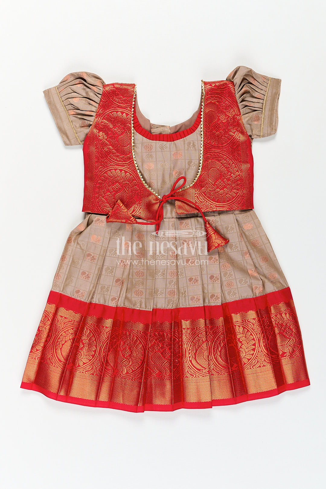 The Nesavu Girls Kanchi Silk Frock Girls Kanchivaram Soft Silk Frocks with Beige Body Red Puff Sleeves and Rich Zari Woven Hemline Nesavu 16 (1Y) / Gray / Style 3 SF836CC-16 Nesavu Girls Soft Silk Frocks Beige Red Kanchivaram Style Puff Sleeves Zari Border