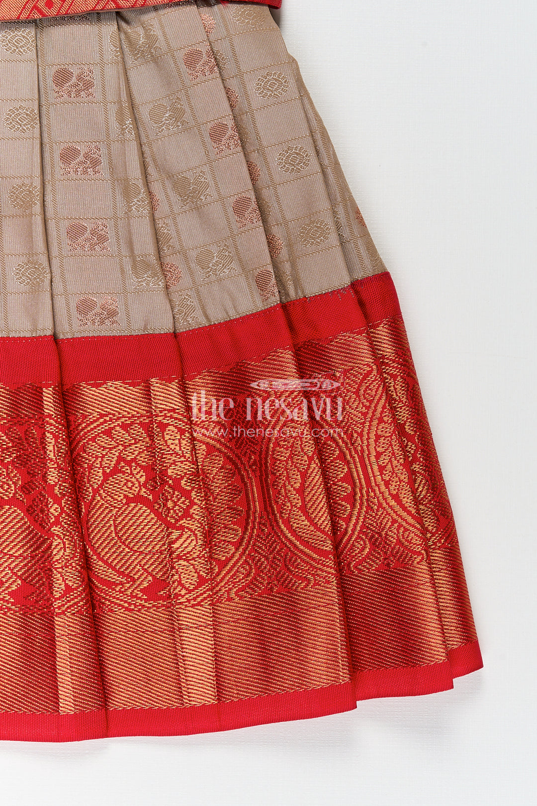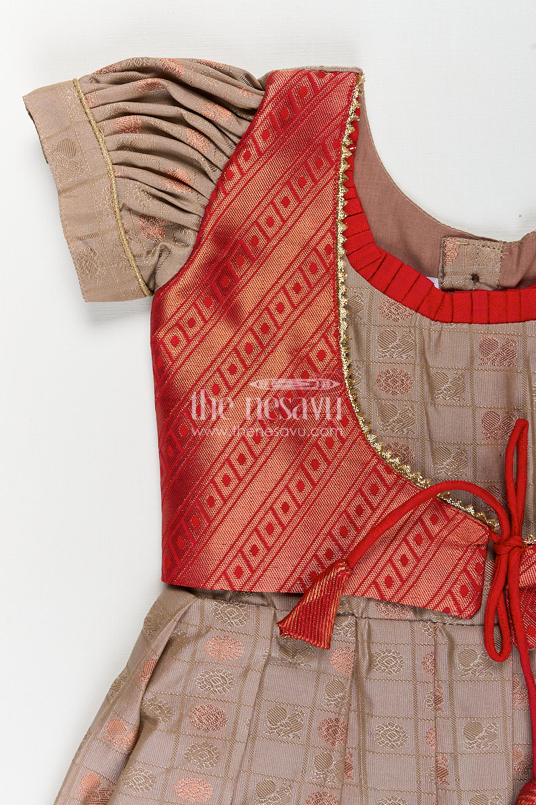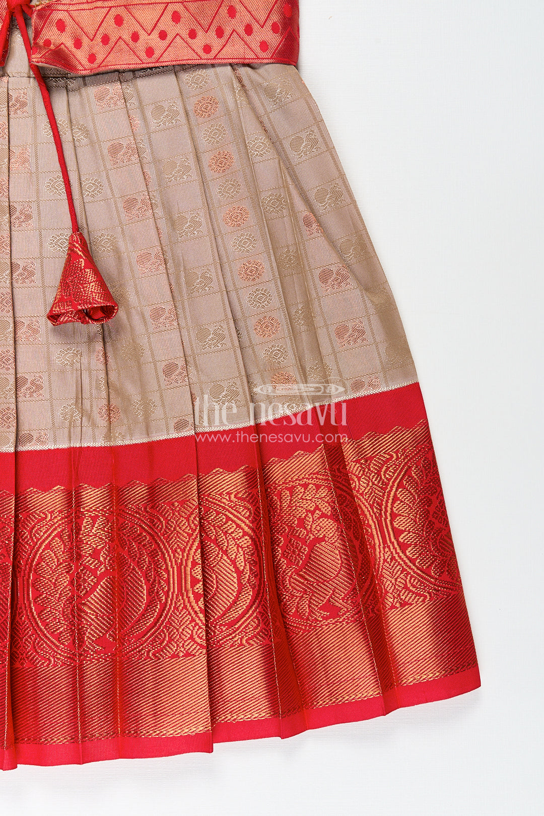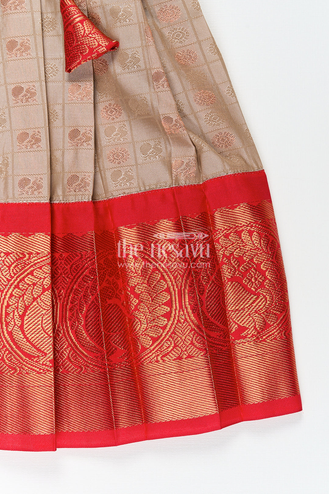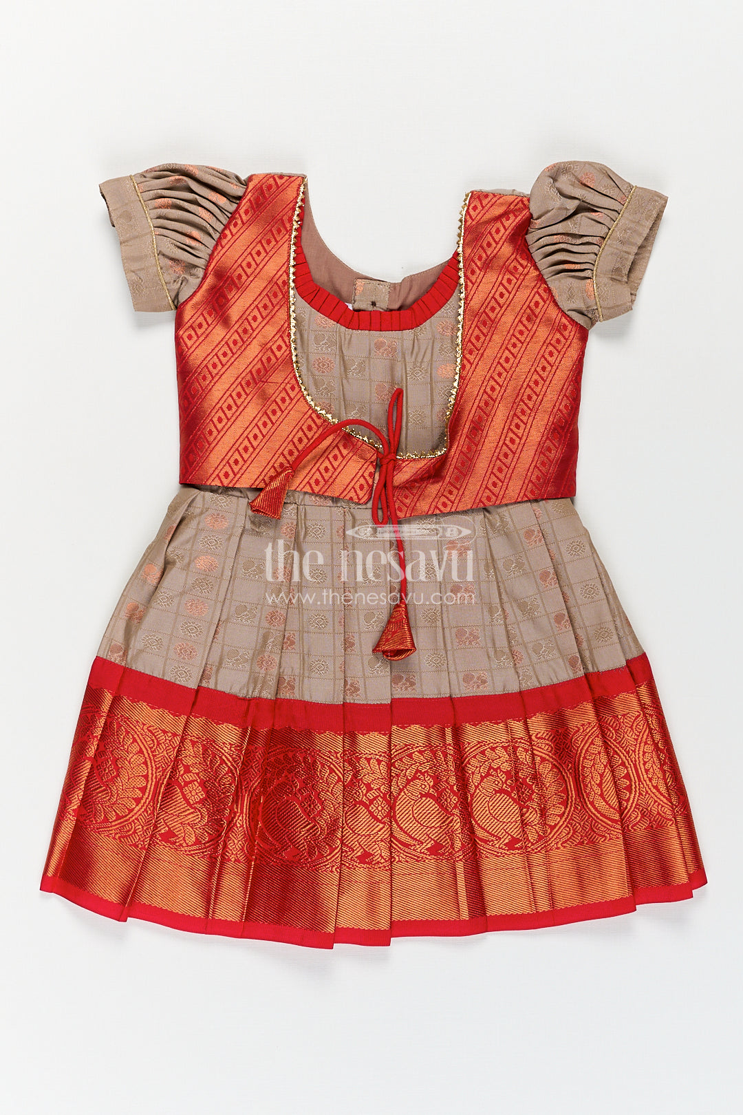The Nesavu Girls Kanchi Silk Frock Girls Kanchivaram Soft Silk Frocks with Beige Body Red Puff Sleeves and Rich Zari Woven Hemline Nesavu 16 (1Y) / Gray / Style 3 SF836CC-16 Nesavu Girls Soft Silk Frocks Beige Red Kanchivaram Style Puff Sleeves Zari Border
