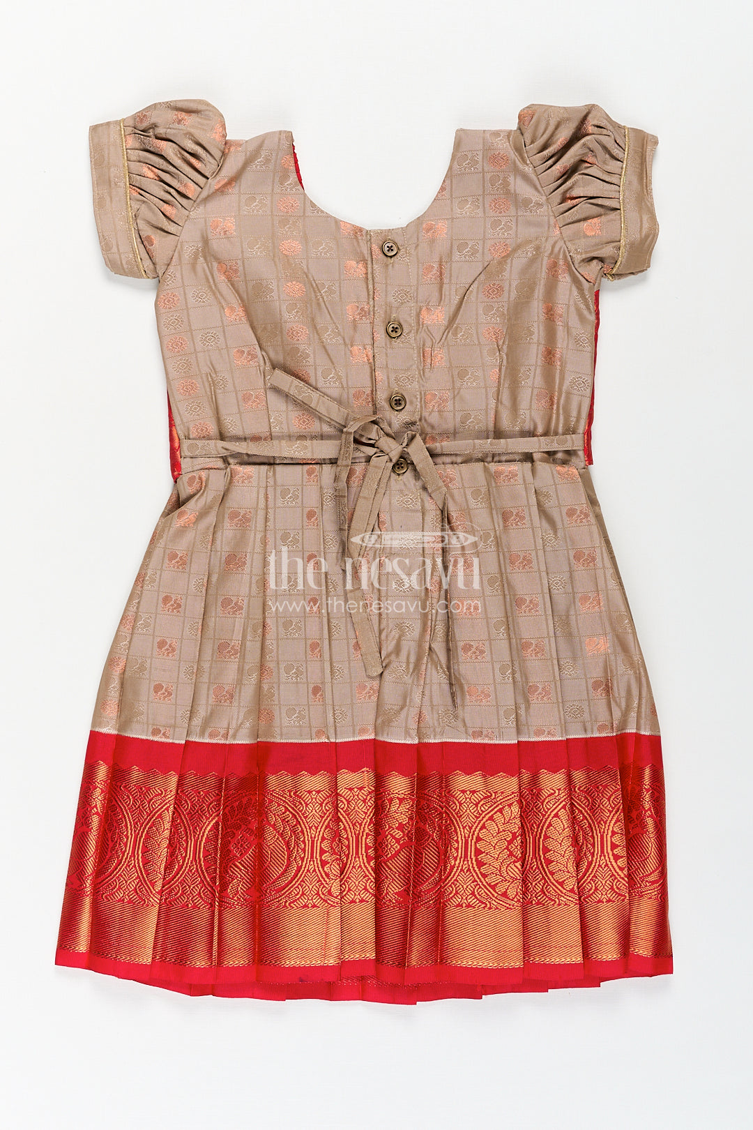 The Nesavu Girls Kanchi Silk Frock Girls Kanchivaram Soft Silk Frocks with Beige Body Red Puff Sleeves and Rich Zari Woven Hemline Nesavu 16 (1Y) / Gray / Style 1 SF836CA-16 Nesavu Girls Soft Silk Frocks Beige Red Kanchivaram Style Puff Sleeves Zari Border