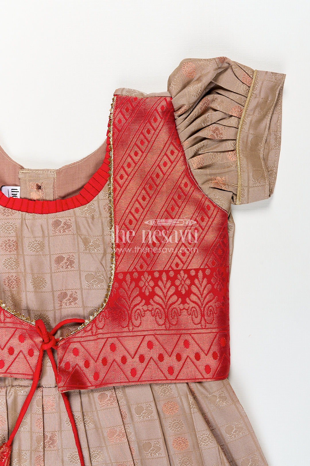 The Nesavu Girls Kanchi Silk Frock Girls Kanchivaram Soft Silk Frocks with Beige Body Red Puff Sleeves and Rich Zari Woven Hemline Nesavu Nesavu Girls Soft Silk Frocks Beige Red Kanchivaram Style Puff Sleeves Zari Border