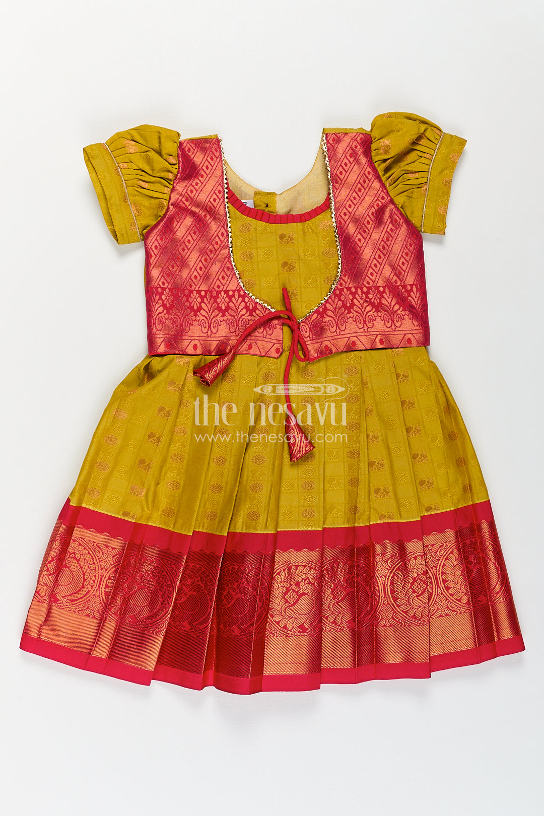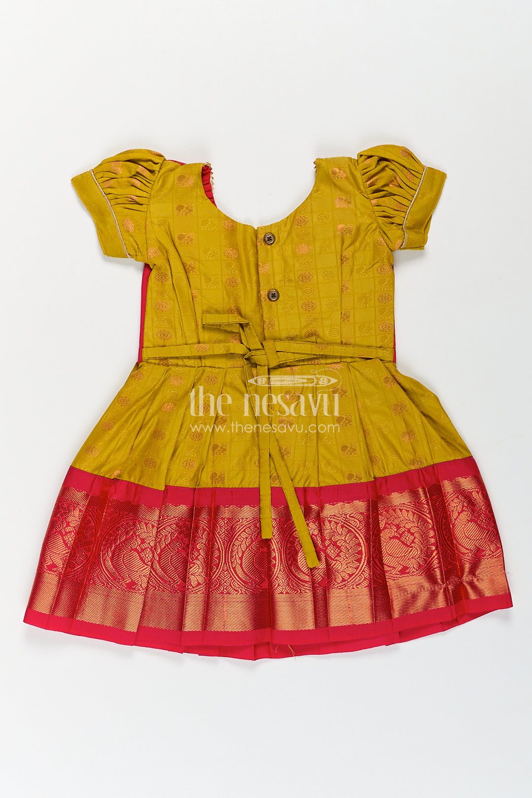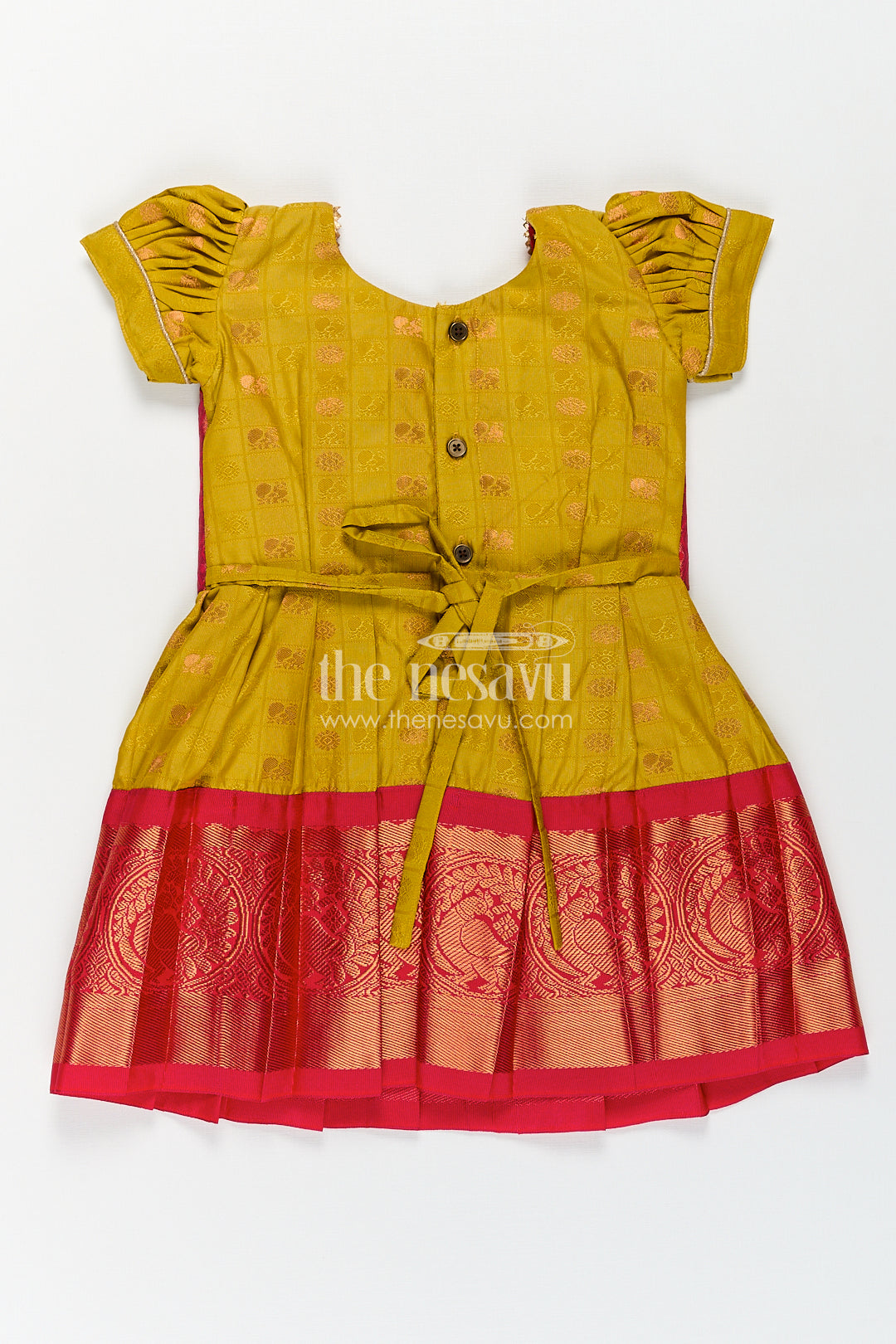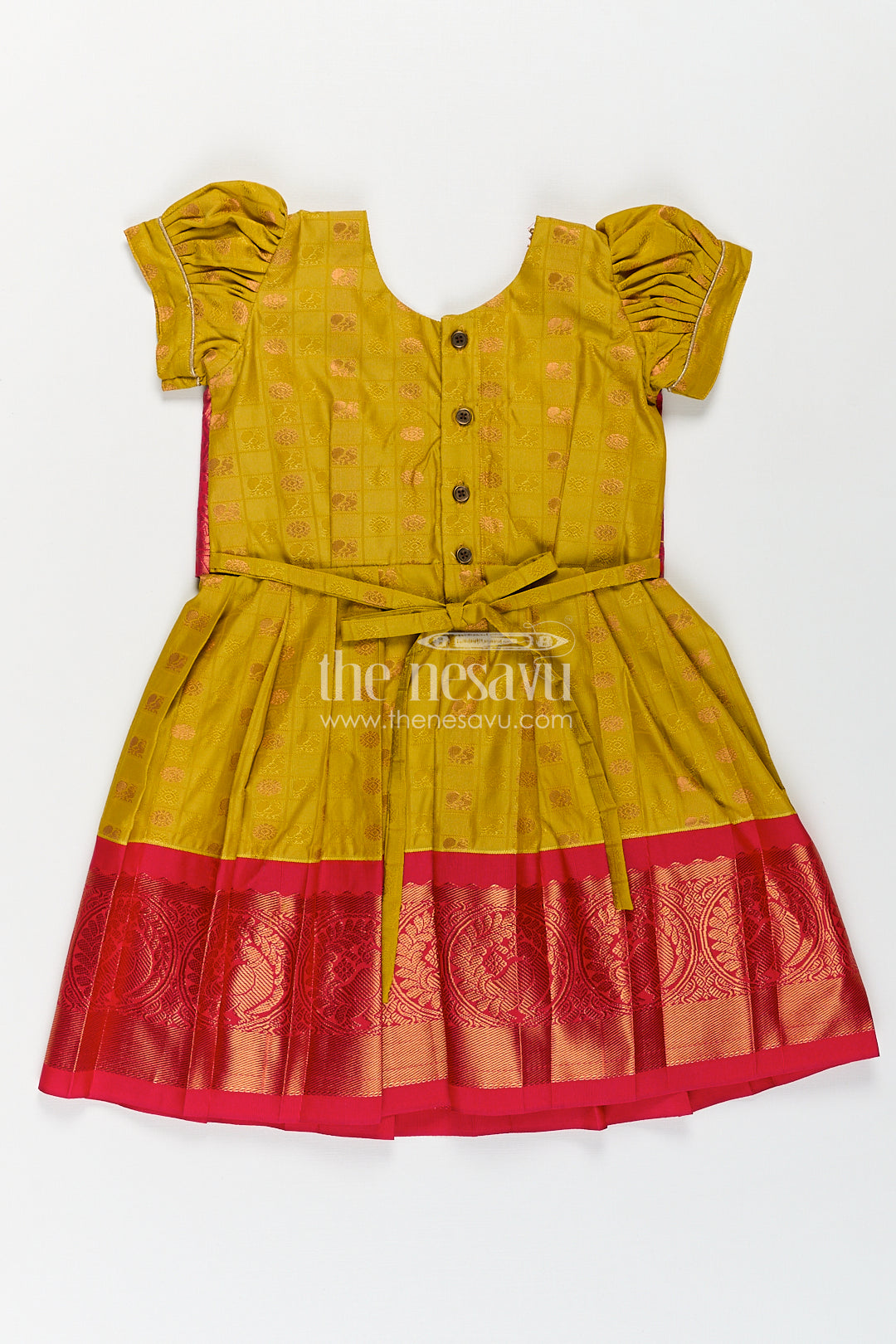 The Nesavu Girls Kanchi Silk Frock Girls Kanchivaram Yellow Silk Frock with Puff Sleeves and Contrast Maroon Zari Woven Border Design Nesavu Nesavu Girls Yellow Silk Frock Kanchivaram Style Maroon Zari Border Puff Sleeve Detailing