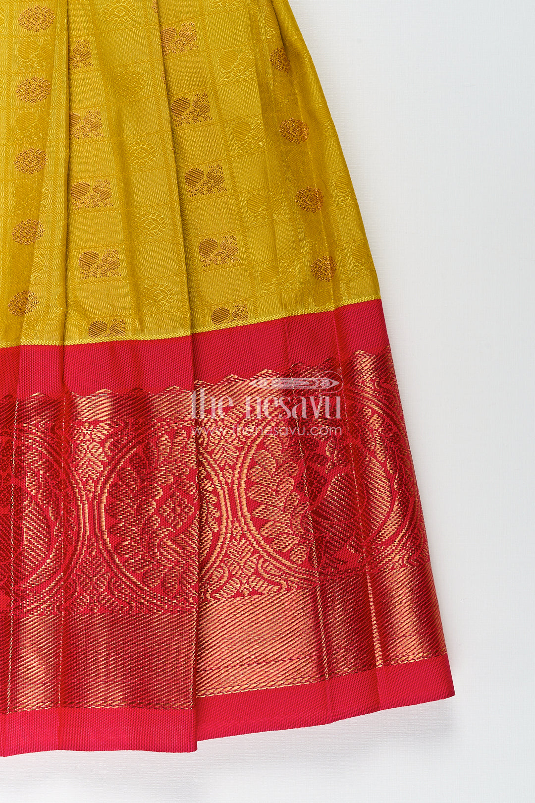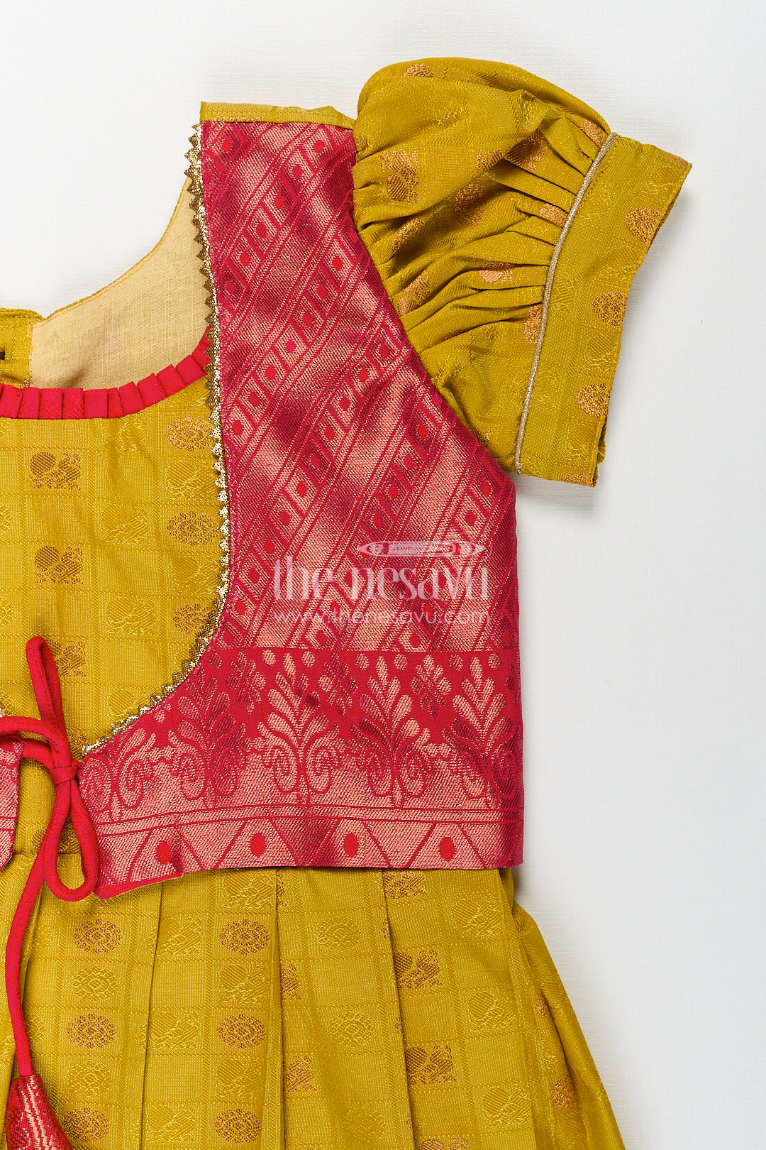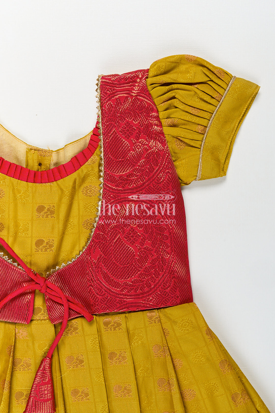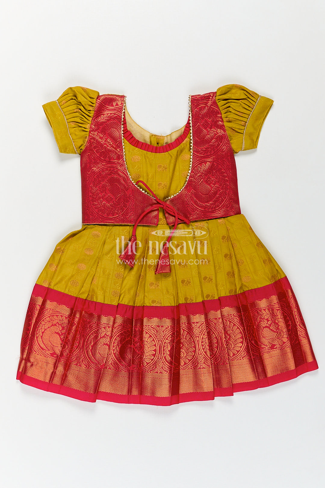 The Nesavu Girls Kanchi Silk Frock Girls Kanchivaram Yellow Silk Frock with Puff Sleeves and Contrast Maroon Zari Woven Border Design Nesavu Nesavu Girls Yellow Silk Frock Kanchivaram Style Maroon Zari Border Puff Sleeve Detailing