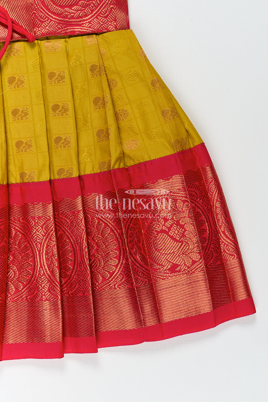 This vibrant yellow silk frock is a radiant choice for girls who love to shine in traditional elegance. Crafted from luxurious semi kanchivaram silk, the frock features a brilliant yellow body adorned with delicate golden motifs, creating a festive and graceful silhouette. The design includes short puff sleeves and a beautifully woven maroon overlay bodice, accented with a tie-up tassel detail at the front for added charm. The skirt showcases a broad maroon zari border with intricate traditional patterns, giving the outfit an opulent finish that is perfect for special occasions. Designed to offer both style and comfort, this frock allows easy movement and a breathable fit, making it ideal for long celebrations. The vibrant color palette and rich textures make this yellow silk frock a standout choice for weddings, festive functions, and cultural gatherings. Its timeless appeal ensures it becomes a cherished piece in any little girl’s traditional collection.
