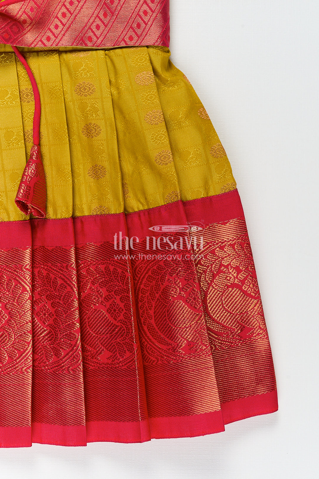 • Design: Zari woven skirt, traditional overlay bodice with tie tassels