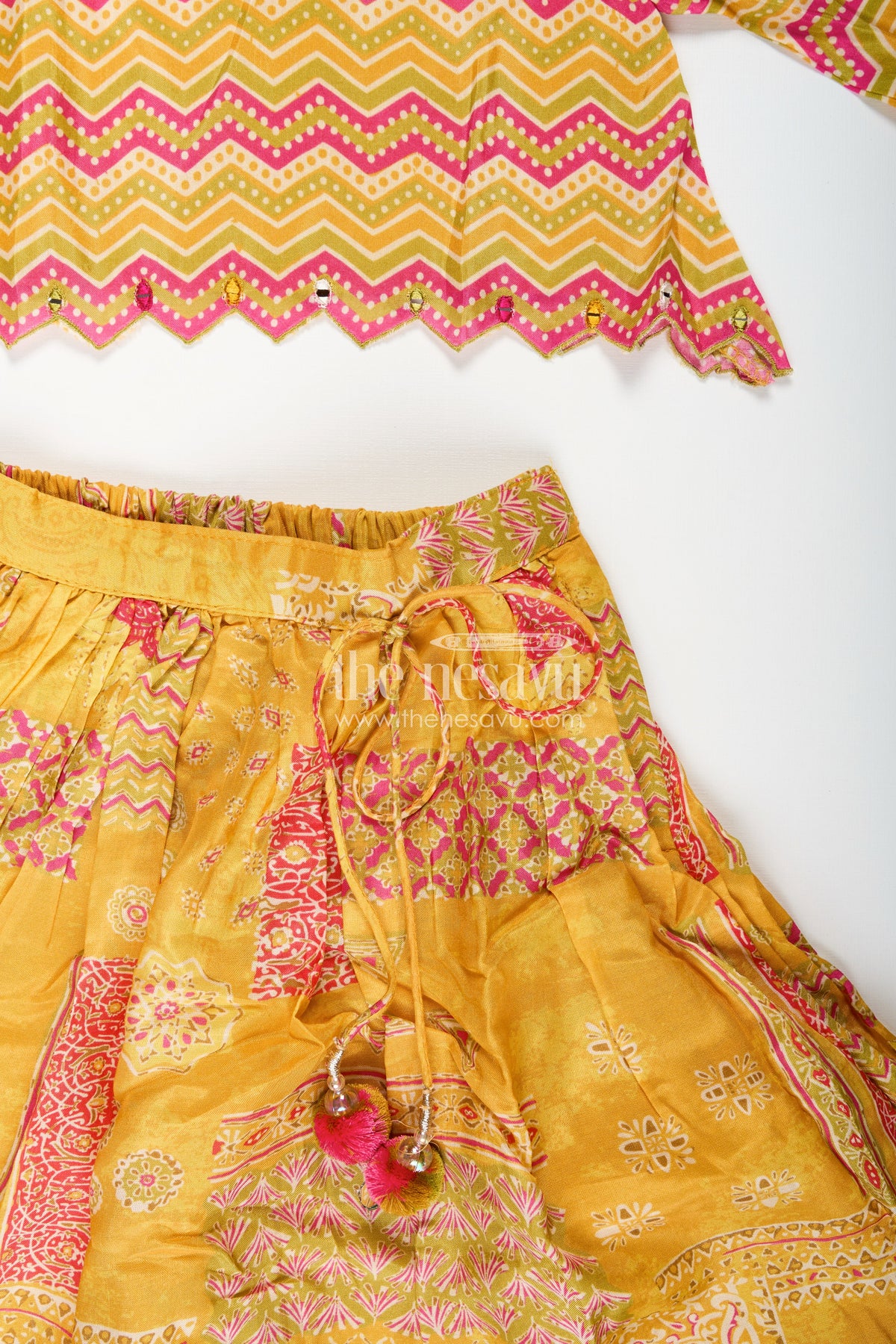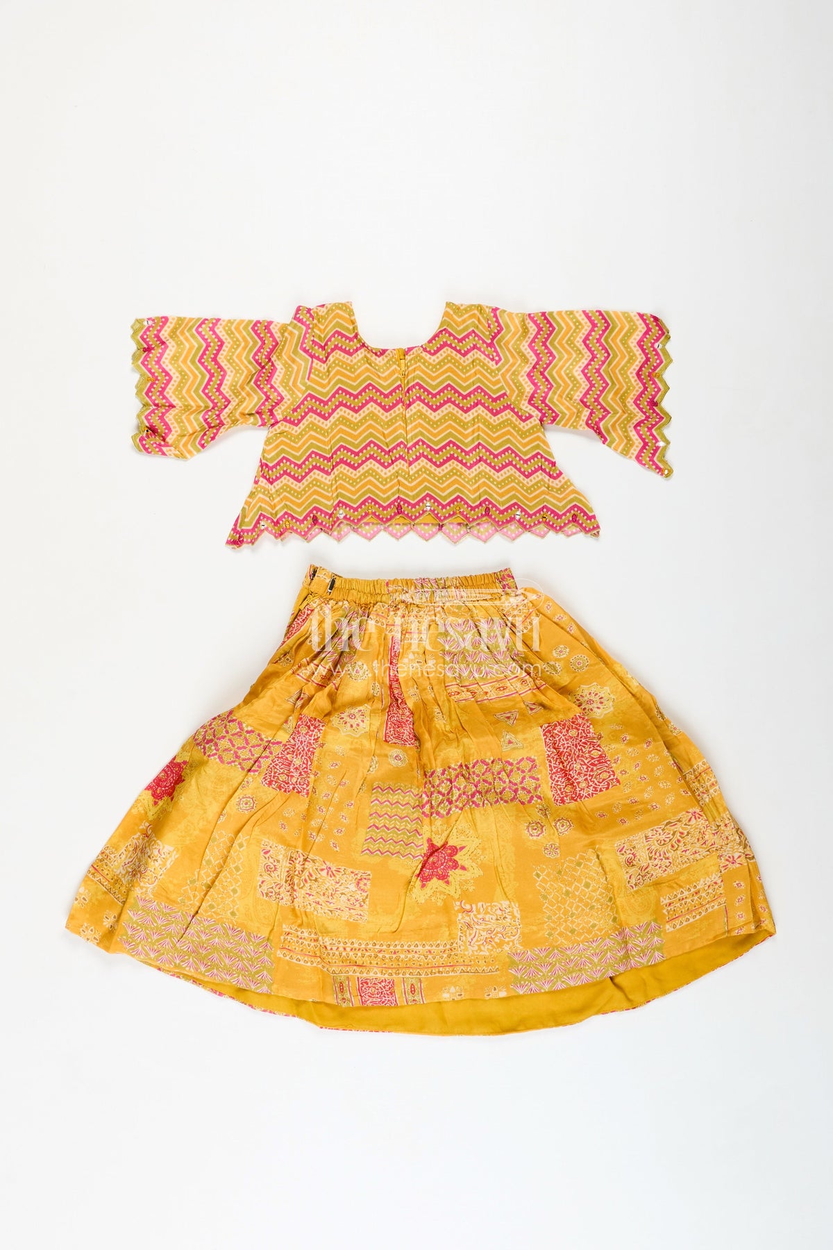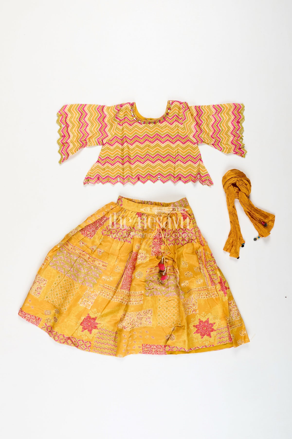 Girls Lehenga for Cultural Events is a vibrant and festive ethnic set perfect for joyous celebrations. Crafted from viscose silk with an all-over digital print, the yellow lehenga features patchwork-style motifs and a gathered flare that allows for free movement and festive twirls. The zigzag printed choli is designed with stylish scalloped sleeves and hem, adding modern flair to the traditional silhouette. Paired with a matching crinkled dupatta, this ensemble captures the richness of Indian textiles while offering lightweight comfort. Whether it’s a temple visit, cultural performance, or festive party, this lehenga set blends color, comfort, and cultural heritage into one stunning outfit.