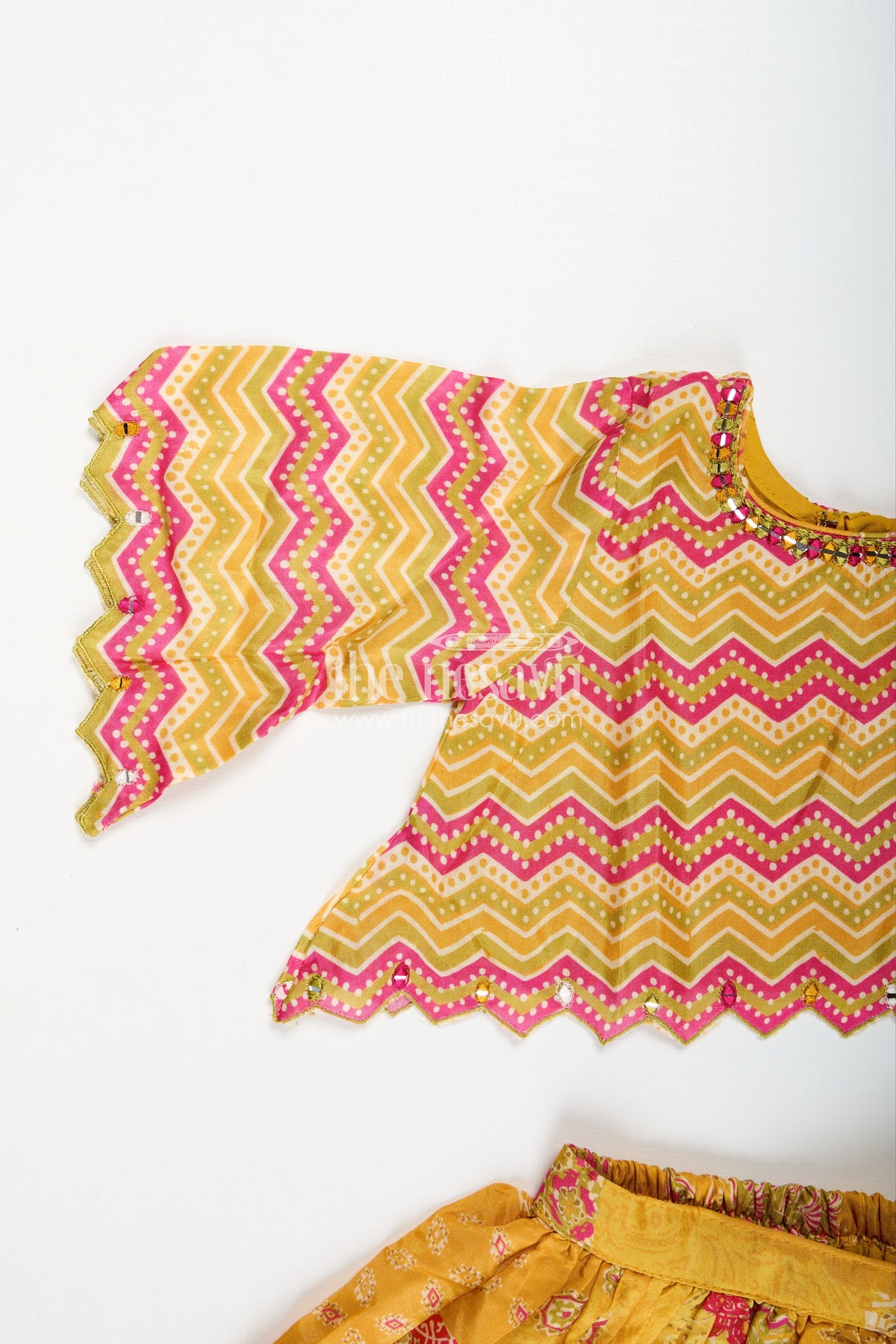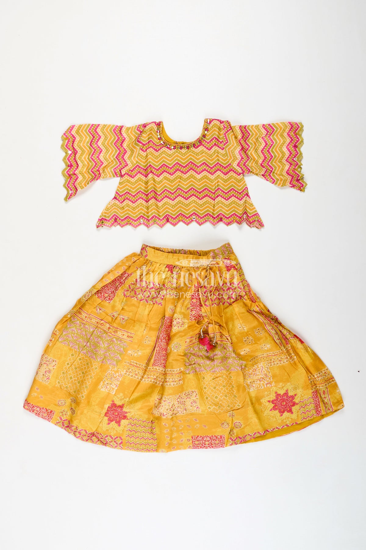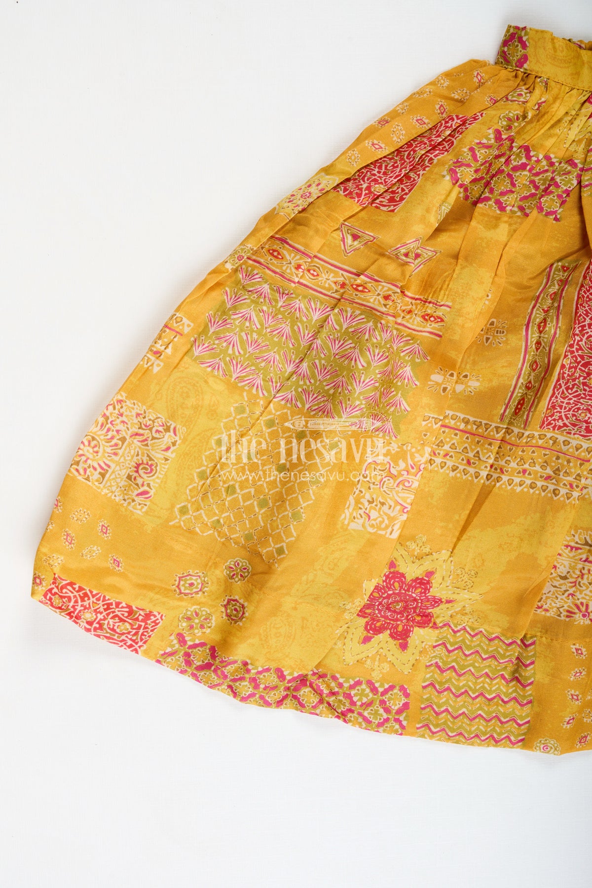 Girls Lehenga for Cultural Events is a vibrant and festive ethnic set perfect for joyous celebrations. Crafted from viscose silk with an all-over digital print, the yellow lehenga features patchwork-style motifs and a gathered flare that allows for free movement and festive twirls. The zigzag printed choli is designed with stylish scalloped sleeves and hem, adding modern flair to the traditional silhouette. Paired with a matching crinkled dupatta, this ensemble captures the richness of Indian textiles while offering lightweight comfort. Whether it’s a temple visit, cultural performance, or festive party, this lehenga set blends color, comfort, and cultural heritage into one stunning outfit.