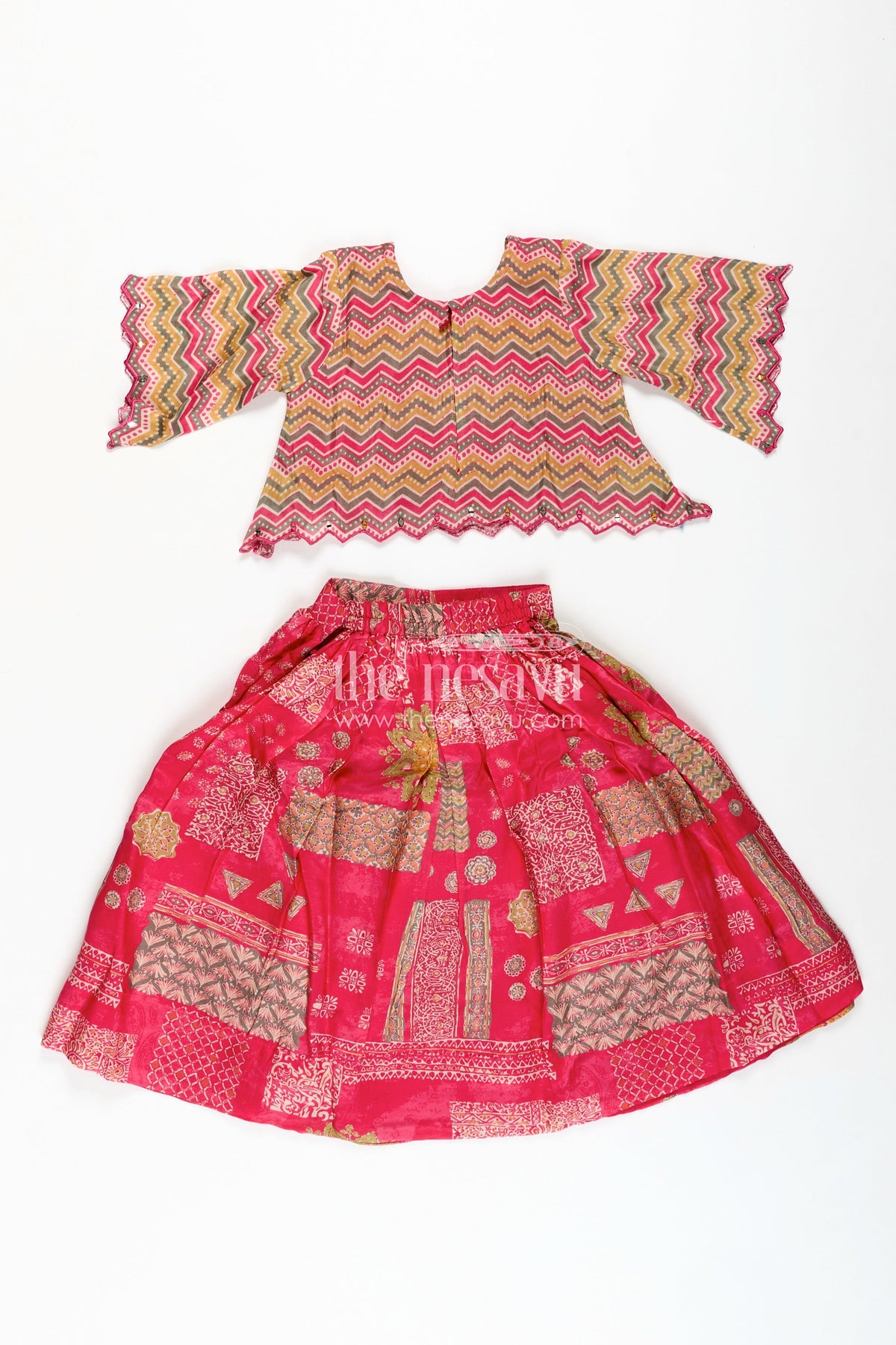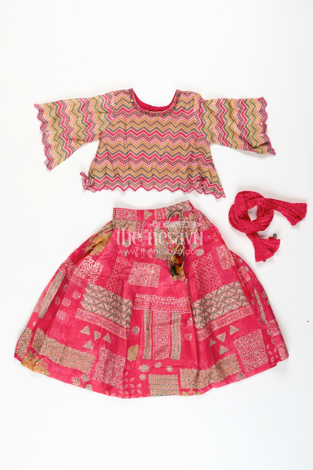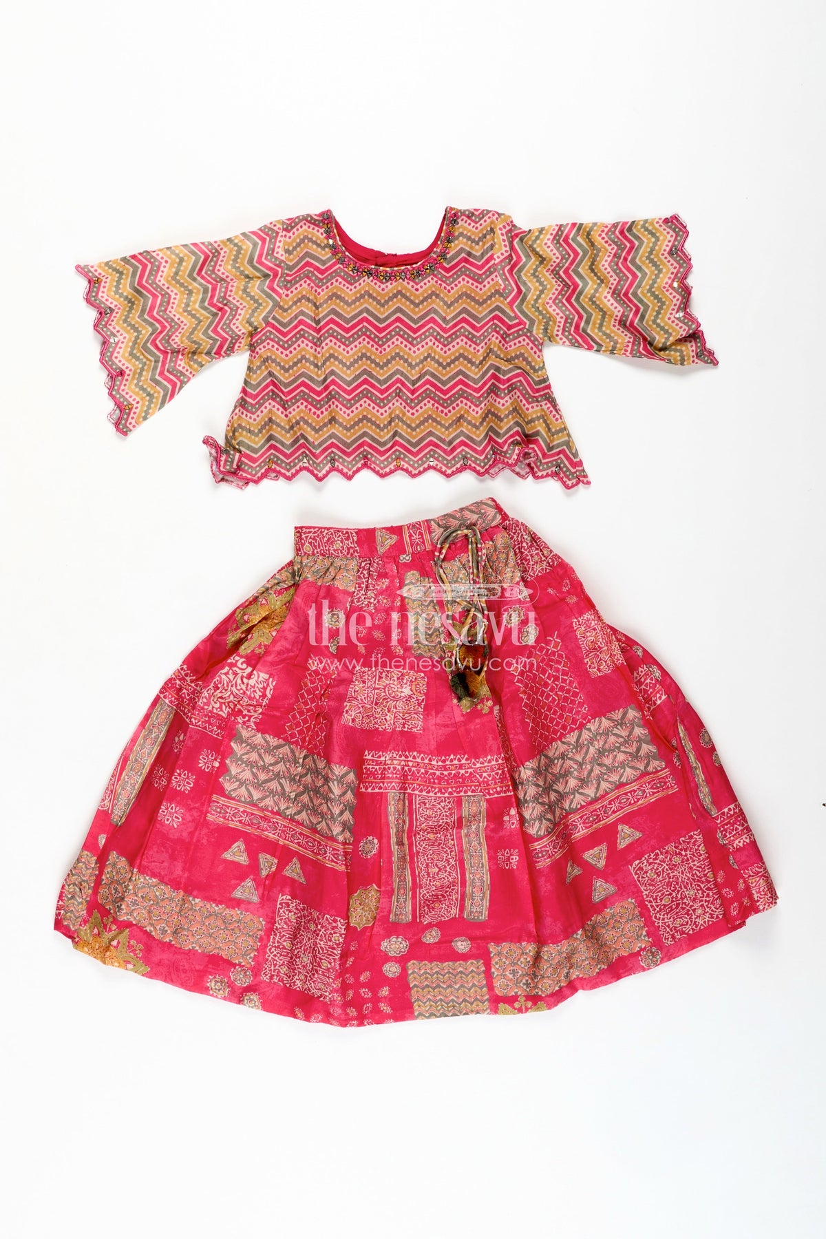 Girls Lehenga for Festivals is a joyful celebration of tradition and trend, designed for little ones to shine in festive settings. This rich pink lehenga set is made from soft viscose silk and adorned with intricate digital prints that reflect traditional Indian artistry. The blouse stands out with its multi-colored zigzag pattern and stylish scalloped edges on the sleeves and hem, while the coordinating dupatta adds elegance to the ensemble. Ideal for Navratri, Diwali, or any cultural gathering, this outfit provides comfort and festive spirit in equal measure. The breathable fabric and roomy design ensure your child stays comfortable while looking absolutely radiant.