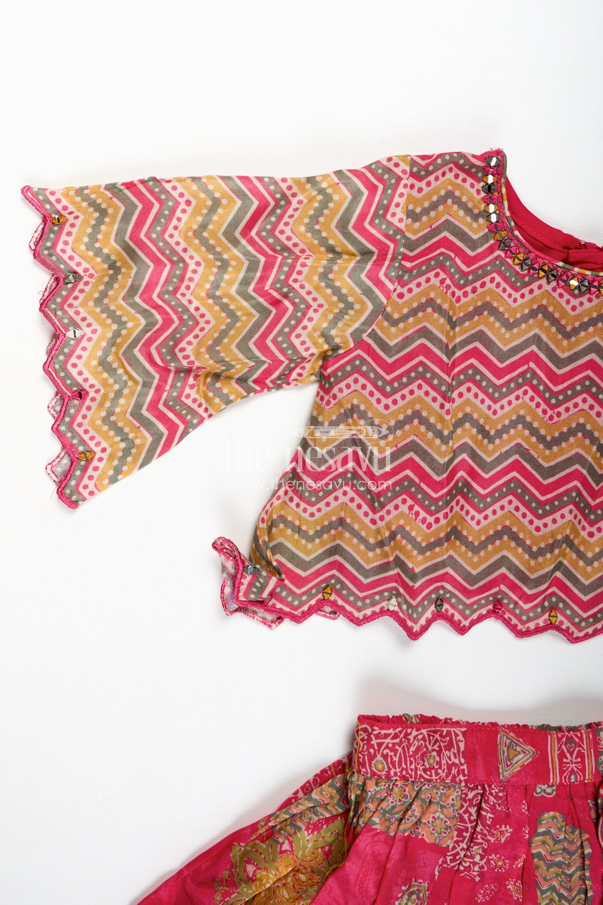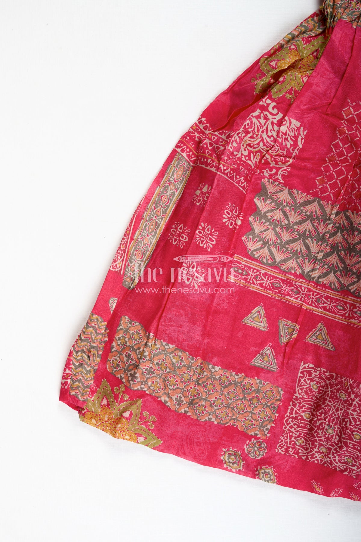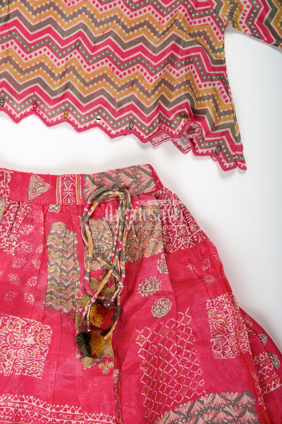 Girls Lehenga for Festivals is a joyful celebration of tradition and trend, designed for little ones to shine in festive settings. This rich pink lehenga set is made from soft viscose silk and adorned with intricate digital prints that reflect traditional Indian artistry. The blouse stands out with its multi-colored zigzag pattern and stylish scalloped edges on the sleeves and hem, while the coordinating dupatta adds elegance to the ensemble. Ideal for Navratri, Diwali, or any cultural gathering, this outfit provides comfort and festive spirit in equal measure. The breathable fabric and roomy design ensure your child stays comfortable while looking absolutely radiant.