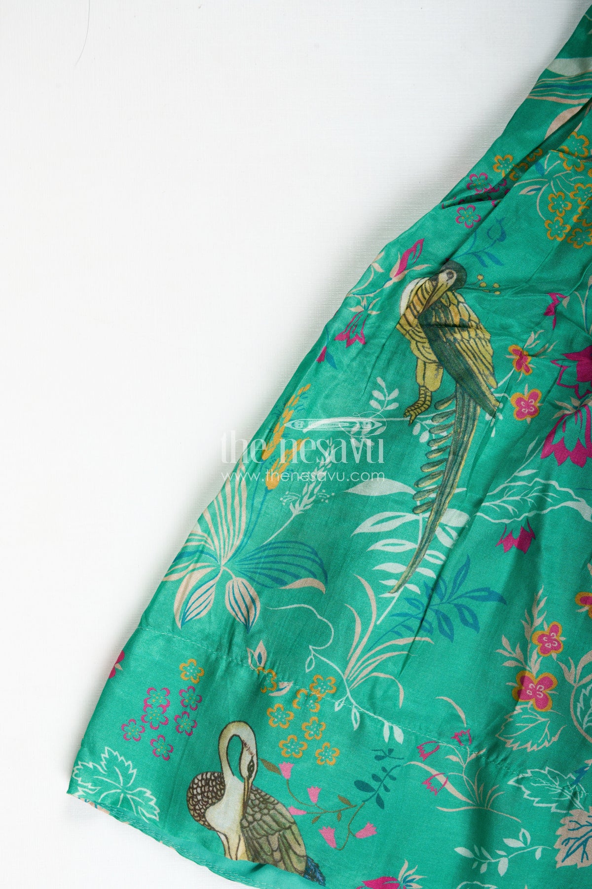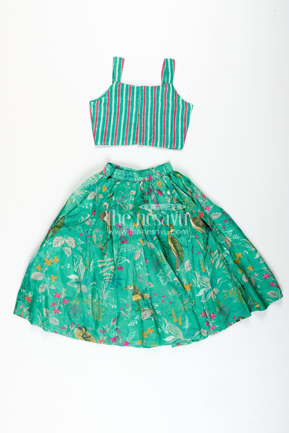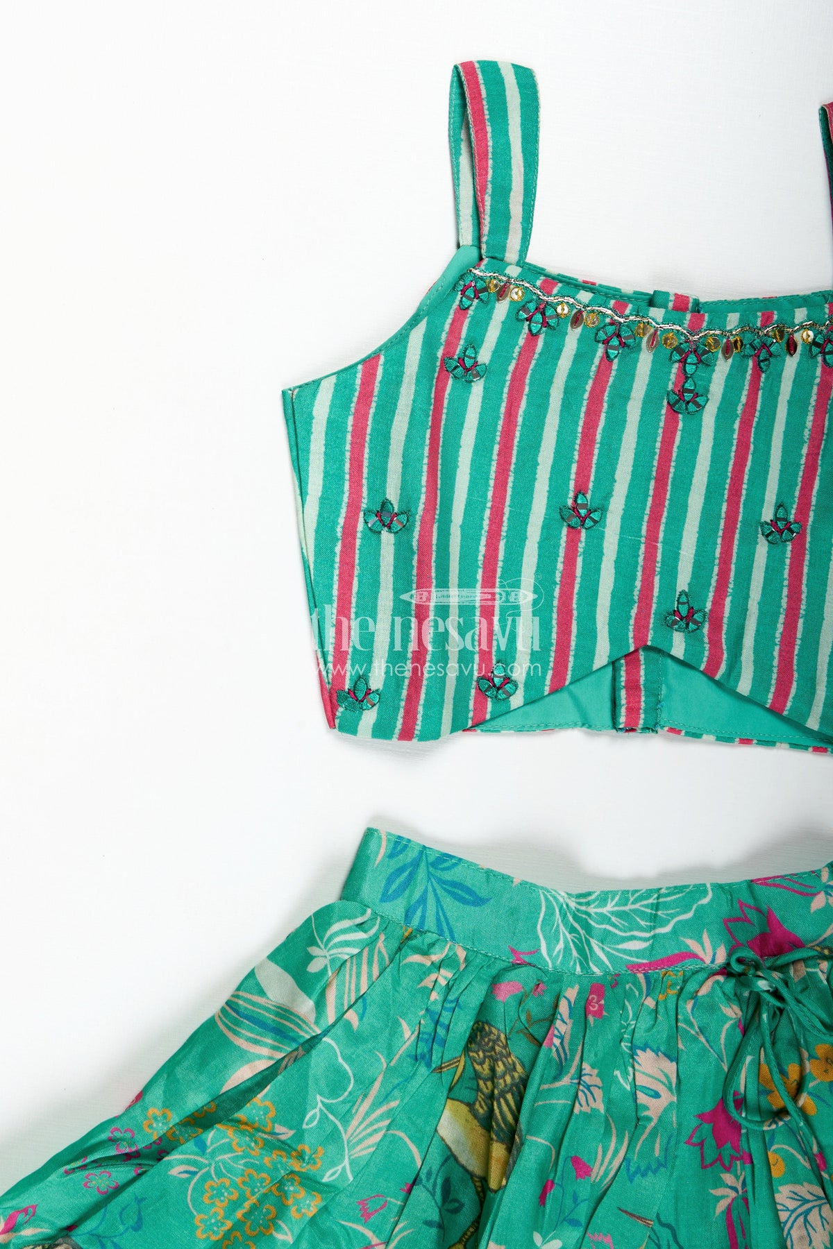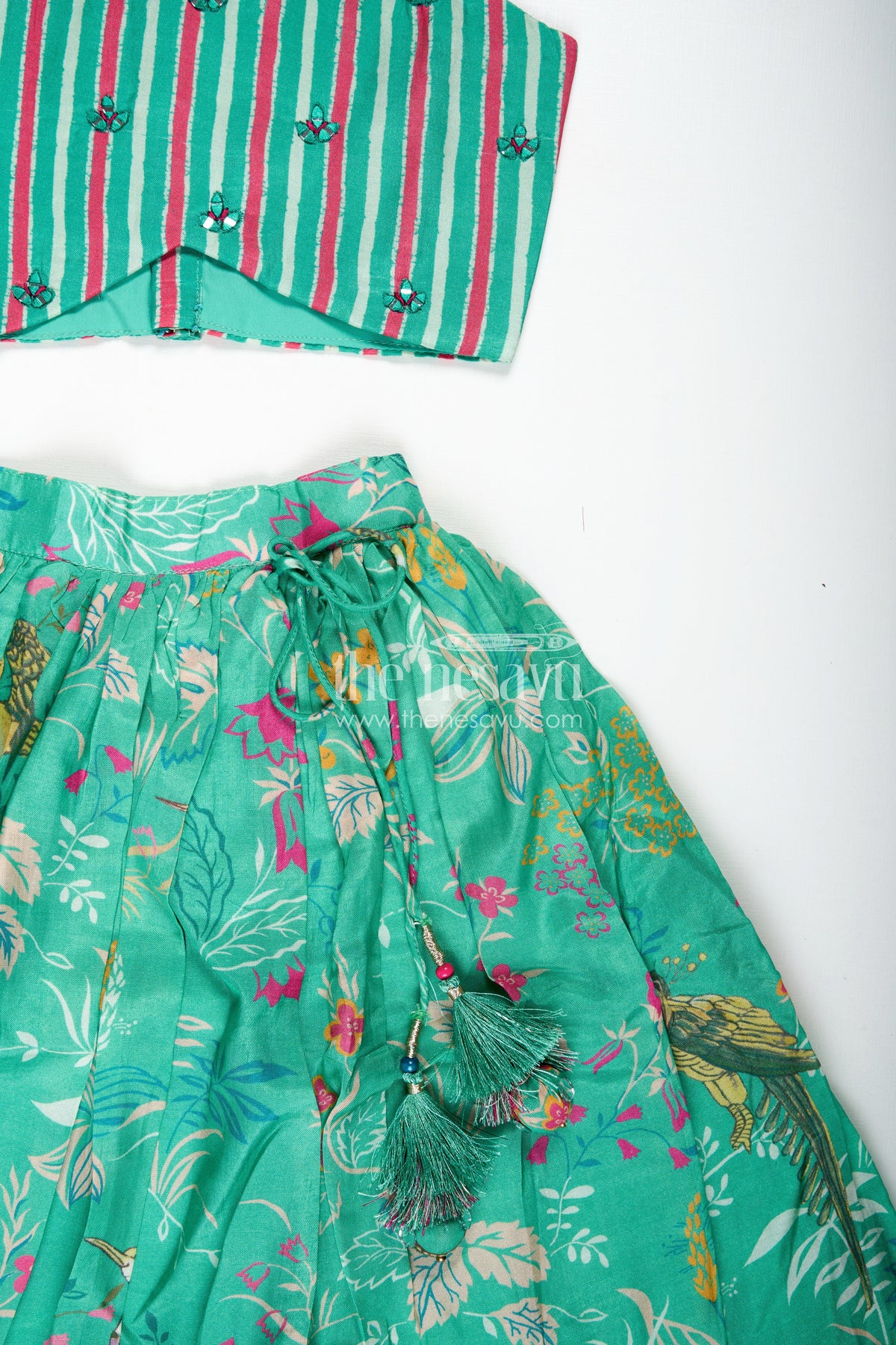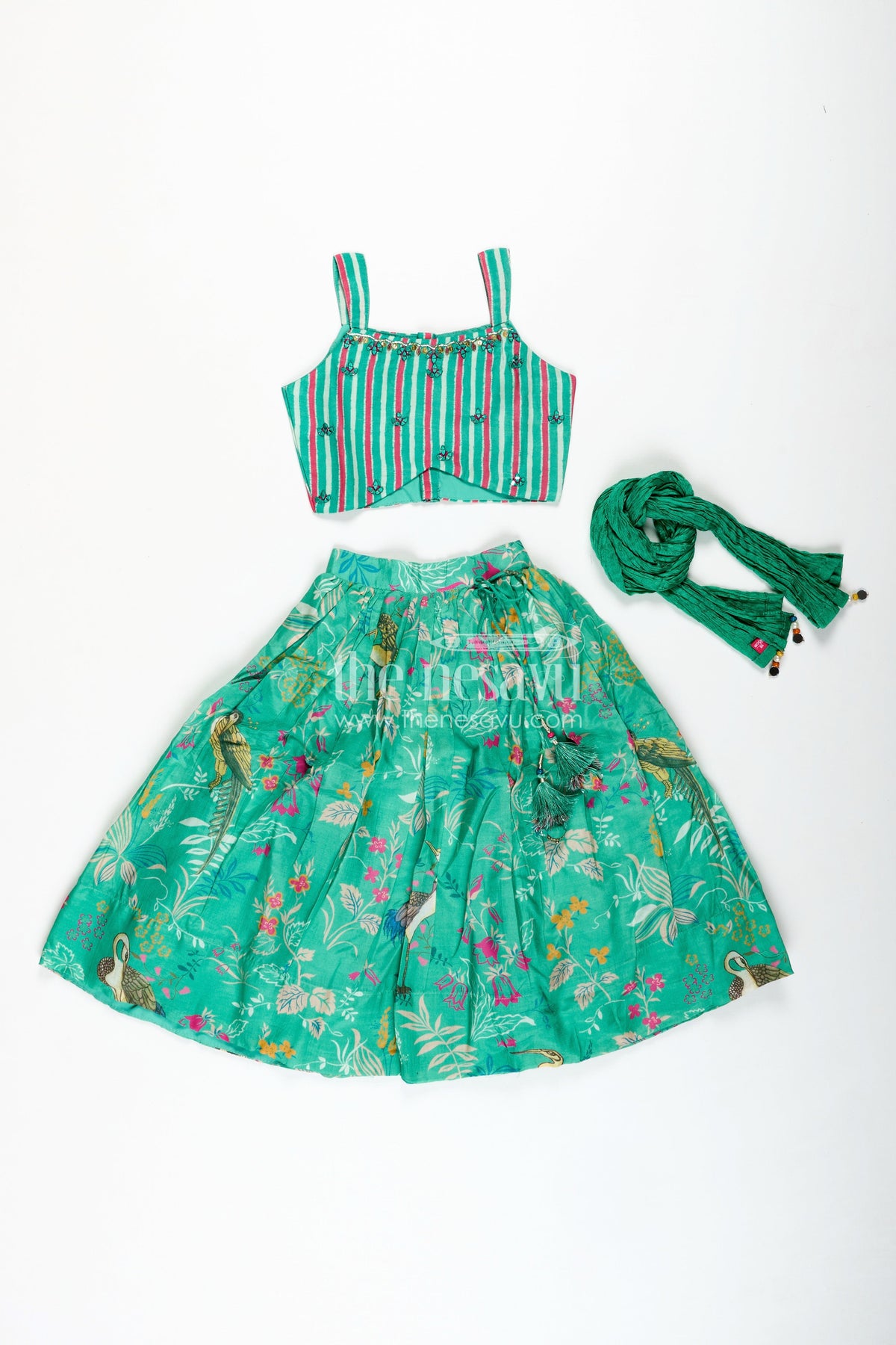 Girls Lehenga Set with Blouse is a vibrant ethnic ensemble that brings together playful charm and festive flair. The lehenga, crafted in rich green viscose silk, showcases detailed digital prints of birds and foliage, adding a nature-inspired elegance to the look. Paired with a sleeveless striped blouse embellished with mirror work along the neckline, this set strikes a perfect balance between tradition and trend. A matching green crinkled dupatta completes the outfit, enhancing the overall ethnic appeal. Designed for comfort and visual impact, the soft fabric ensures easy movement, while the gathered lehenga adds a dramatic flare. Ideal for family functions, cultural performances, or festive celebrations, this set lets your little one shine in style.