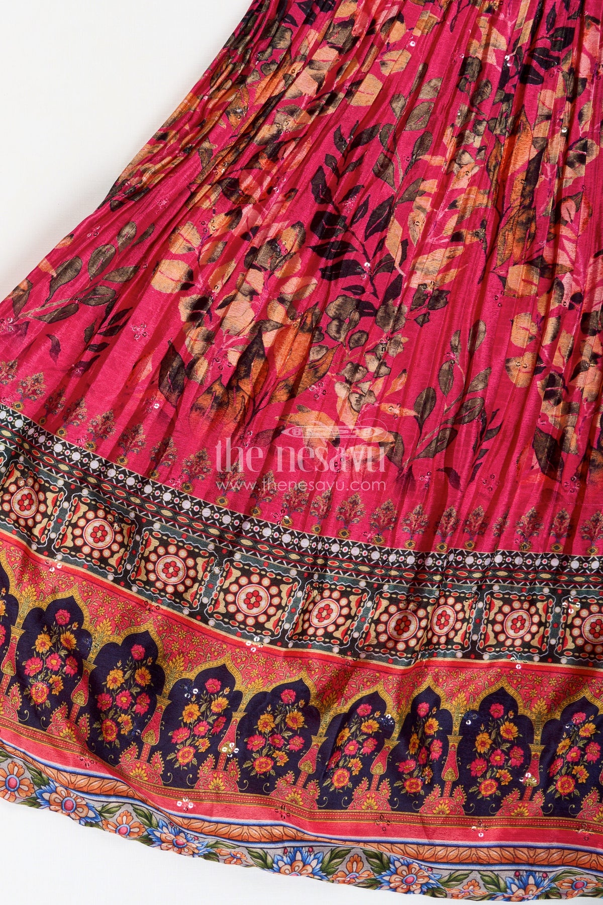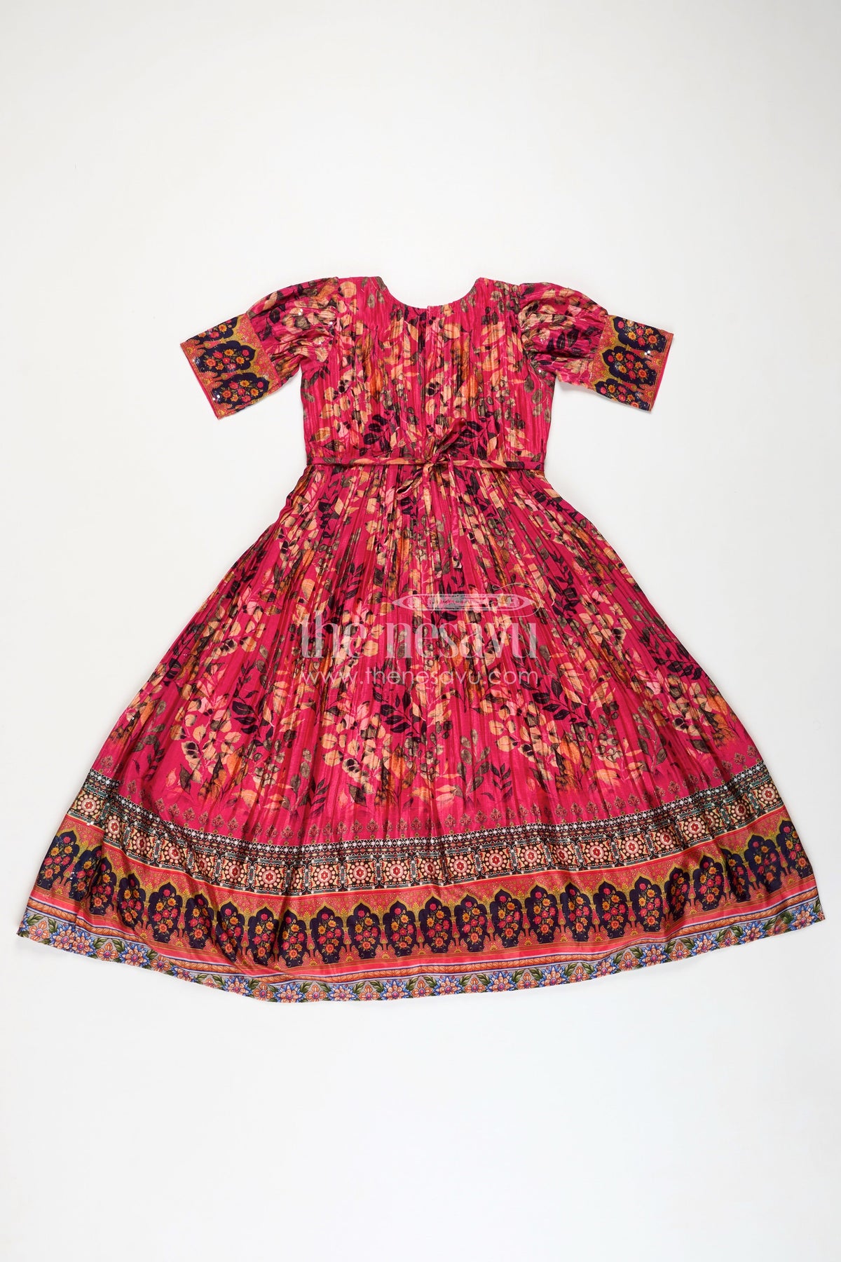 anarkali gown dress gains a vibrant twist with this beautifully printed pink Chinon gown for girls. Designed to make a statement, it features a rich digital print with floral and paisley motifs and a flattering flared silhouette that’s both playful and elegant. The bodice is adorned with mirror work-like embellishments and a shaped yoke, giving it an elevated traditional aesthetic. Puff sleeves with ornate cuff prints add regal flair, making it suitable for festive occasions or family functions. The Chinon fabric is known for its soft drape and gentle feel, ensuring your child stays comfortable while looking effortlessly stylish.