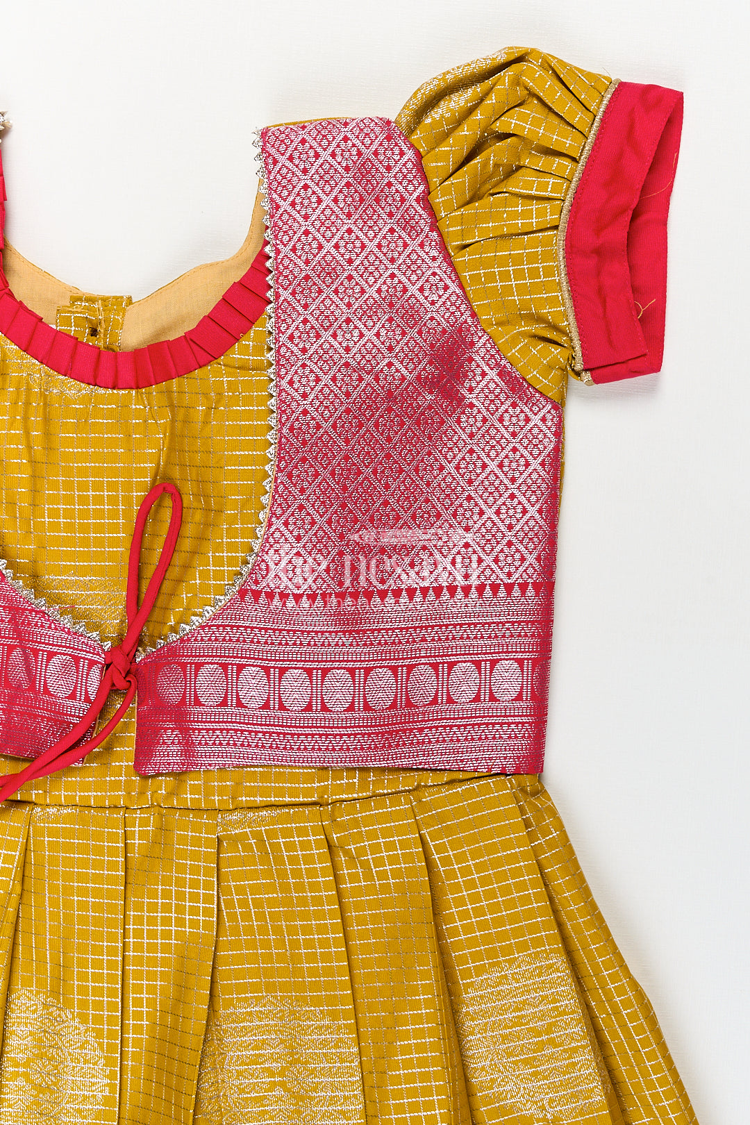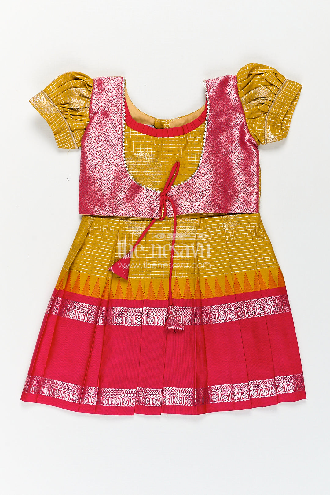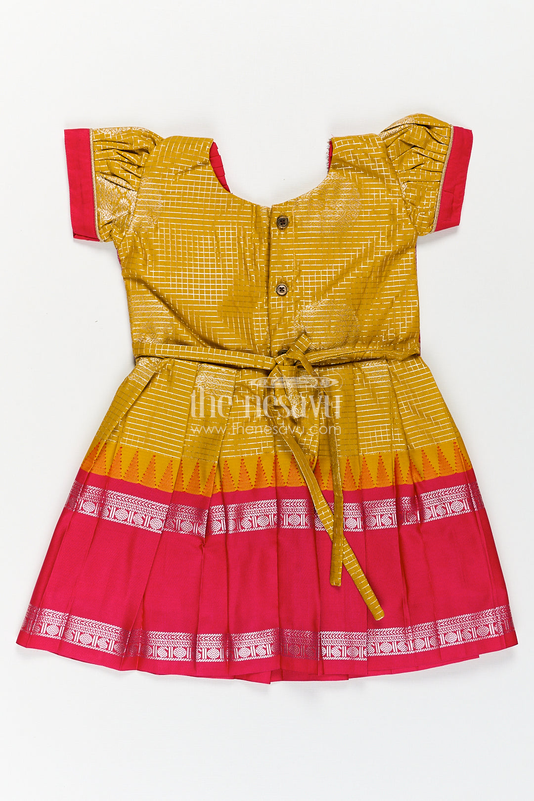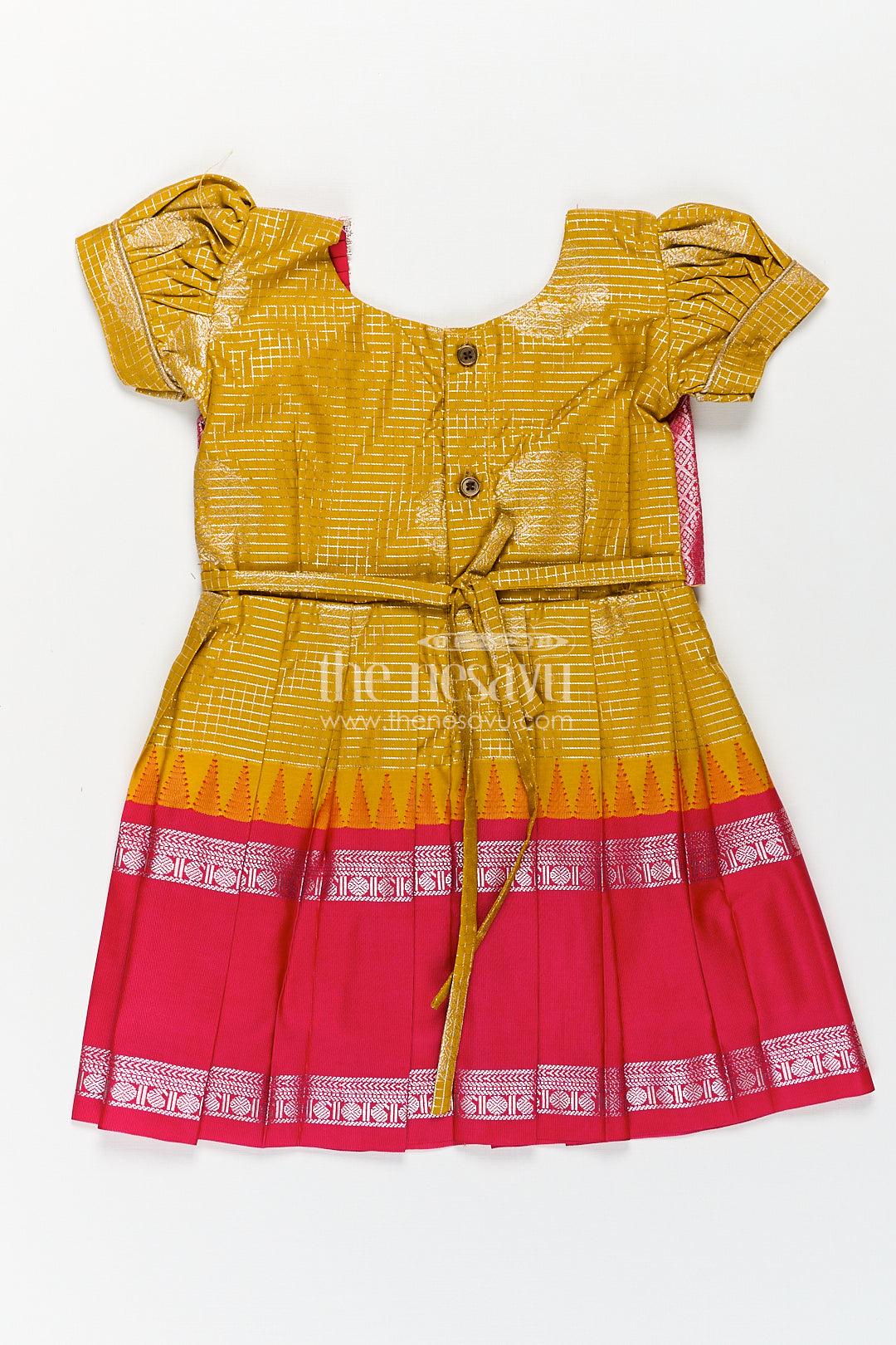 The Nesavu Silk Frock Girls Raw Silk Short Frocks in Semi Kanchivaram with Traditional Pink and Mustard Zari Border and Puff Sleeves Nesavu 14 (6M) / Yellow / Style 2 SF857AB-14 Nesavu Traditional Girls Raw Silk Short Frocks Semi Kanchivaram Pink Zari Border Mustard Base