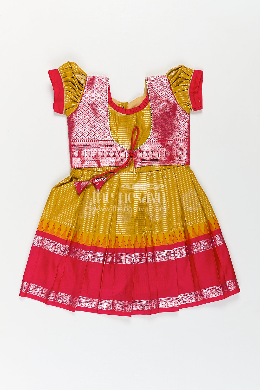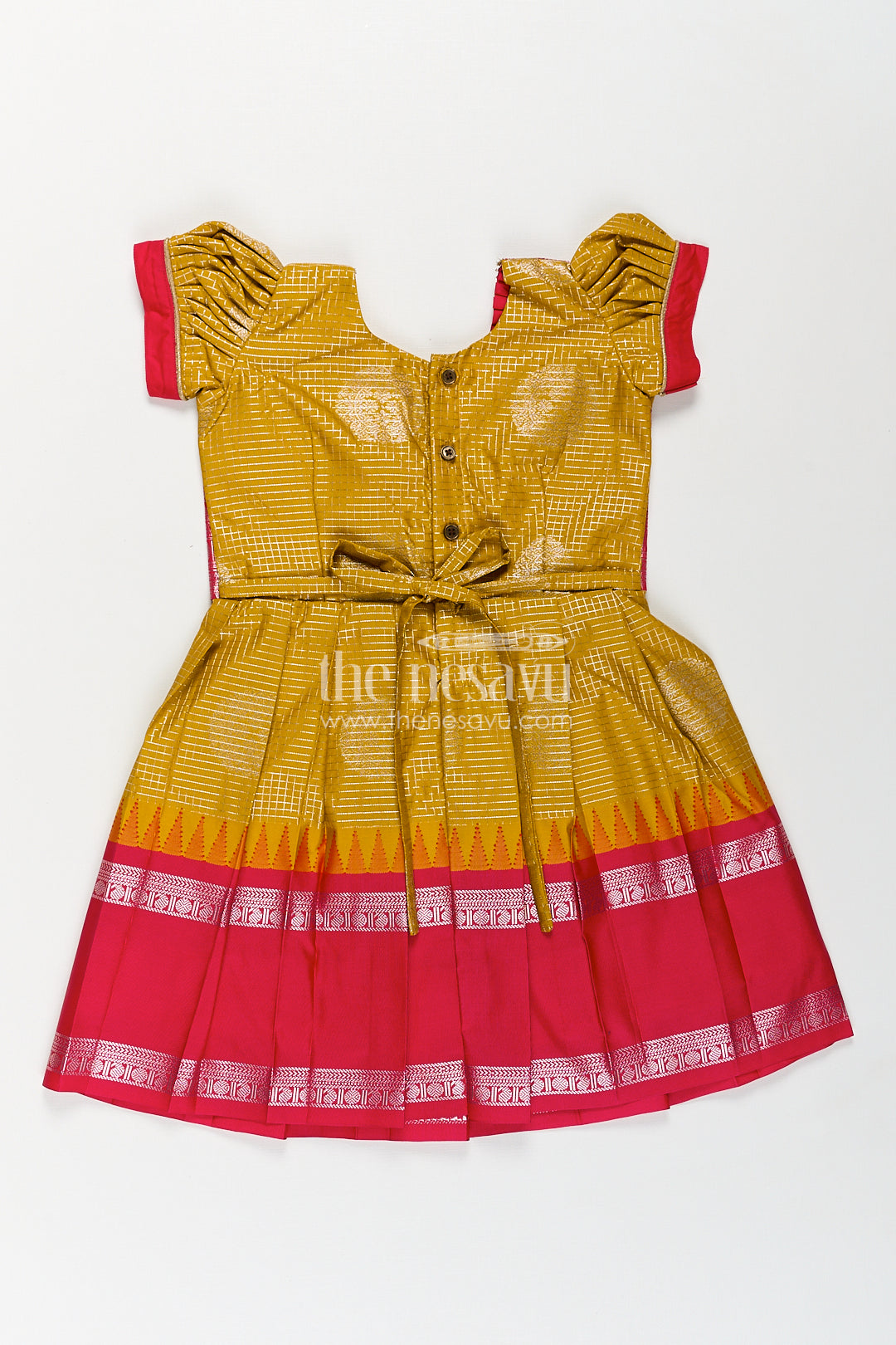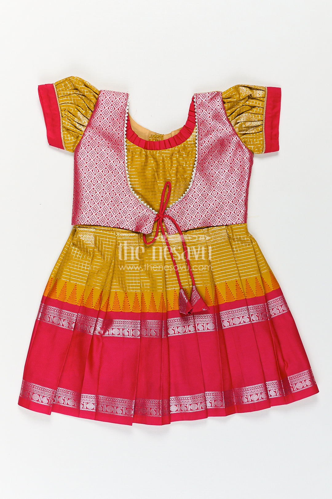 The Nesavu Silk Frock Girls Raw Silk Short Frocks in Semi Kanchivaram with Traditional Pink and Mustard Zari Border and Puff Sleeves Nesavu Nesavu Traditional Girls Raw Silk Short Frocks Semi Kanchivaram Pink Zari Border Mustard Base