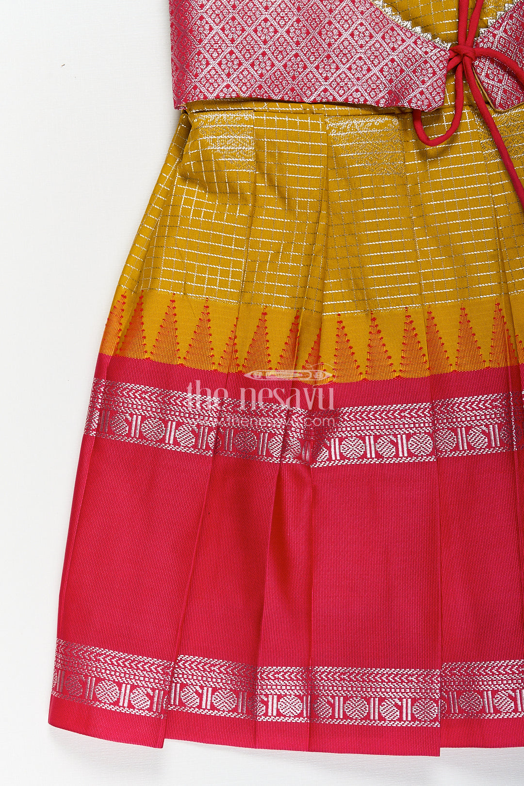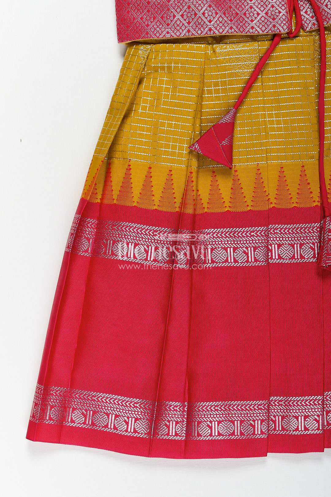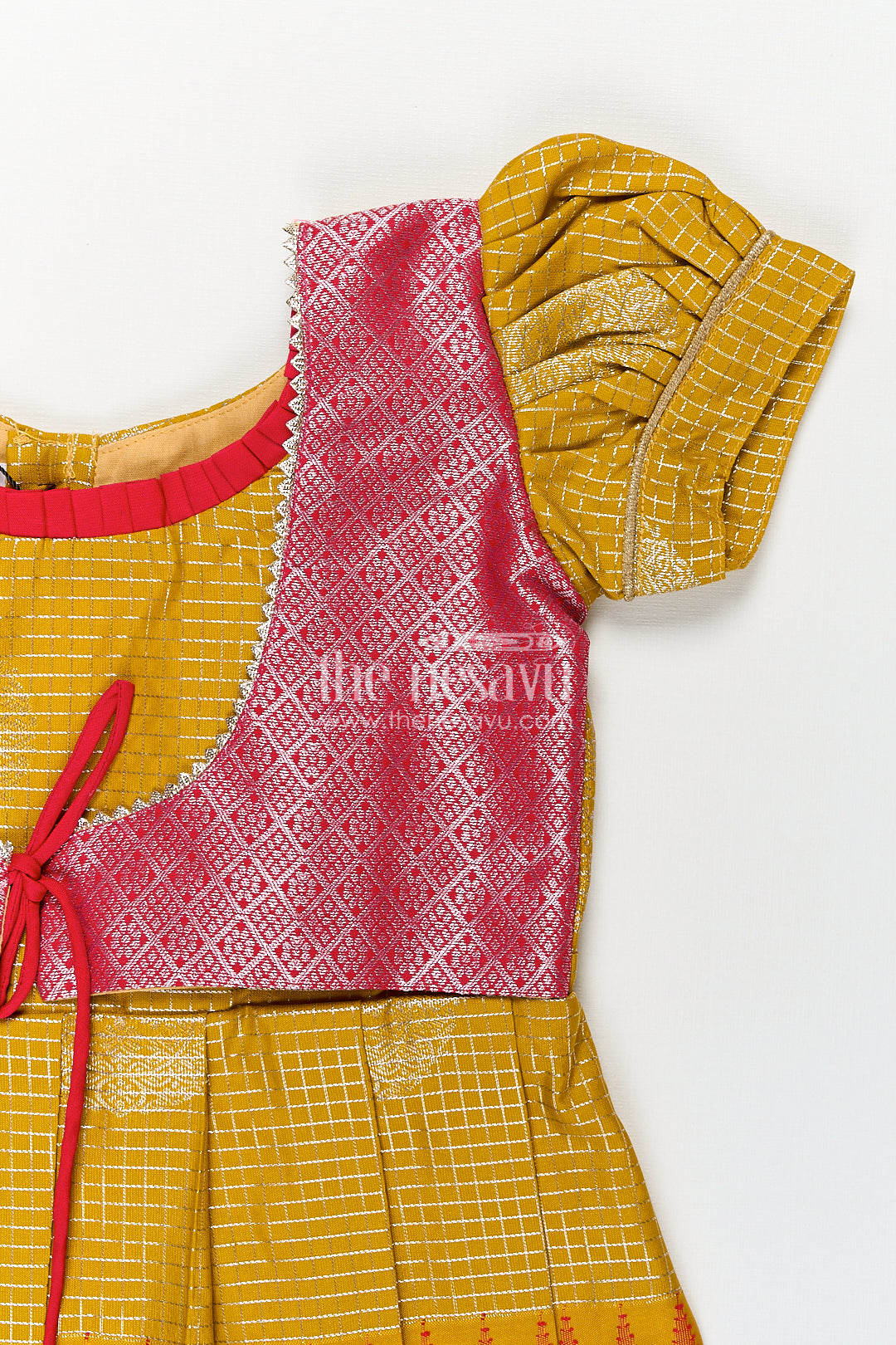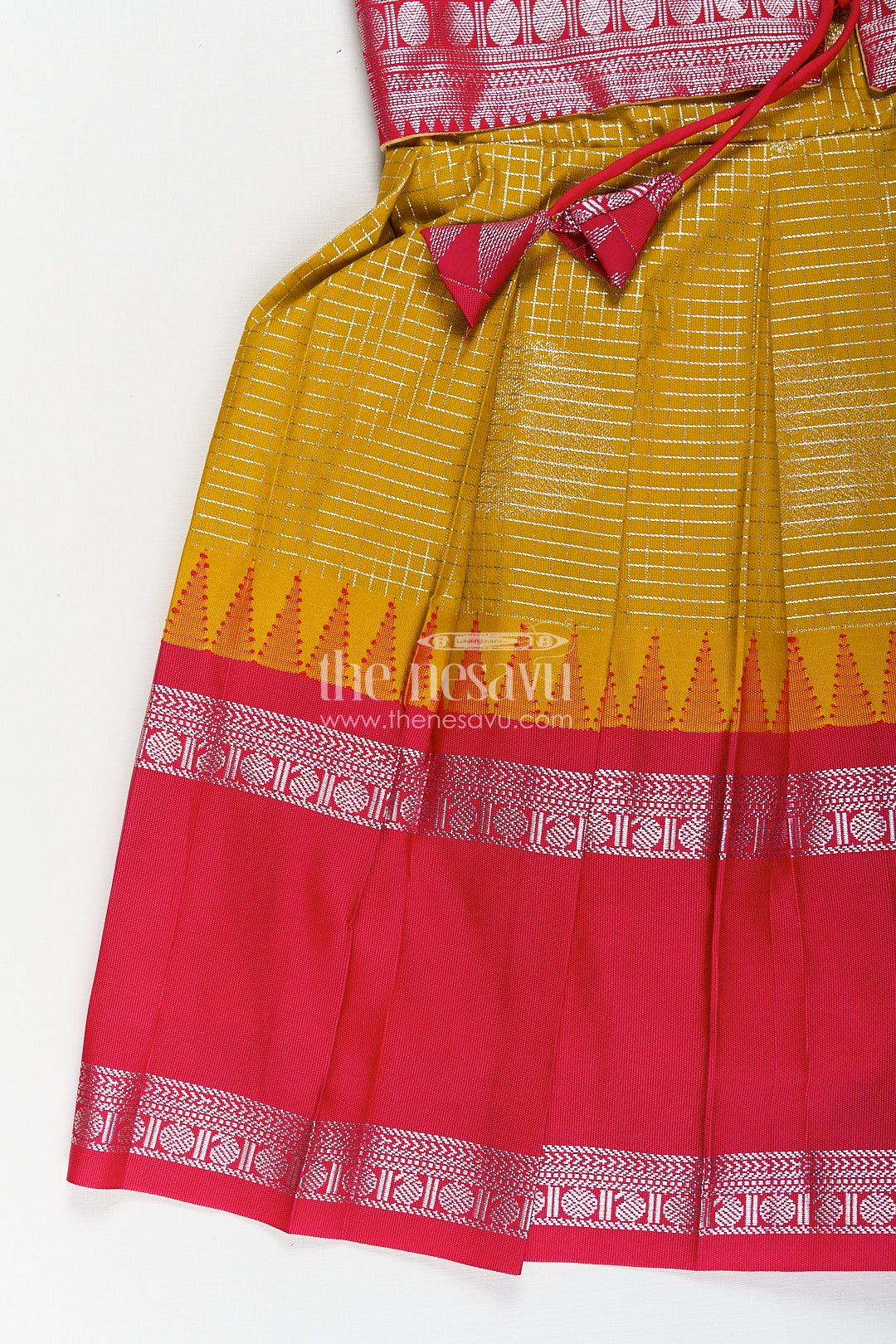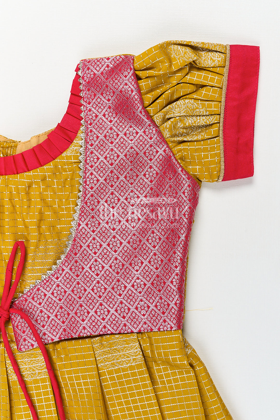 Raw silk short frocks come alive in this vibrant girls semi Kanchivaram piece that perfectly captures traditional aesthetics with a playful flair. Designed with a mustard yellow base featuring golden zari circular motifs, the frock is finished with a rich pink pleated skirt adorned in intricate temple border patterns. The contrasting pink brocade yoke with delicate lace trim and mock tie-up adds a layer of sophistication. The puffed sleeves in matching mustard complete the ethnic look, ensuring this frock stands out in any festive or family setting. Crafted from semi Kanchivaram silk, the fabric is soft yet structured, providing both comfort and elegance. This short frock allows easy movement, making it ideal for young girls to enjoy their day without fuss. Whether it's for a traditional occasion or a cultural celebration, this dress ensures your child shines with grace and ease.